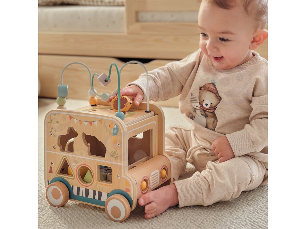- - Malé motorické zručnosti - posúvanie korálok po slučke, otáčanie koliesok a manipulácia s malými blokmi posilňuje presnosť prstov a svaly rúk