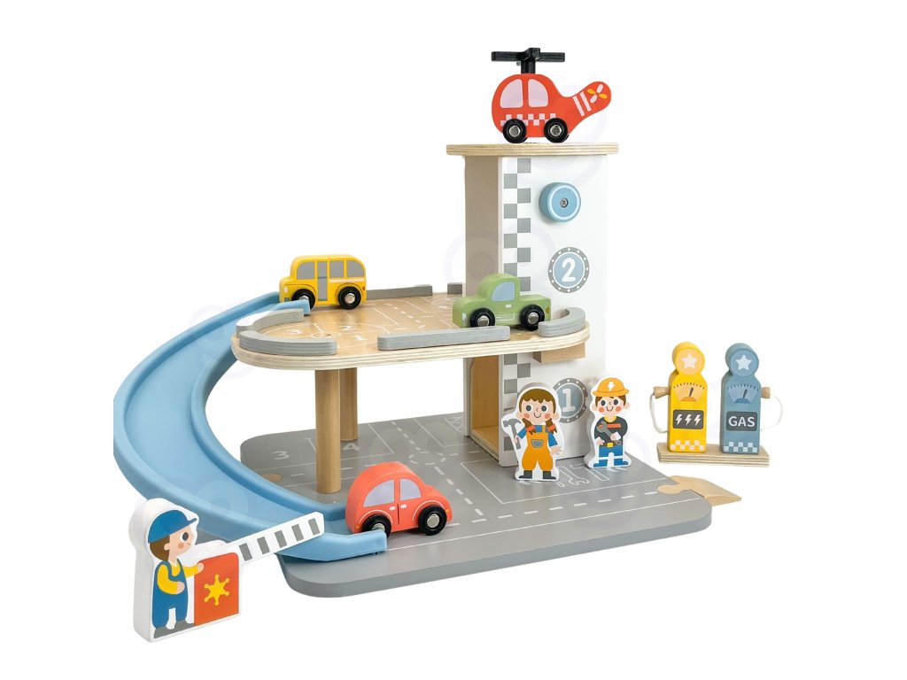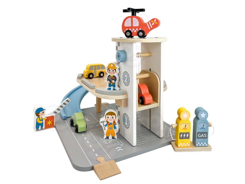 - - Motorické zručnosti - Presné manévrovanie s malými drevenými vozidlami na rampách, šmýkačkách a parkovacích miestach zlepšuje koordináciu rúk a očí a zručnosť prstov. Umiestňovanie postavičiek, manipulácia s prvkami čerpacej stanice a pohyb vrtuľníka si vyžaduje kontrolované a presné pohyby rúk.