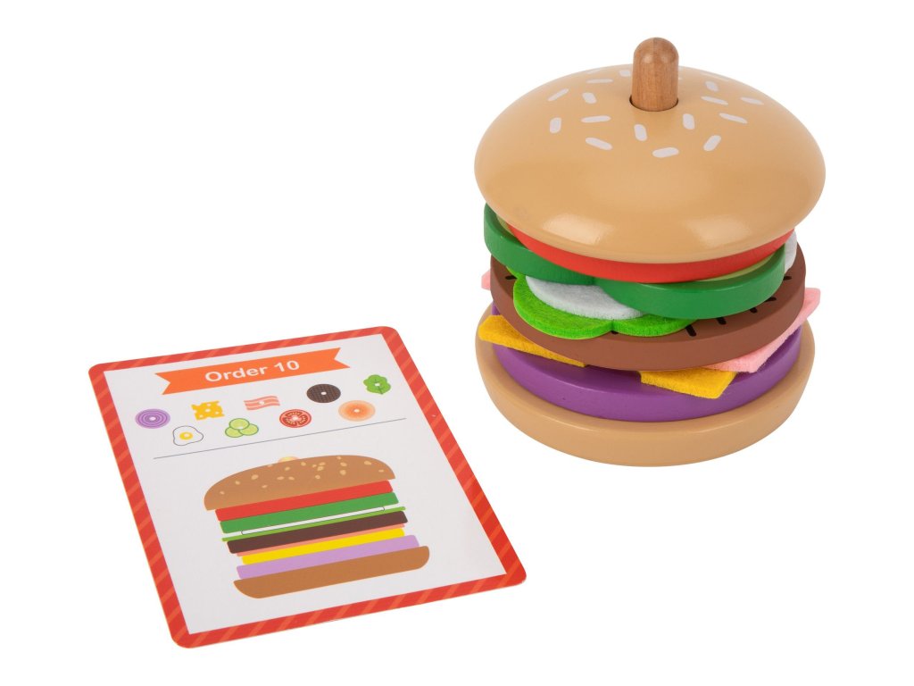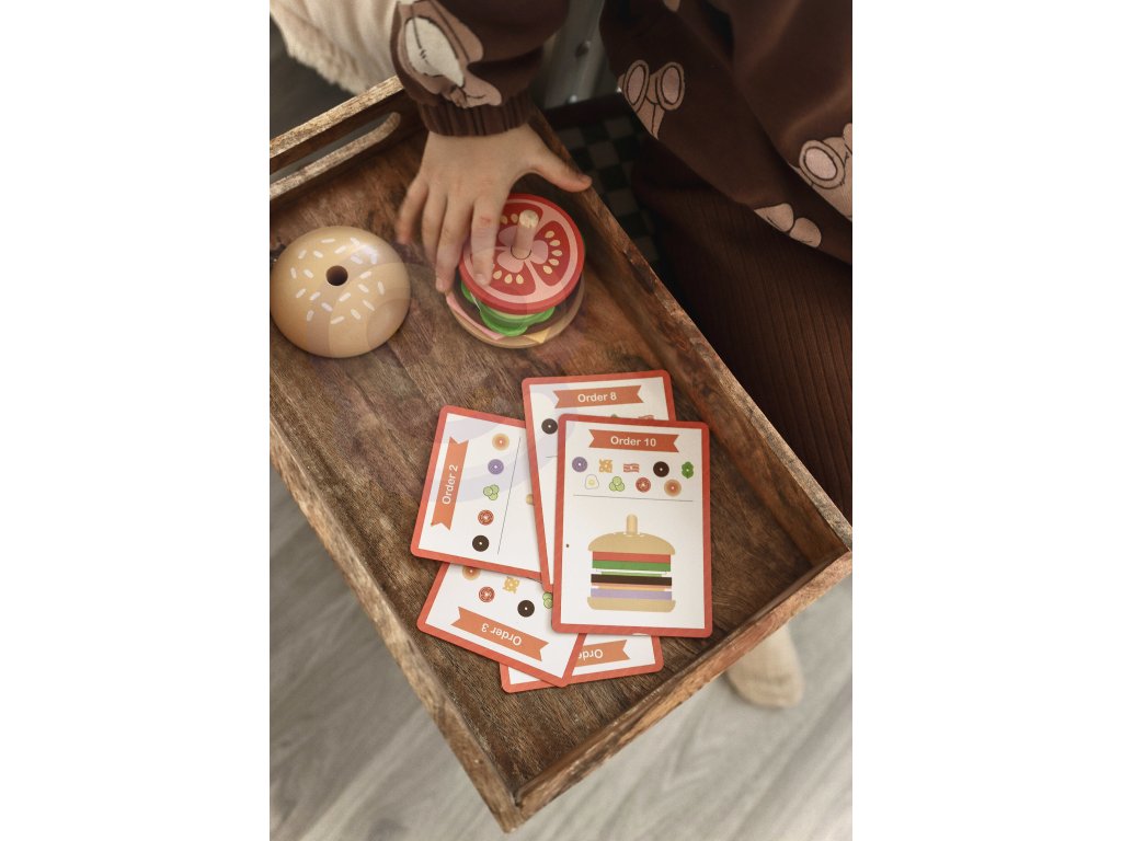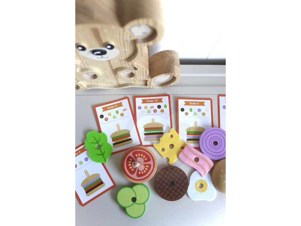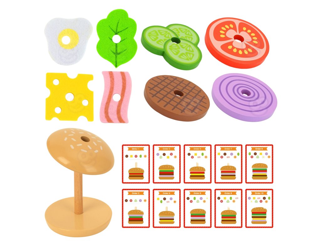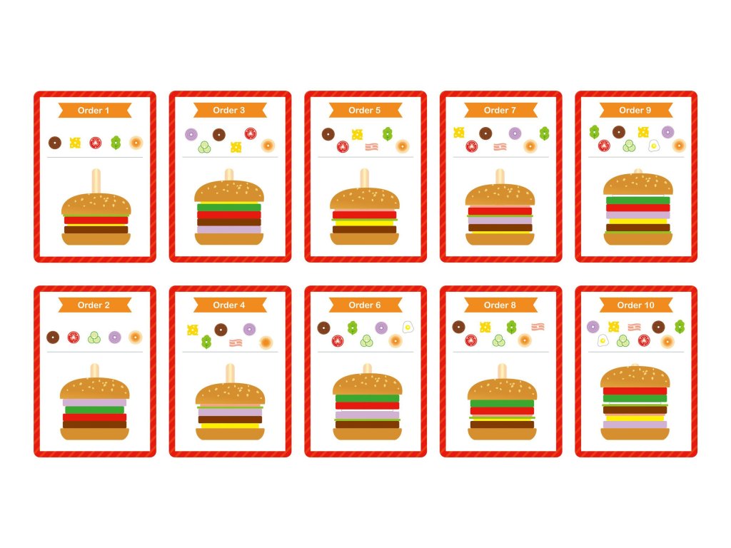 Dieťavyberá potrebnézložkya potom sa pozriete nahrúbka ifarba zoradí ingrediencie v správnom poradí. Hru je možné rozšíriť o hruzapamätanie si iprehrávanie z pamäti obrázku batoľaťa. Môžete tiežkryt na karte zložieka dieťa môže vybrať potrebné ingrediencie a zostaviť hamburger len na základe jeho vzhľadu. Dieťa si môže vymyslieť aj vlastný vzhľad hamburgeru - obmedzené je lenkreativita ipredstavivosť