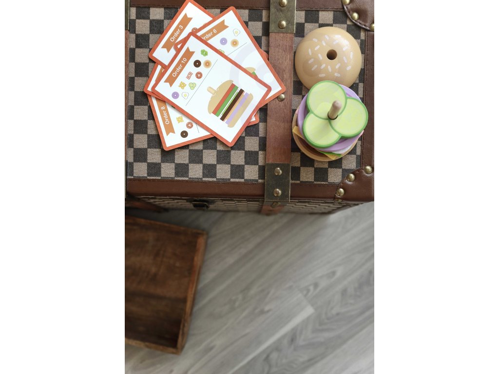 - - súprava obsahuje 15 prvkov: 2 žemle, 8 ingrediencií na hamburgery, 5 kariet s 10 vzormi