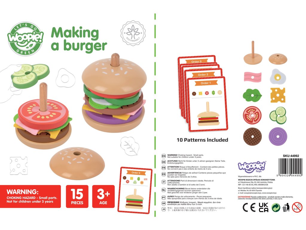 WOOPIE GREEN Drevená skladačka reštaurácie Burger pre deti 15 ks Certifikát FSC