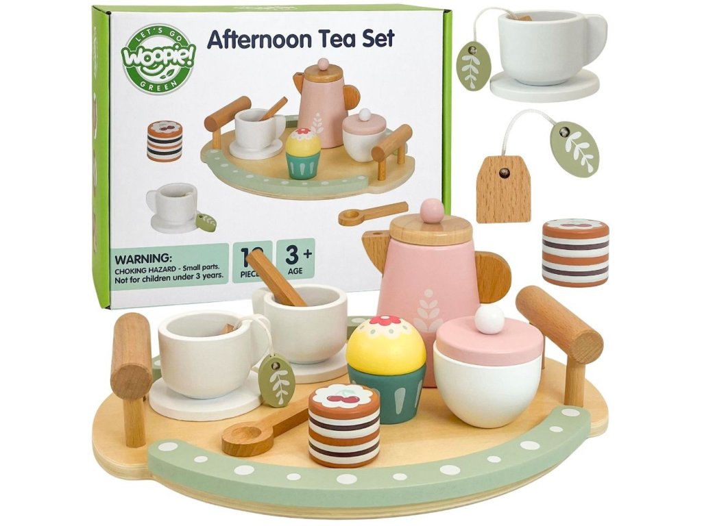 Doprajte si popoludňajší čaj! Táto očarujúca drevená čajová súprava odWoopie Green je skutočným skvostom medzi hračkami na hranie rolí. Vďaka pastelovým farbám v odtieňoch púdrovej ružovej, jemnej zelenej a prírodného dreva sa každé hranie premení na elegantný čajový obrad. Vaše dieťa môže prevziať úlohu hostiteľa a servírovať svojim hosťom - rodičom, súrodencom alebo obľúbeným plyšovým medvedíkom - voňavý čaj z čajníka s krásnym lístkom, lahodné koláčiky a znamenité torty. Táto súprava je vyrobená z vysokokvalitného dreva s bezpečnými, netoxickými povrchovými úpravami a zaručuje dlhotrvajúcu nápaditú hru.