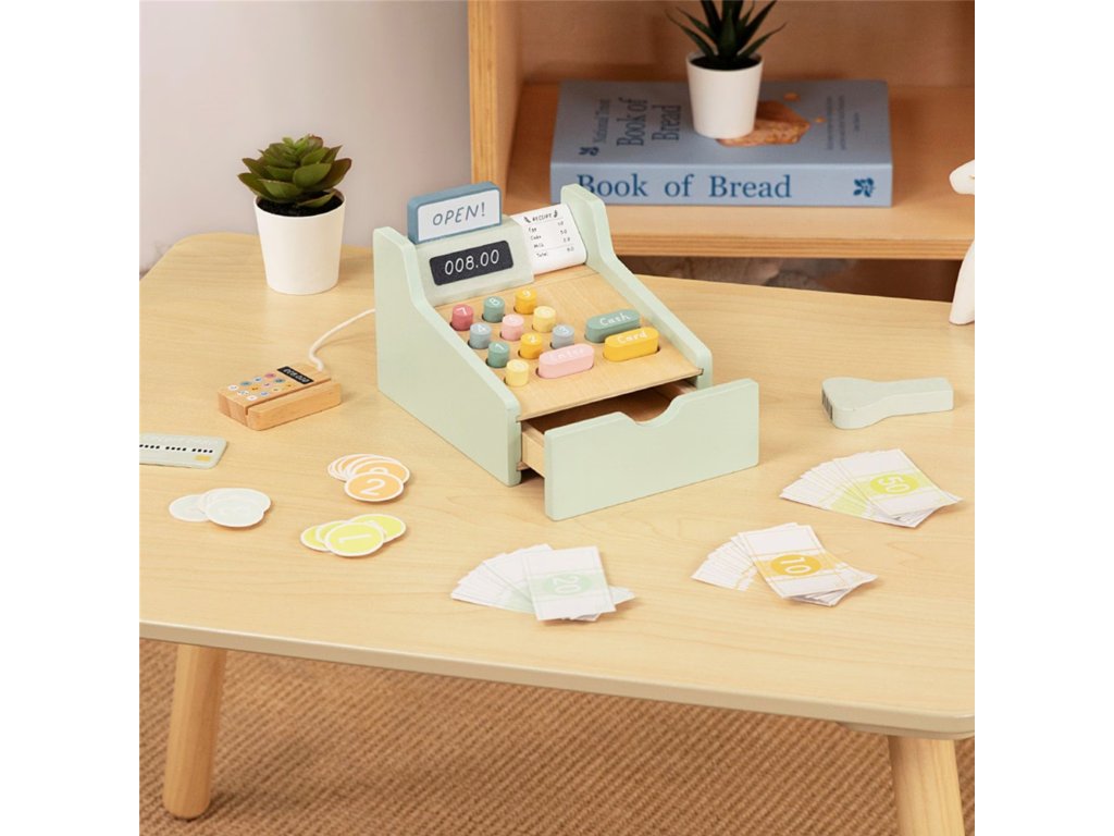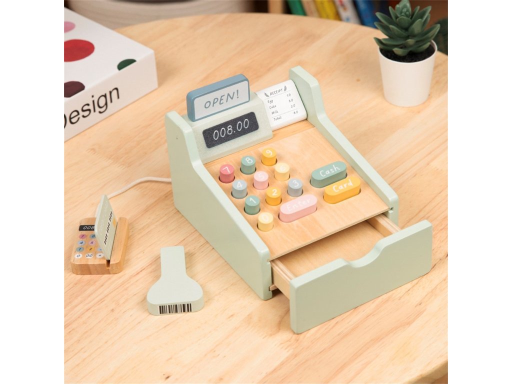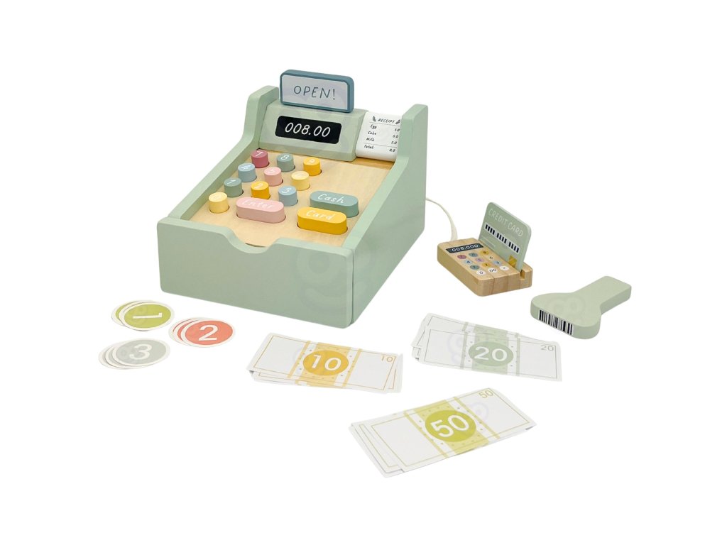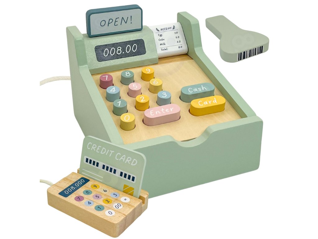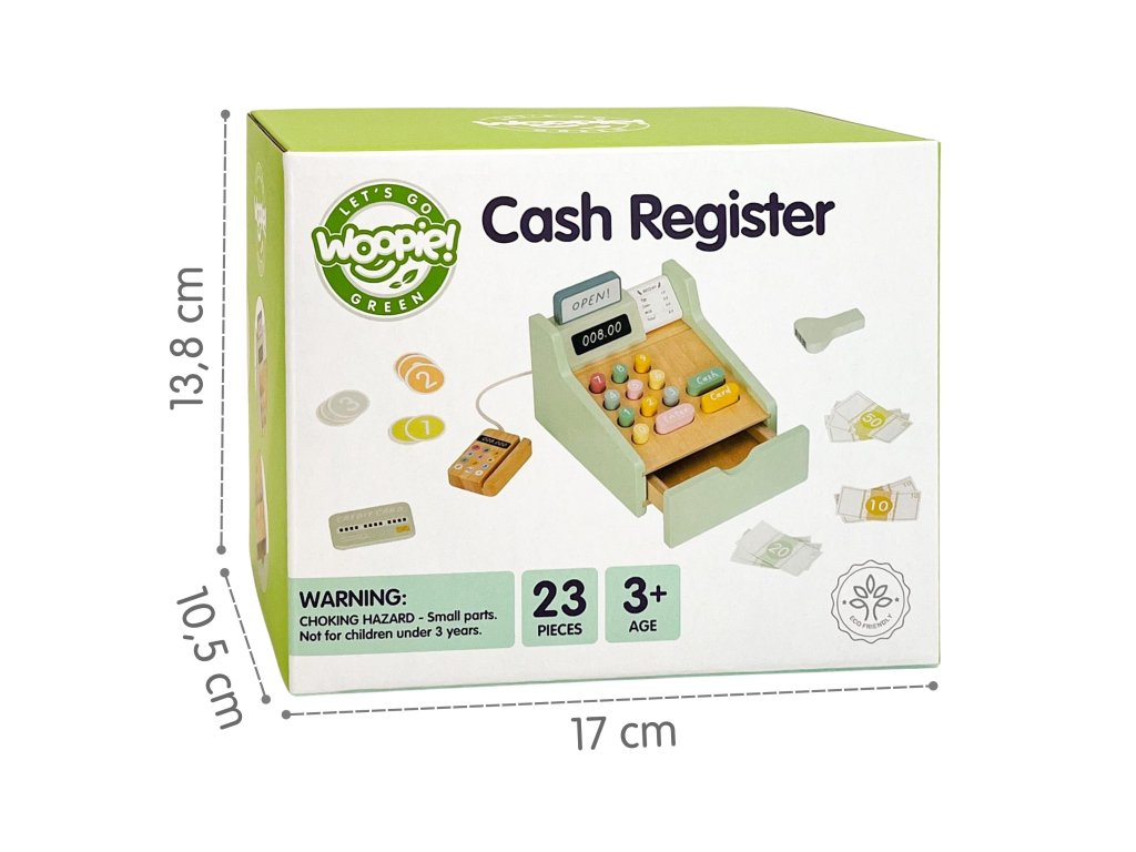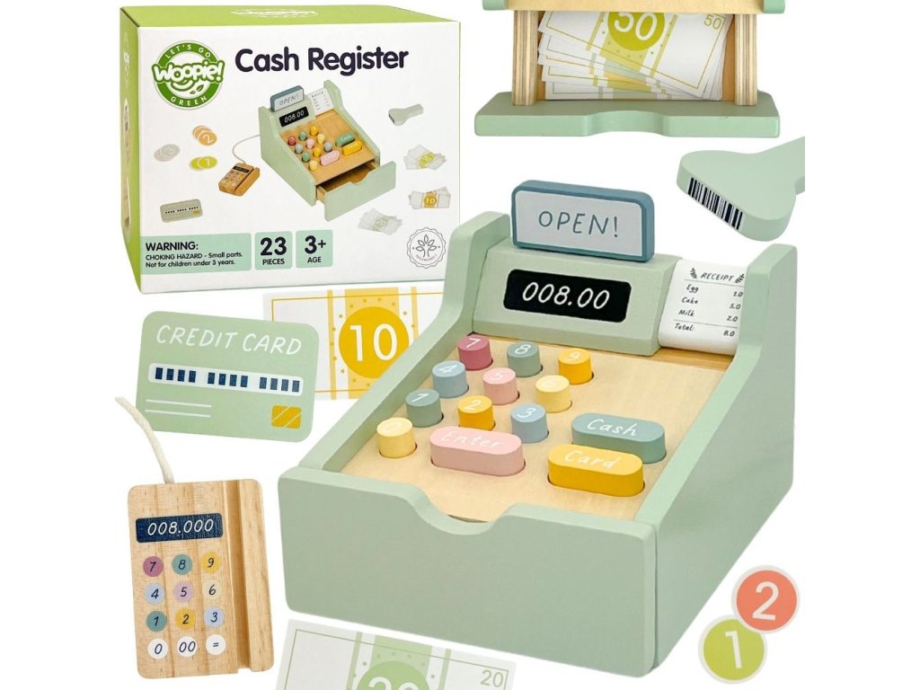 Nechajte svoje dieťa stať sa skutočným obchodníkom s touto rozkošnou drevenou pokladňou od značkyWoopie Green! Táto hračka v pastelových farbách je nielen nádherne spracovaná, ale predovšetkým je to brána k nespočetným hodinám tvorivej hry. Súprava je vybavená všetkým, čo potrebujete na prevádzku vlastného obchodu - od platobného terminálu so snímačom kódov, farebných bankoviek až po mince a kreditné karty. Každý prvok bol premyslený tak, aby hra bola realistická a rozvojová a dieťa sa mohlo počas každodenného nakupovania cítiť ako dospelý.