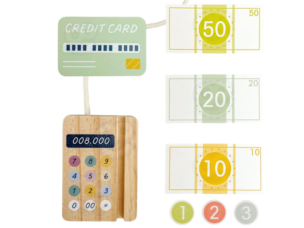 - - Motorické zručnosti -drevená pokladňa rozvíja jemnú motoriku manipuláciou s farebnými tlačidlami, mincami a bankovkami. Dieťa si precvičuje presné pohyby rúk pomocou skenera, otváranie a zatváranie zásuvky, stláčanie tlačidiel a počítanie peňazí. Skladanie a vkladanie kreditnej karty do čítačky ďalej posilňuje koordináciu ruka-oko.