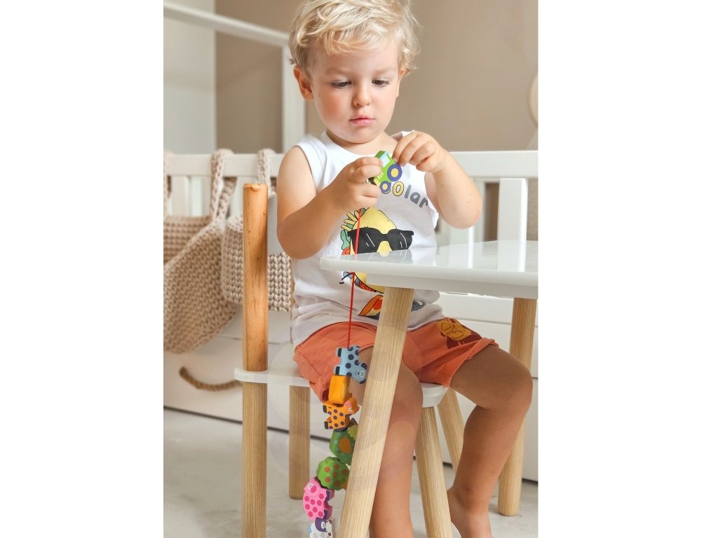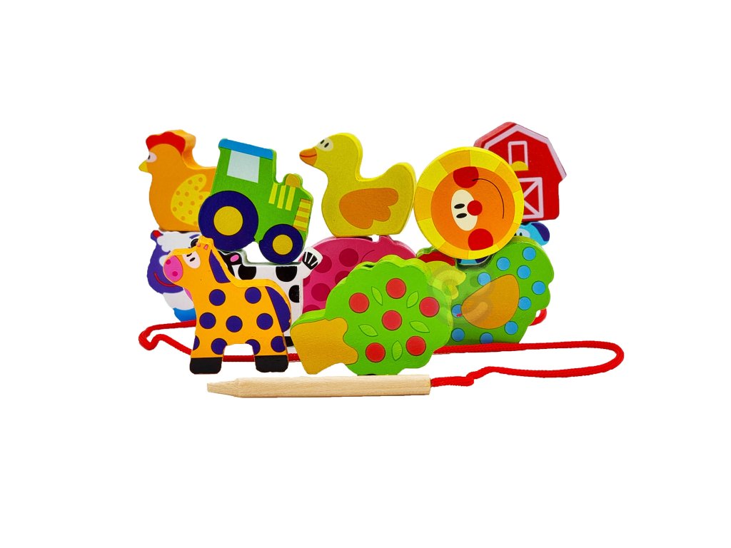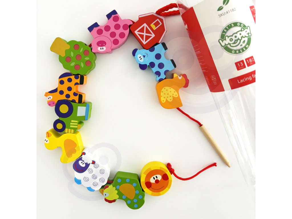 Navliekanie korálok značky WOOPIE v sérii GREEN naklasické prelínanie v modernom, vzdelávacom dizajne. Téma farmy vrátane rozkošných zvieratiek a prvkov vidieckeho života podnecuje predstavivosť a podporuje tvorivú hru. Dieťa navlieka drevené prvky na šnúrke, pričom si precvičujete zručnosť, koncentráciu a trpezlivosť. Vďaka prírodnému drevu a ekologickej výrobe je hračkabezpečné a šetrné k životnému prostrediu.