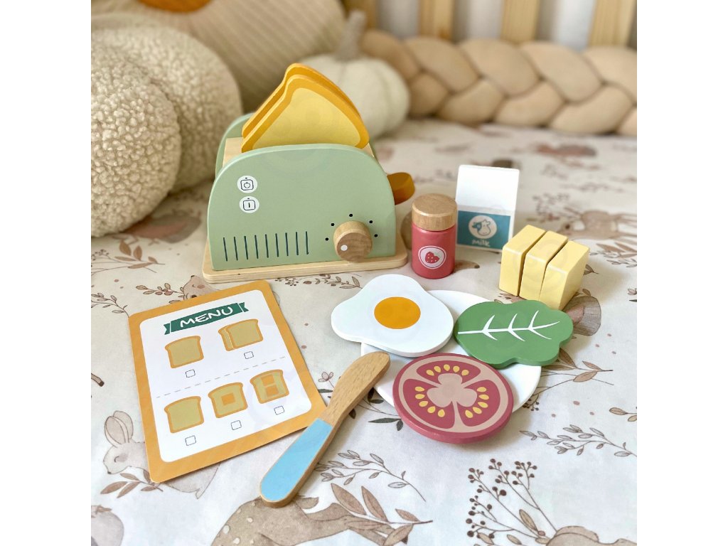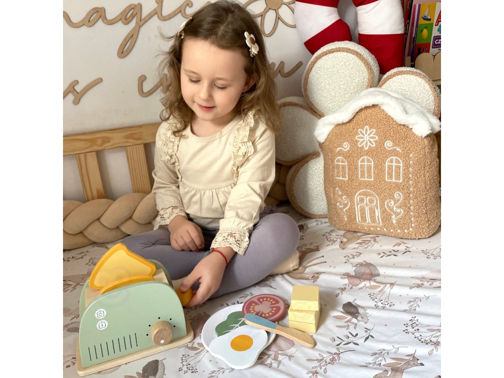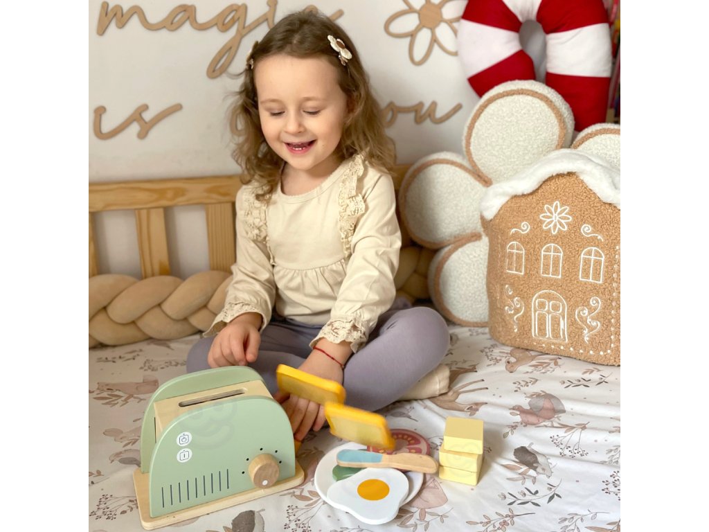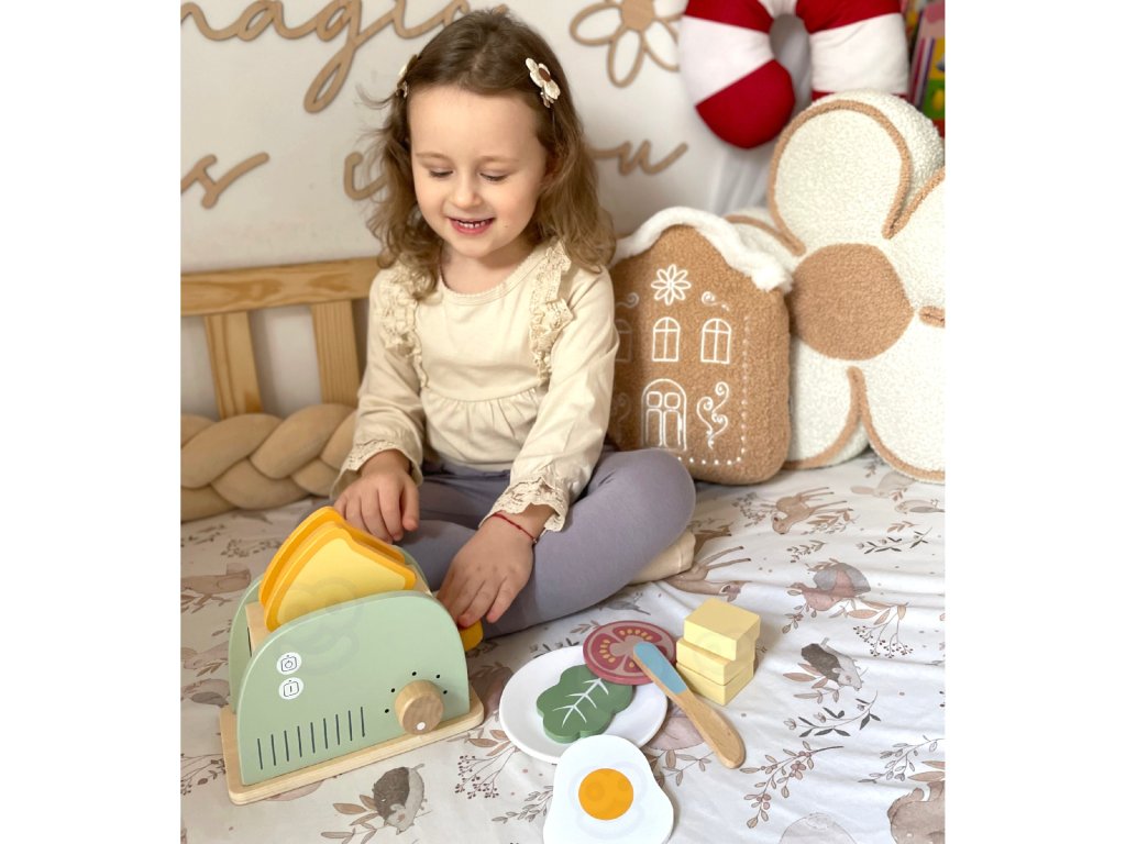 Drevená raňajková súprava s hriankovačom je ideálnou voľbou pre deti, ktoré sa rady hrajú na dom, varia a napodobňujú dospelých. Súprava je inšpirovaná každodennými kuchynskými činnosťami - umožňuje pripraviť chutný toast, vyprážané vajíčko alebo sendvič s prílohami. Vďaka hračke môže vaše dieťa prevziať úlohu malého kuchára a kreatívnym spôsobom rozvíjať svoje sociálne zručnosti a predstavivosť. Celá súprava je vyrobená zbezpečné drevo s hladkou povrchovou úpravou a namaľované netoxickými farbami v pastelových farbách. Hračka je nielen krásna, ale aj pevná a odolná. Súprava je ideálna na samostatnú hru aj na spoločné varenie s rodičom alebo súrodencom. Je to perfektný nápad na darček, ktorý učí prostredníctvom hry a rozvíja každodenné zručnosti dieťaťa.