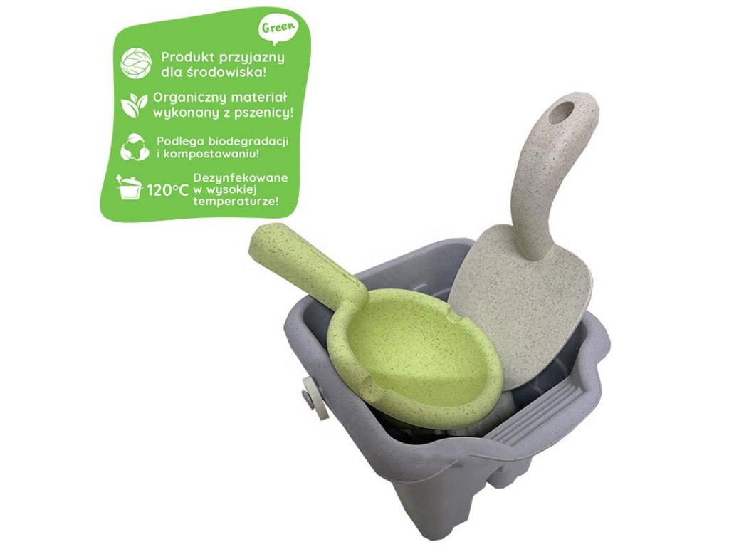 Sada piesku vo vedre od značkyWOOPIE je skvelým doplnkom na pieskovisko alebo aj do záhrady. Súprava obsahuje8 prvkov: vedro, kanva, 4 formy, 2 lopaty. Vedro a kanva majúpohodlná rukoväť nosiť. Súprava má najmodernejšiepastelový dizajn a bol vyrobený zorganické a biologicky rozložiteľné (podlieha samovoľnému rozkladu) materiál. Okrem toho podliehakompostovanie. Produktbezpečné pre deti - dezinfikované pri teplote 120 stupňov. Záruka super zábavy v pieskovisko, napláža dokonca aj vzáhrada!Produkt šetrný k životnému prostrediu!