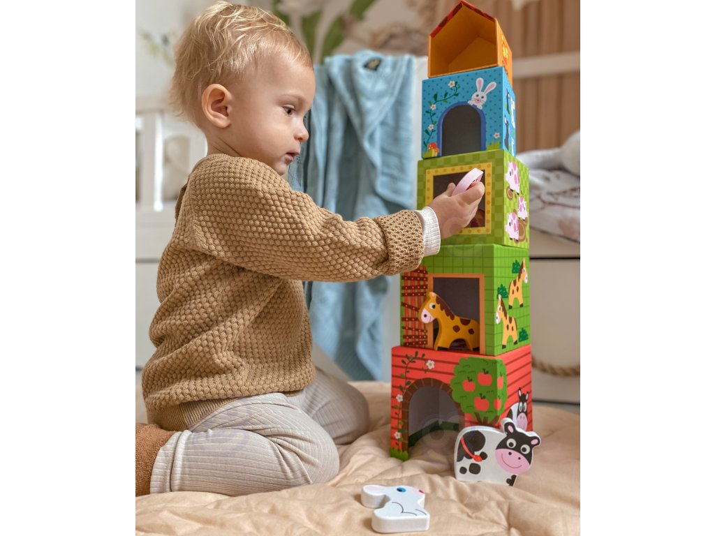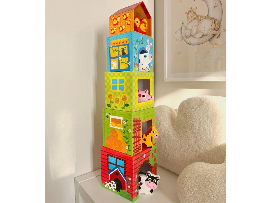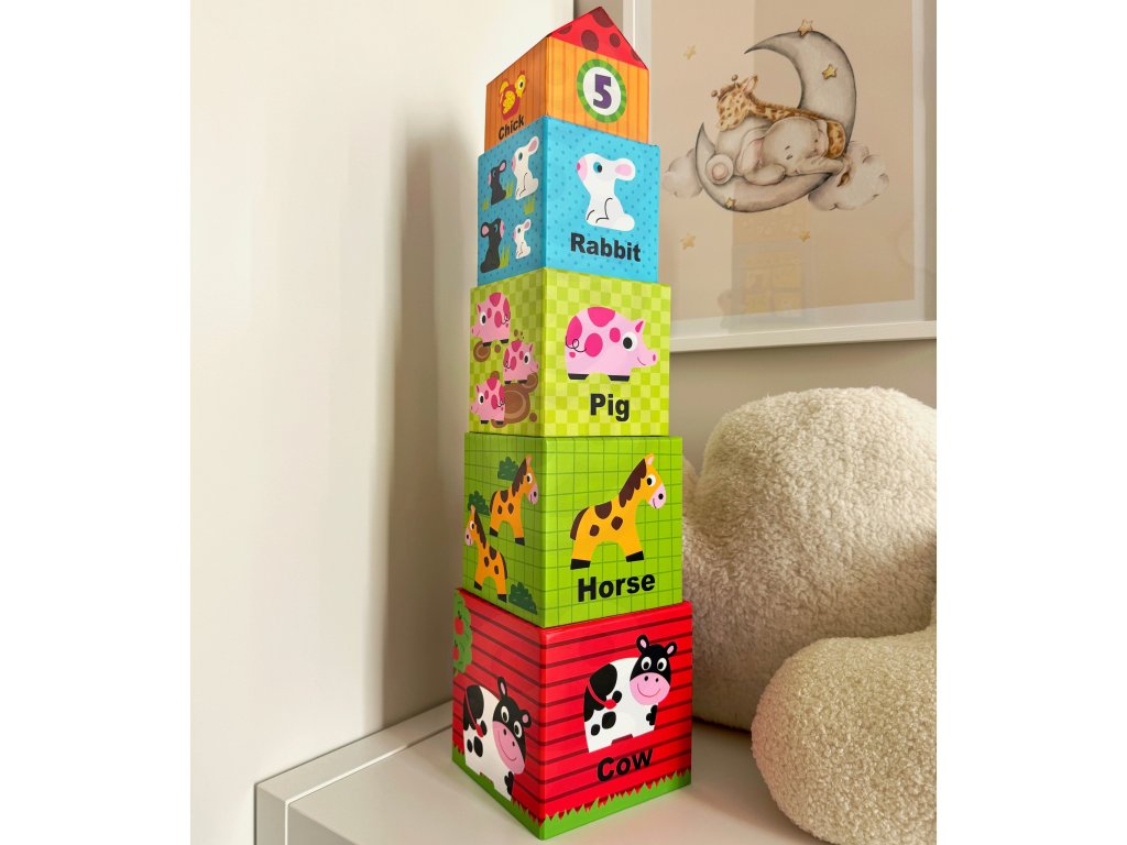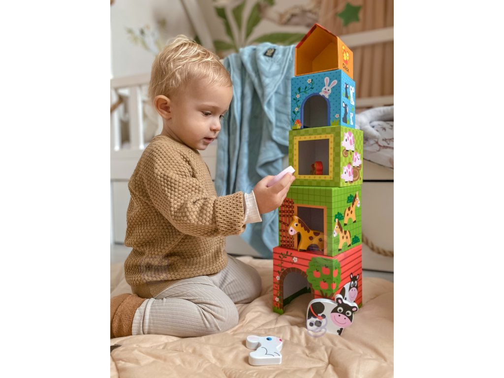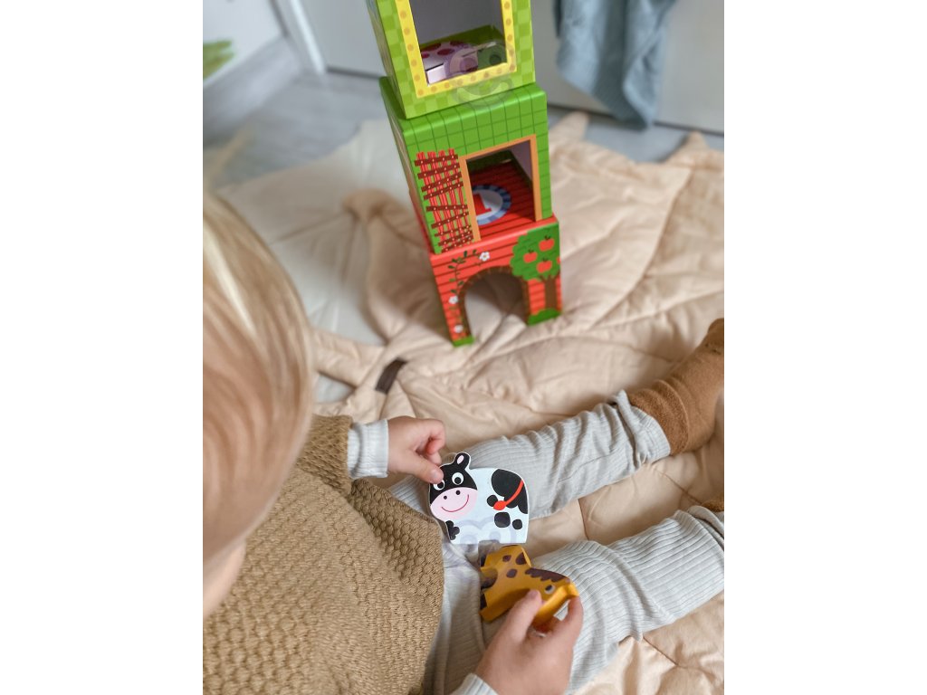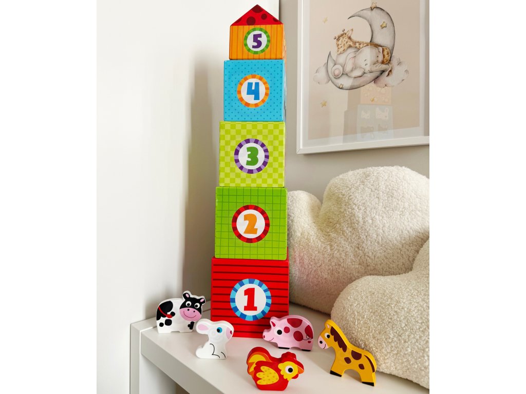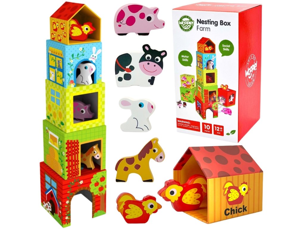 SkladačkaFarma od značkyWOOPIE zo sérieZELENÁ je kreatívnou alternatívou klasických puzzle a stavebníc. Vďaka farebným, ilustrovaným kockám dieťa spája učenie so zábavou adrevené figúrky zvierat zaviesť prvok hrania rolí a učenia sa o živote na farme. Každá kocka je iný domček - od veľkej kravy po malú sliepku - očíslovaný podľa veľkosti a počtu zvierat. Obrázky zobrazujúanglické názvy, ktoré podporujú učenie sa jazykov od útleho veku.