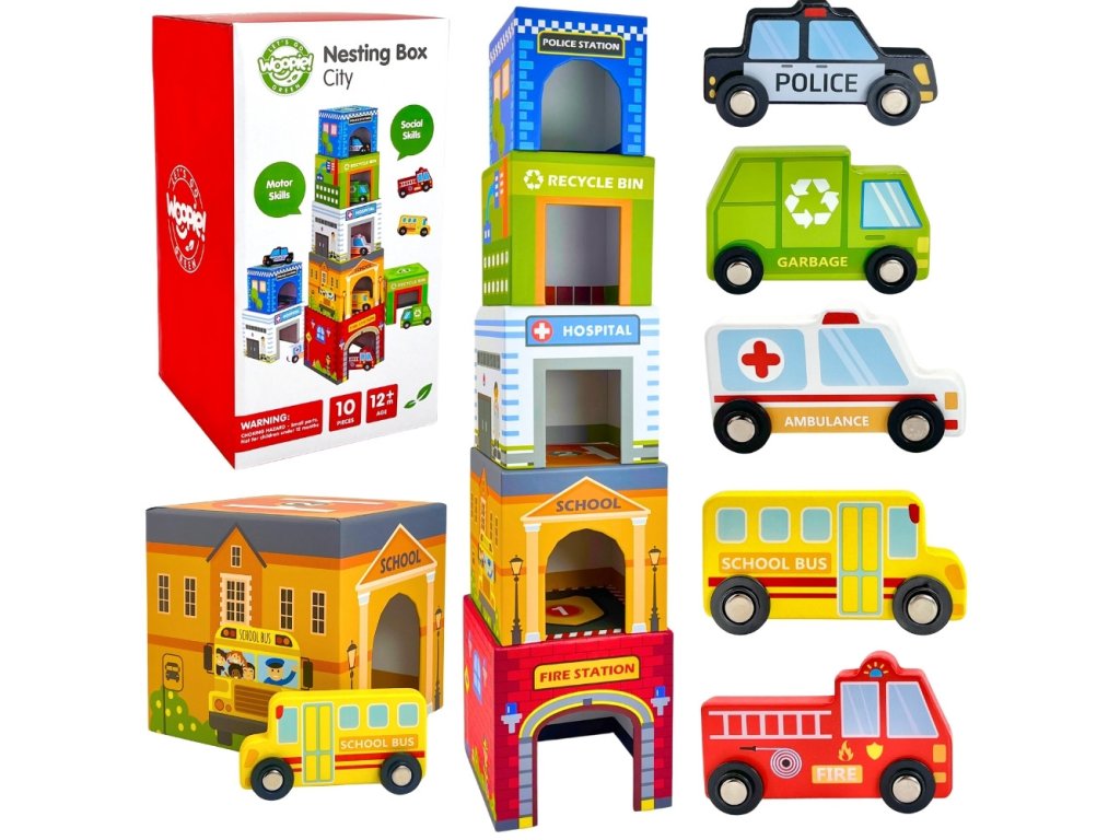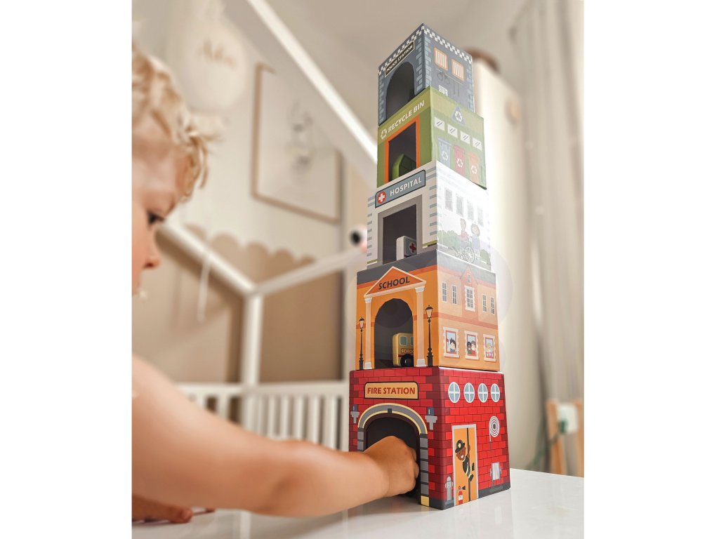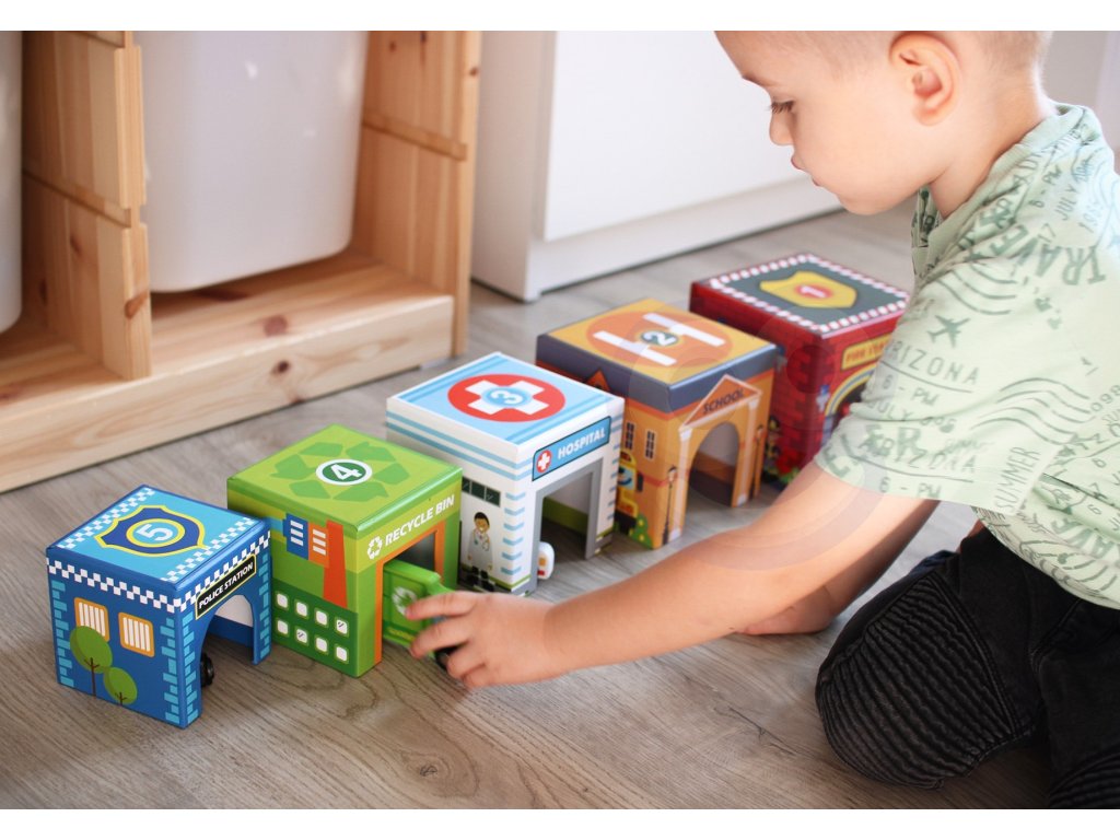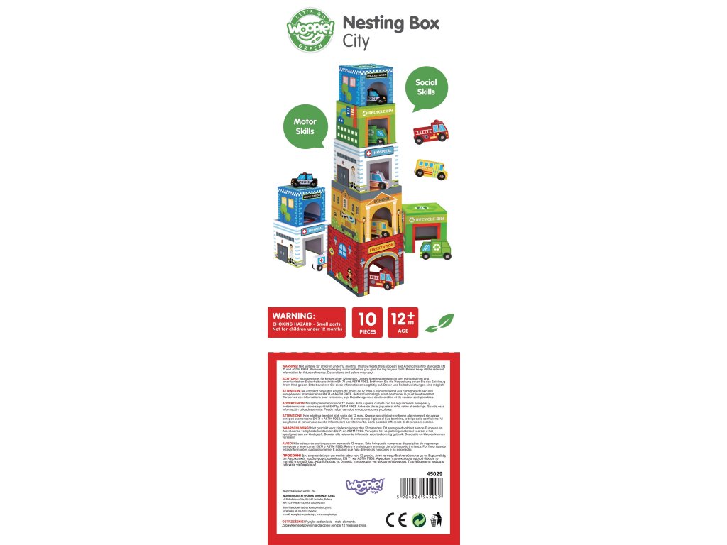 Puzzle City od značky WOOPIE zo série GREEN je skvelou alternatívou k tradičným kockám a skladačkám. Farebné kocky s ilustráciami budov a číslovania uvádzajú dieťa do sveta čísel, mestských inštitúcií a vozidiel a ponúkajú zábavu, ktorá učí aj rozvíja. Kkaždá kocka sa zhoduje s ostatnými ako kúsok mestskej skladačky - možno z nich stavať veže, priraďovať vozidlá k príslušným budovám a dokonca ich používať ako kontajnery na drobnosti.