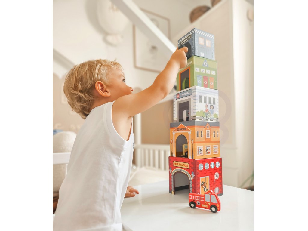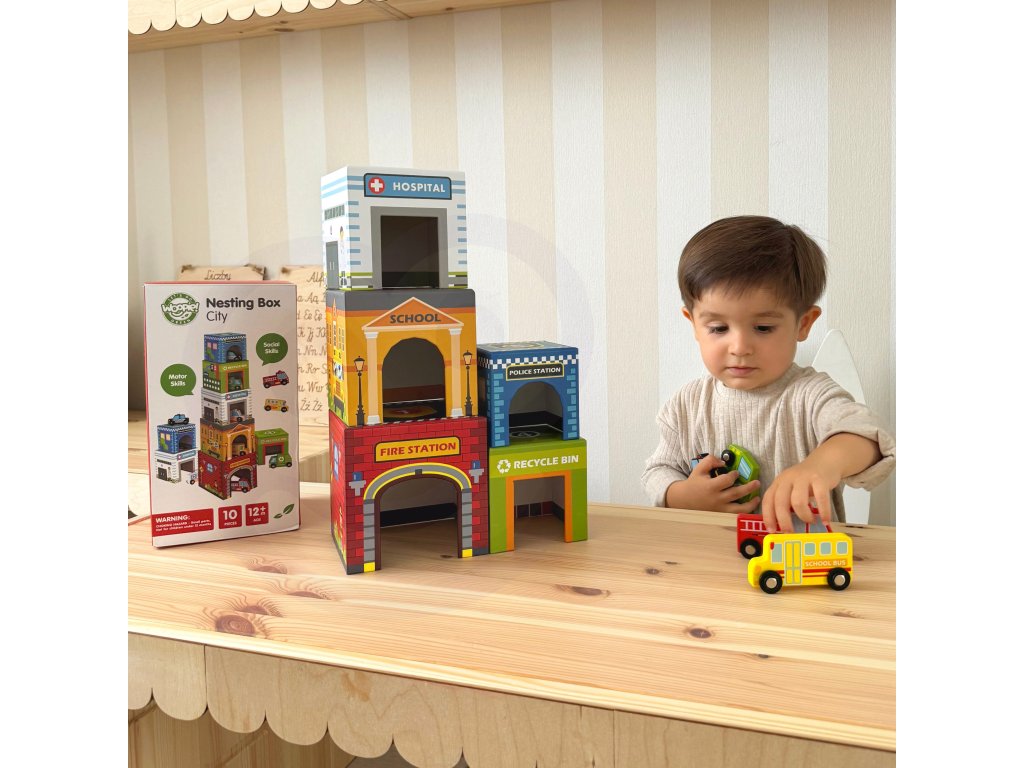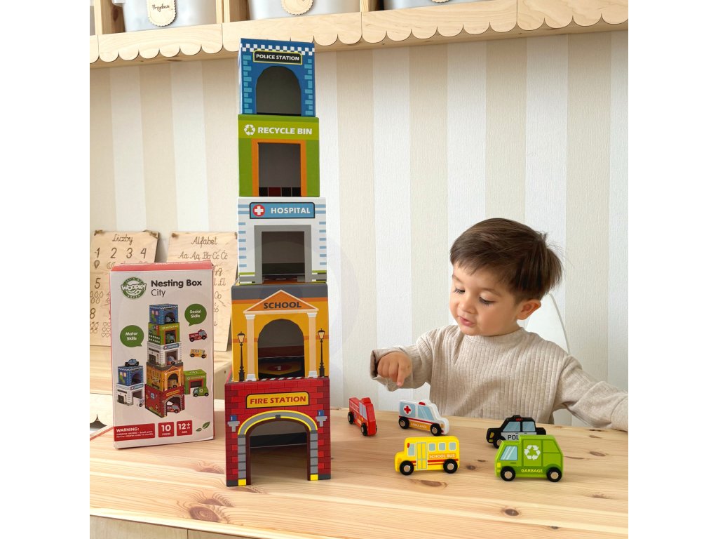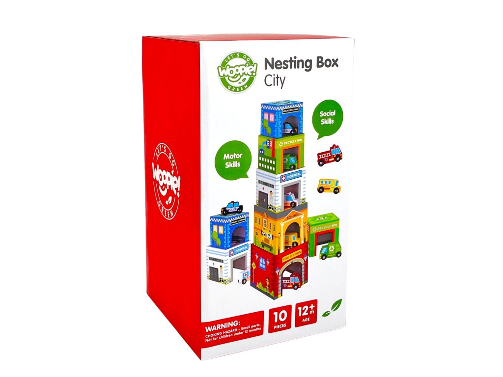 Puzzle City od značky WOOPIE zo série GREEN je skvelou alternatívou k tradičným kockám a skladačkám. Farebné kocky s ilustráciami budov a číslovania uvádzajú dieťa do sveta čísel, mestských inštitúcií a vozidiel a ponúkajú zábavu, ktorá učí aj rozvíja. Kkaždá kocka sa zhoduje s ostatnými ako kúsok mestskej skladačky - možno z nich stavať veže, priraďovať vozidlá k príslušným budovám a dokonca ich používať ako kontajnery na drobnosti.