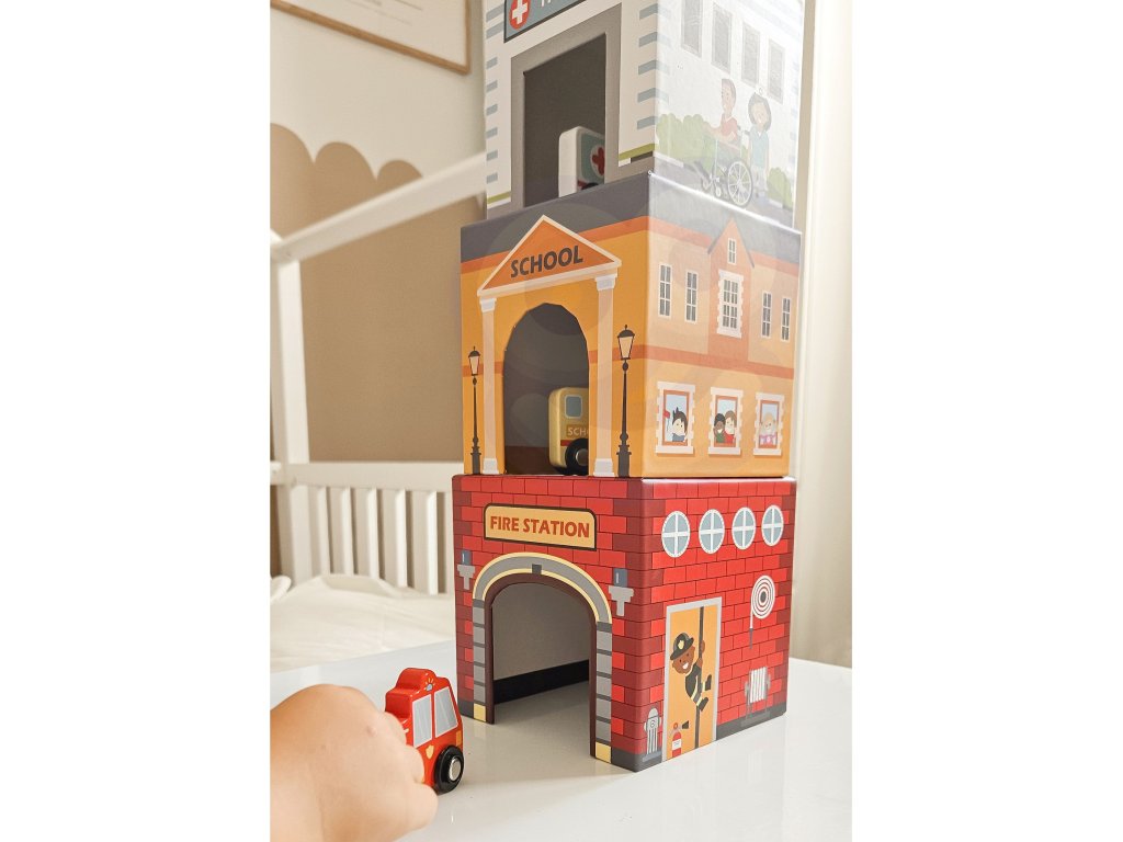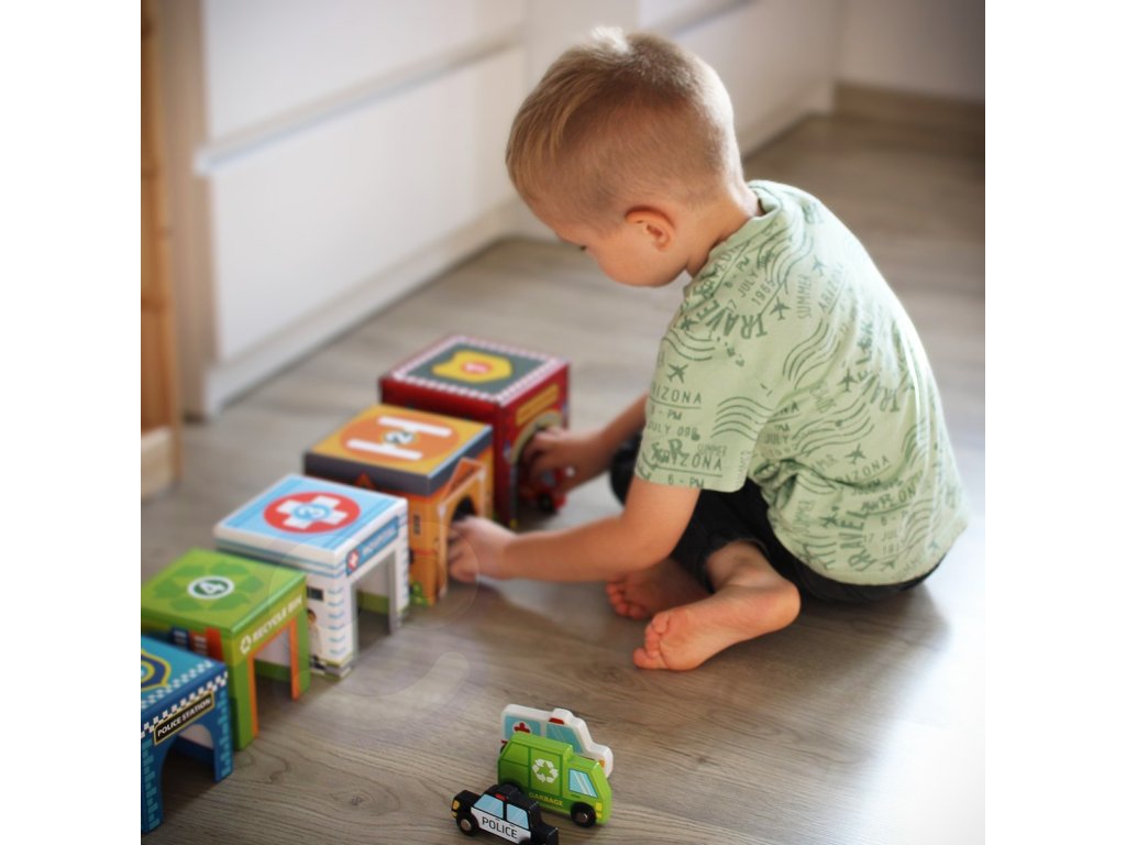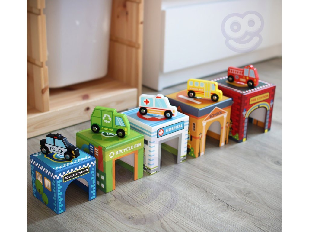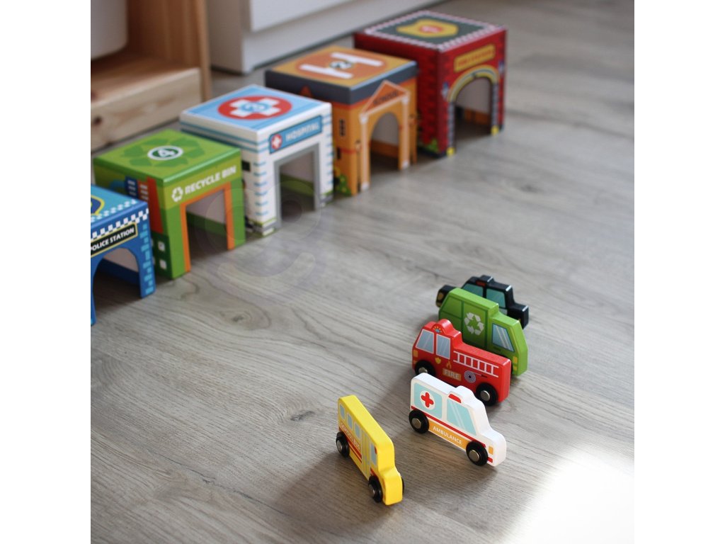 Sada tiež obsahuje: roztomilé drevené autíčka na gumených kolieskach, do ktorých môžu deti vstupovať cez špeciálne otvory. Je to ideálna príležitosť na vytváranie vlastných príbehov azahrajte si každodenné scény zo života mesta!