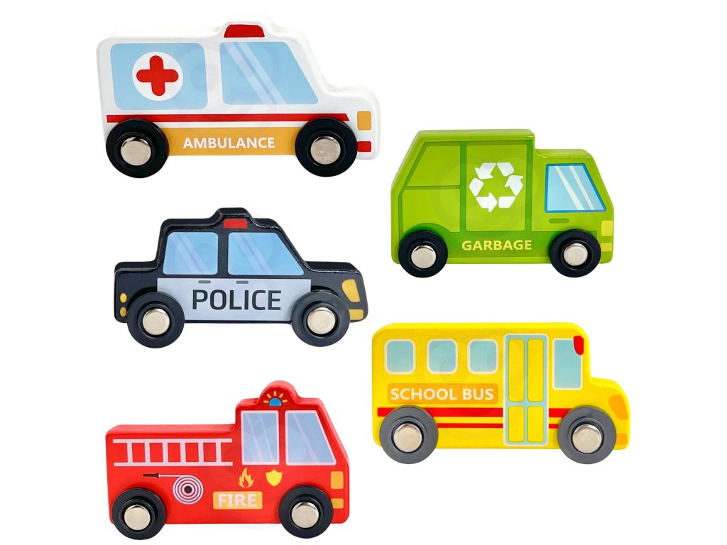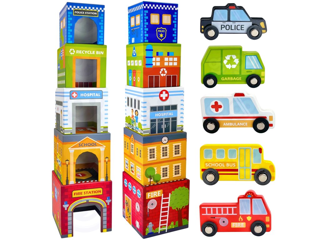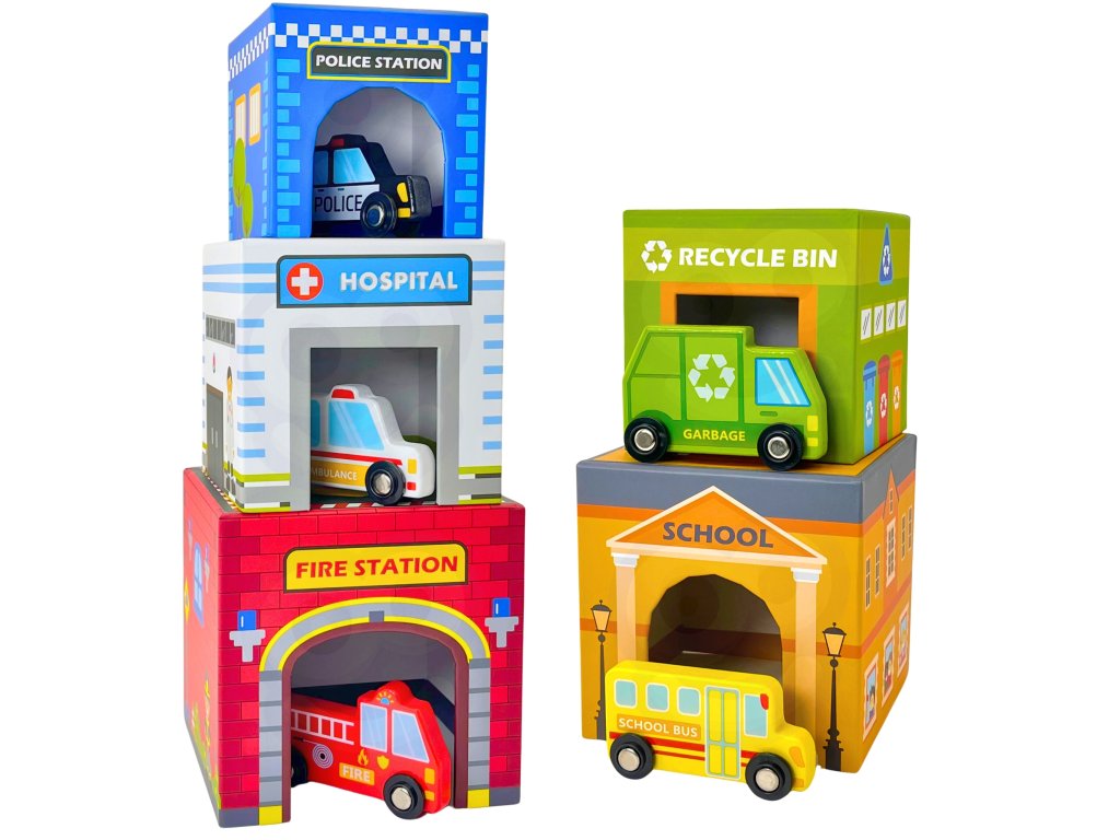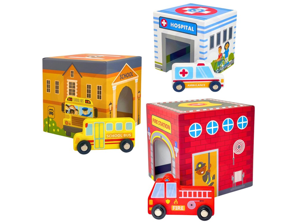- - Súbor obsahuje 10 prvkov: 5 ilustrovaných kociek rôznych veľkostí a 5 drevených vozidiel na gumových kolieskach
