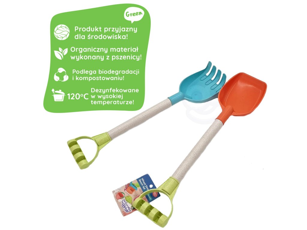 Súprava lopaty a hrable na piesok od značkyWOOPIE zo série ZELENÁ je skvelá súprava na pieskovisko alebo aj do záhrady.Súprava obsahuje lopata a hrable 51 cm. Príslušenstvo má najmodernejšiepastelový dizajn a boli vyrobené zorganické a biologicky rozložiteľné (podlieha samovoľnému rozkladu) materiál. Okrem toho podliehakompostovanie. Produktbezpečné pre deti - dezinfikované pri teplote 120 stupňov. Záruka super zábavy v pieskovisko, napláža dokonca aj vzáhrada!Produkt šetrný k životnému prostrediu!