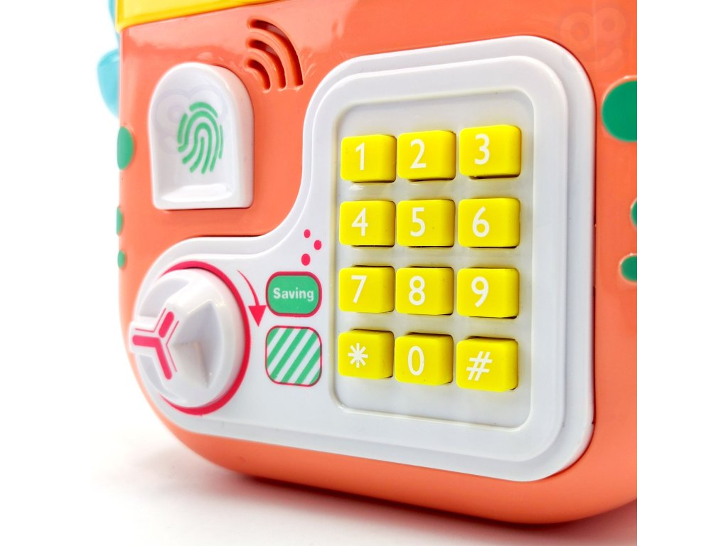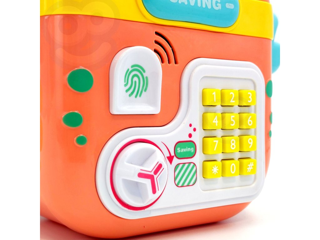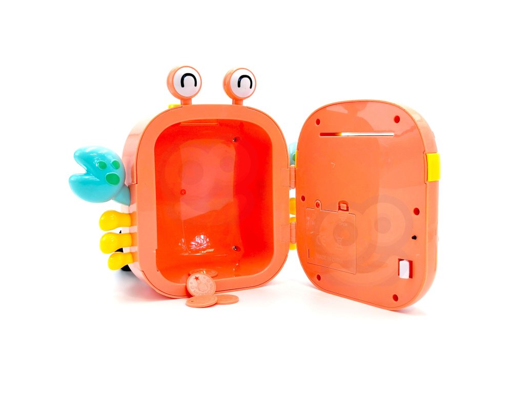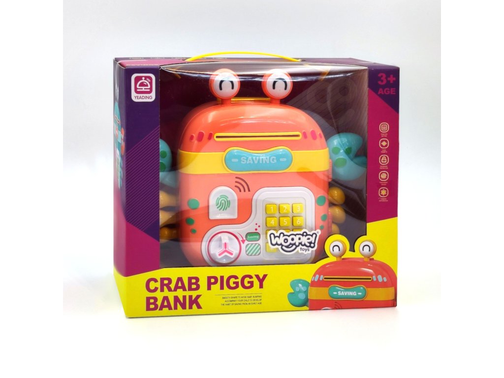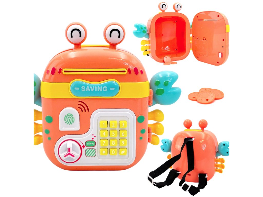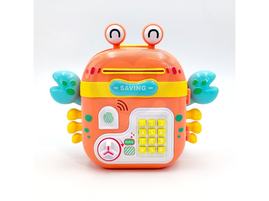Elektronická pokladnička na slogan značky WOOPIE je multifunkčný výrobok, ktorý vaše dieťa určite poteší! Krab je navrhnutý tak, aby ste mohli uložiť mince, bankovky a iné menšie hračky. Pokladnička sa skladá zo špeciálnych otvorov na bankovky a mince, čítačka odtlačkov prstov, klávesnice na písanieheslá agombíky na otváranie. Elektronický krab navyše vydáva zvuky! V prípade potreby možno hračku ľahko resetovať a nastaviť nové heslo