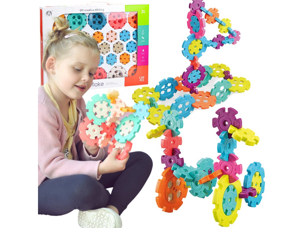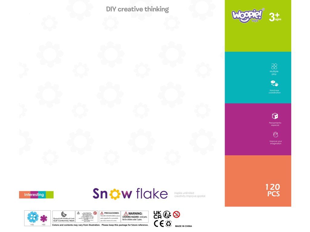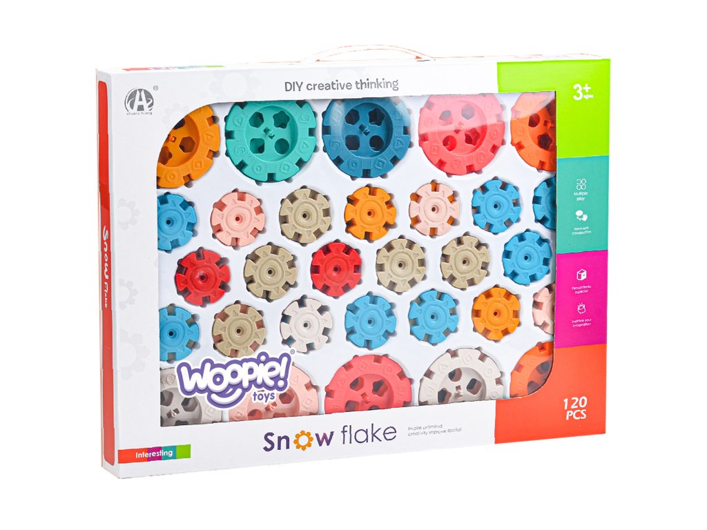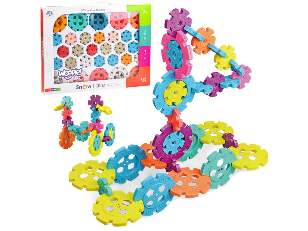 Stavebné bloky Wafers od značky WOOPIE Budú priťahovať pozornosť a fascinovať vaše dieťa. Farebnýprvky sa svojím vzhľadom podobajú na snehové vločky. Bloky vo veľmi výraznej forme;ľahko prepojiťa vďaka ich štruktúre a spôsobu kombinácie ich možno vyrobiť zaujímavé trojrozmerné stavby. Otvory použité v snehových guľách umožňujú ich spojenie šikmo, a nie len kolmo. Súprava obsahuje 120 prvkov: vrátane 40 veľkých a 80 malých tehál. Samotné budovanie štruktúry bude rozvíjať dieťa logické myslenie, predstavy, kreativita amu pomôže sústrediť sapri vytváraní. Skladaním kociek sa dieťa učí o tvaroch a farbách a precvičuje si manuálne zručnosti, tzv;jemné motorické zručnosti.
