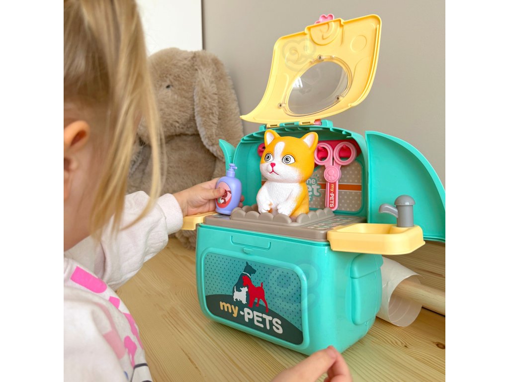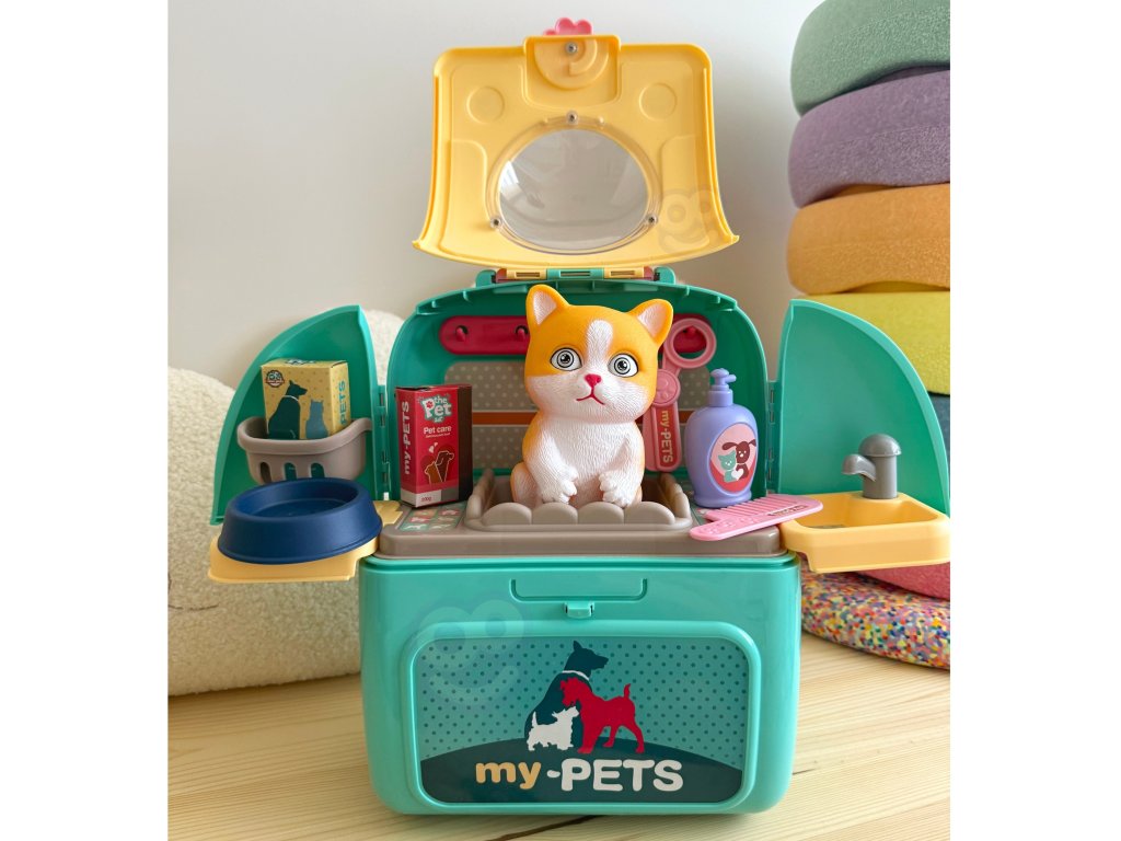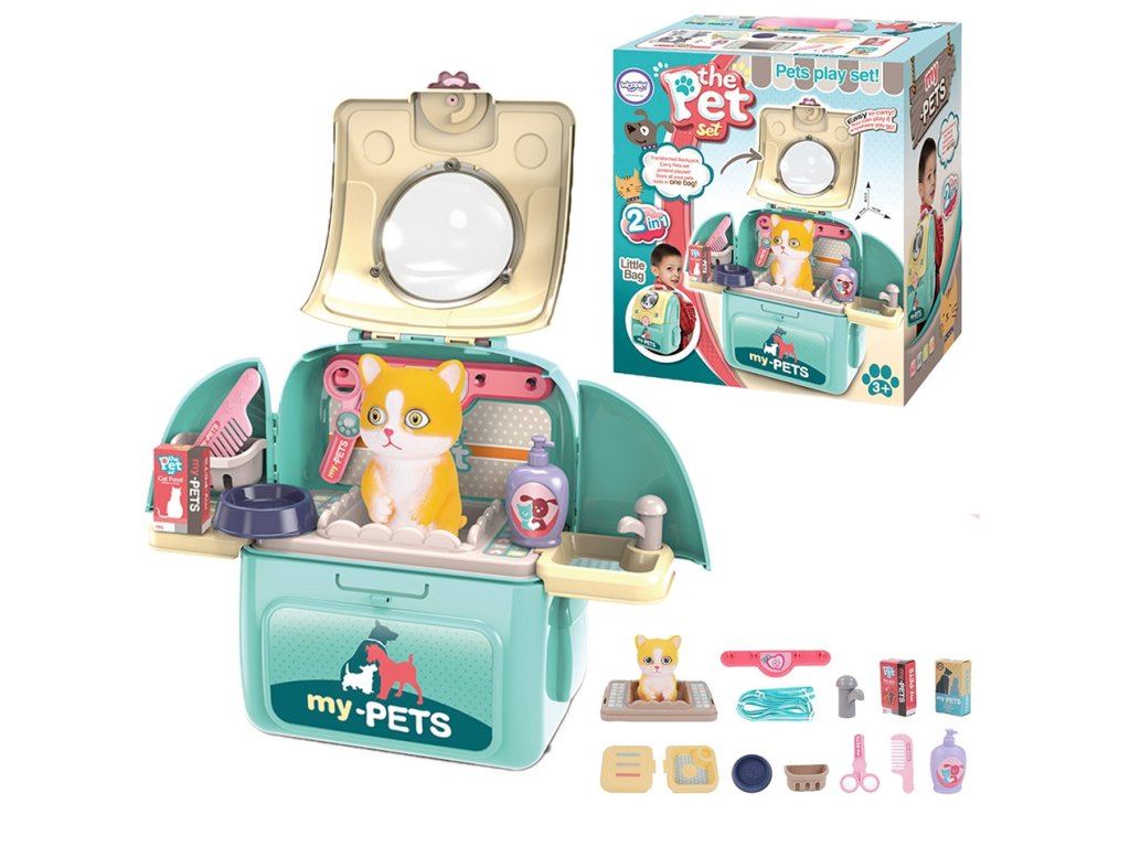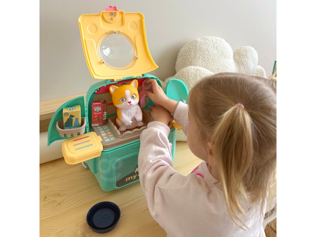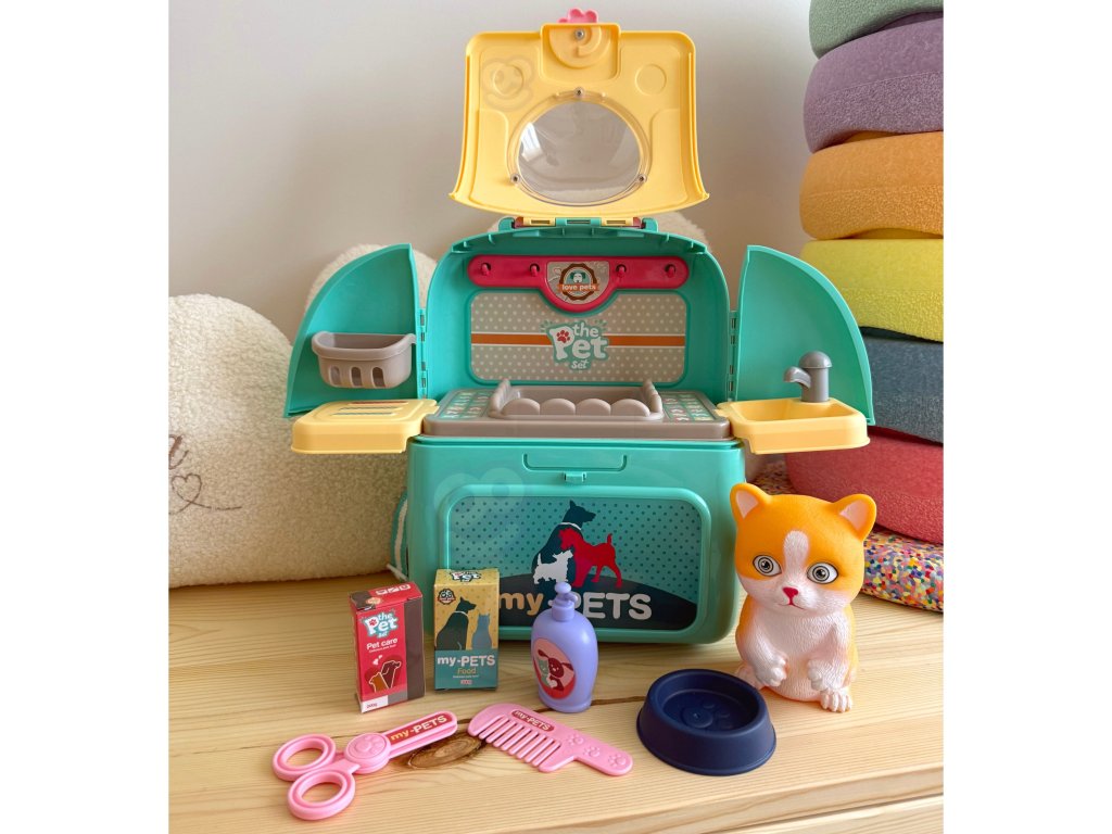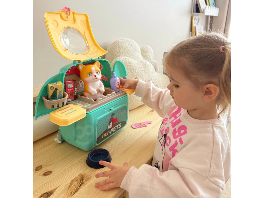 Prenosná súprava na starostlivosť o mačkyod značky WOOPIEumožní vášmu dieťaťu starať sa o svoje obľúbené zvieratko. Môžetevziať kamkoľvek vašej mačky v pohodlnom prenosnombatoh: na cesty, na ihrisko alebo do škôlky. Batoh márukoväť na zdvíhanie ašpeciálny uzáverktoré neumožnia otvorenie kabíny počas premiestňovania a zabezpečia maximálnuzabezpečenie domáce zvieratko. Súprava na úpravu vlasov2w1 obsahuje: figúrku mačičky, batoh, popruh (na nasadenie kabíny na chrbát), misku, nožnice, hrebeň, košík na príslušenstvo, 2 krabice na jedlo, šampón, umývadlo, kohútik, poličku a vešiak. Súprava obsahuje všetko potrebné na starostlivosť o domáce zvieratko. Dieťa môžeumývanie ikrmivo jeho mačka. Dieťa, ktoré hrá úlohuopatrovateľ aleboveterinárny lekár rozvíja svojupredstavy a zmysel preempatie.Je možné, že hračka bude začiatkom rozvíjať vášeňa spôsoby, ako sa stať veterinárny lekár.