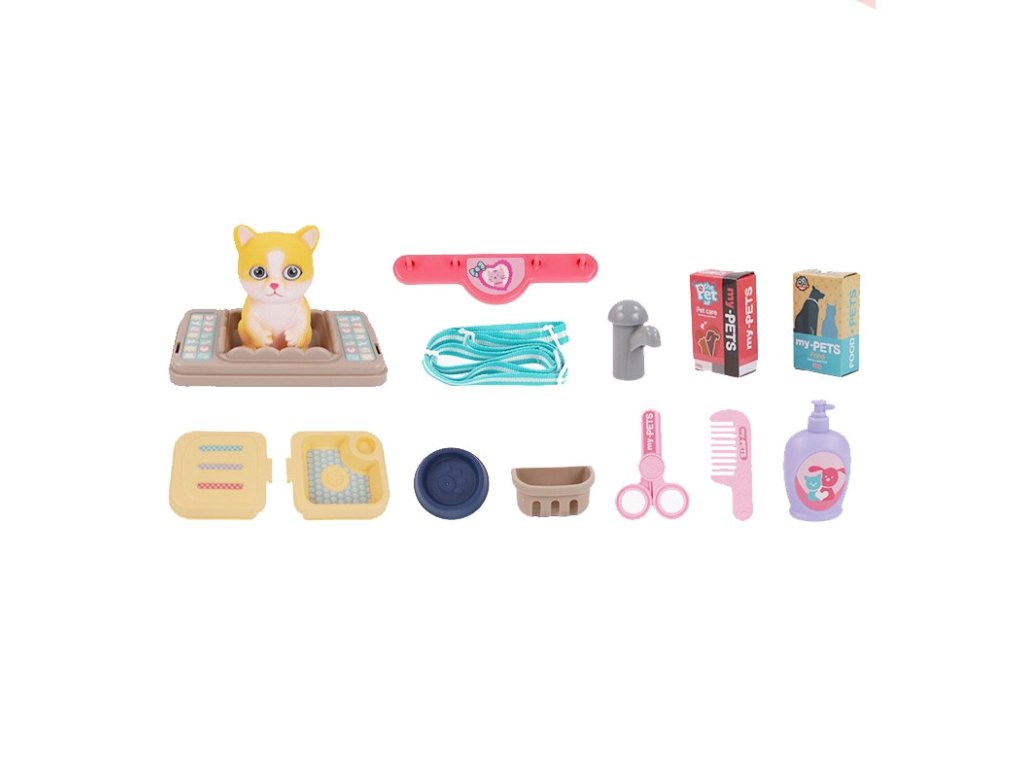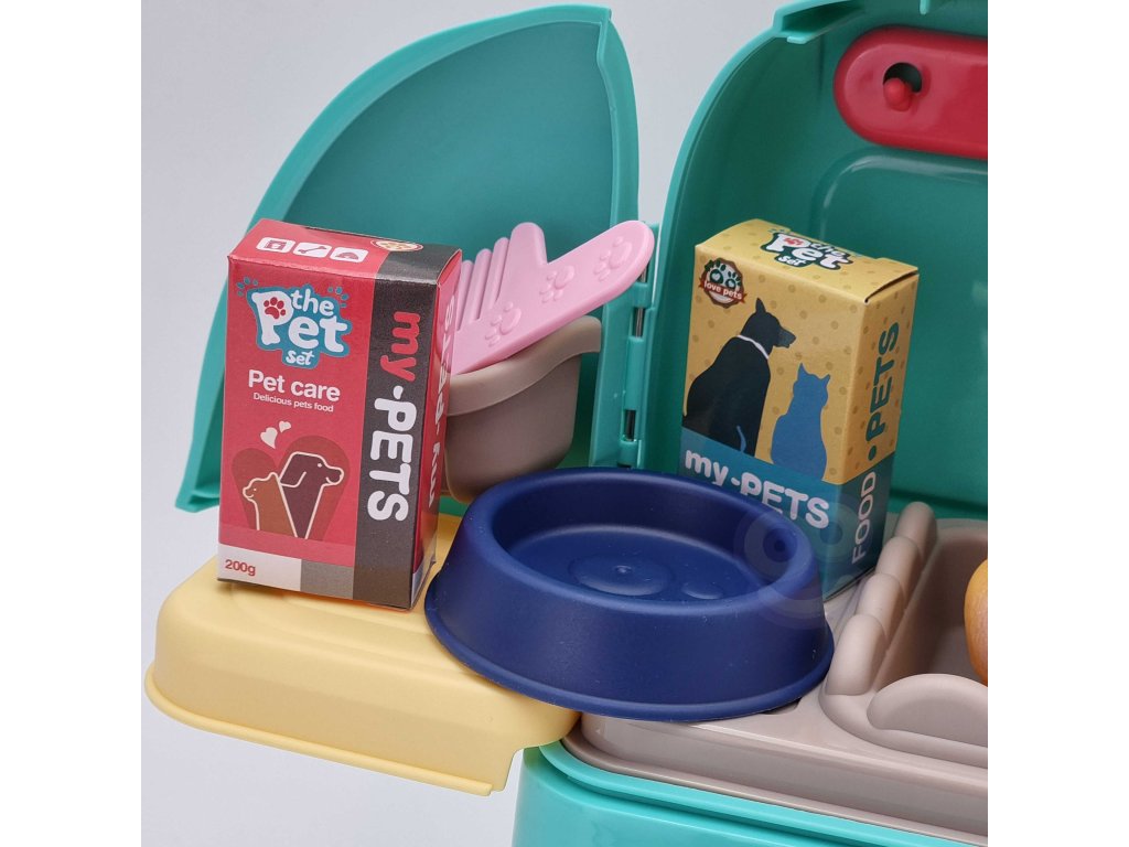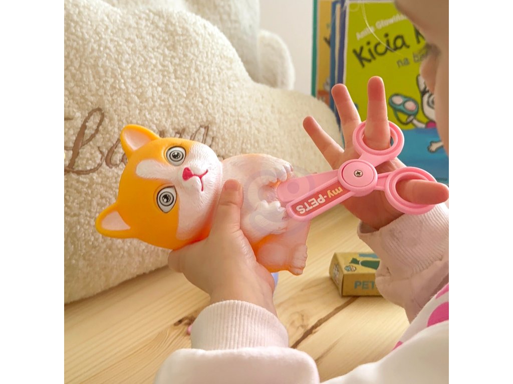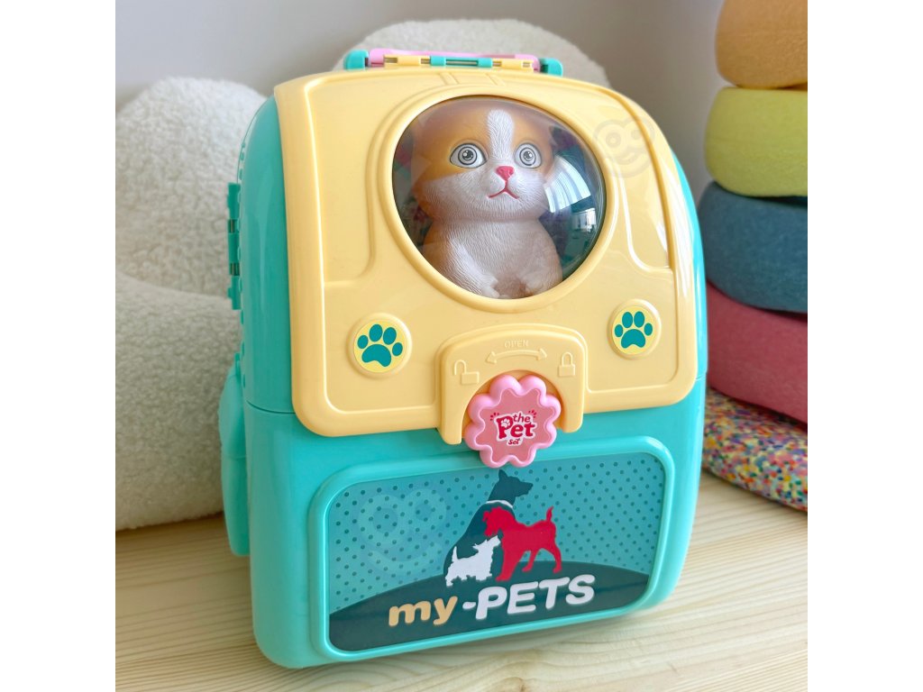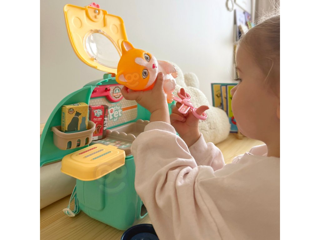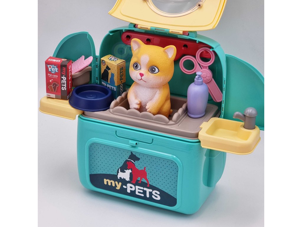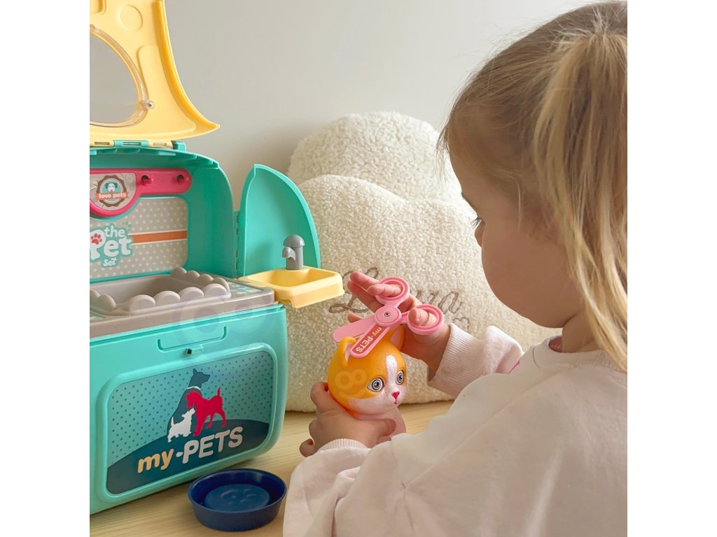Prenosná súprava na starostlivosť o mačkyod značky WOOPIEumožní vášmu dieťaťu starať sa o svoje obľúbené zvieratko. Môžetevziať kamkoľvek vašej mačky v pohodlnom prenosnombatoh: na cesty, na ihrisko alebo do škôlky. Batoh márukoväť na zdvíhanie ašpeciálny uzáverktoré neumožnia otvorenie kabíny počas premiestňovania a zabezpečia maximálnuzabezpečenie domáce zvieratko. Súprava na úpravu vlasov2w1 obsahuje: figúrku mačičky, batoh, popruh (na nasadenie kabíny na chrbát), misku, nožnice, hrebeň, košík na príslušenstvo, 2 krabice na jedlo, šampón, umývadlo, kohútik, poličku a vešiak. Súprava obsahuje všetko potrebné na starostlivosť o domáce zvieratko. Dieťa môžeumývanie ikrmivo jeho mačka. Dieťa, ktoré hrá úlohuopatrovateľ aleboveterinárny lekár rozvíja svojupredstavy a zmysel preempatie.Je možné, že hračka bude začiatkom rozvíjať vášeňa spôsoby, ako sa stať veterinárny lekár.