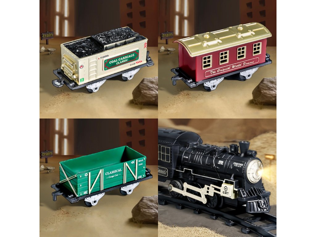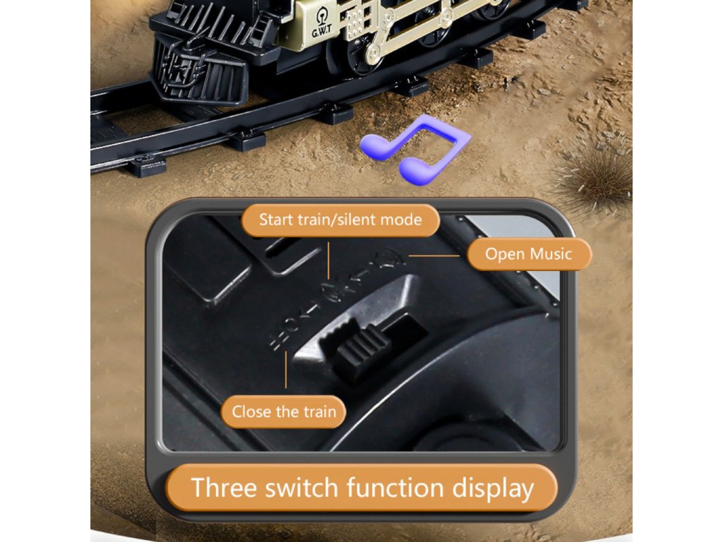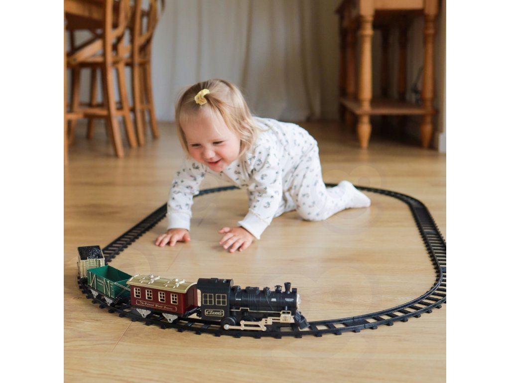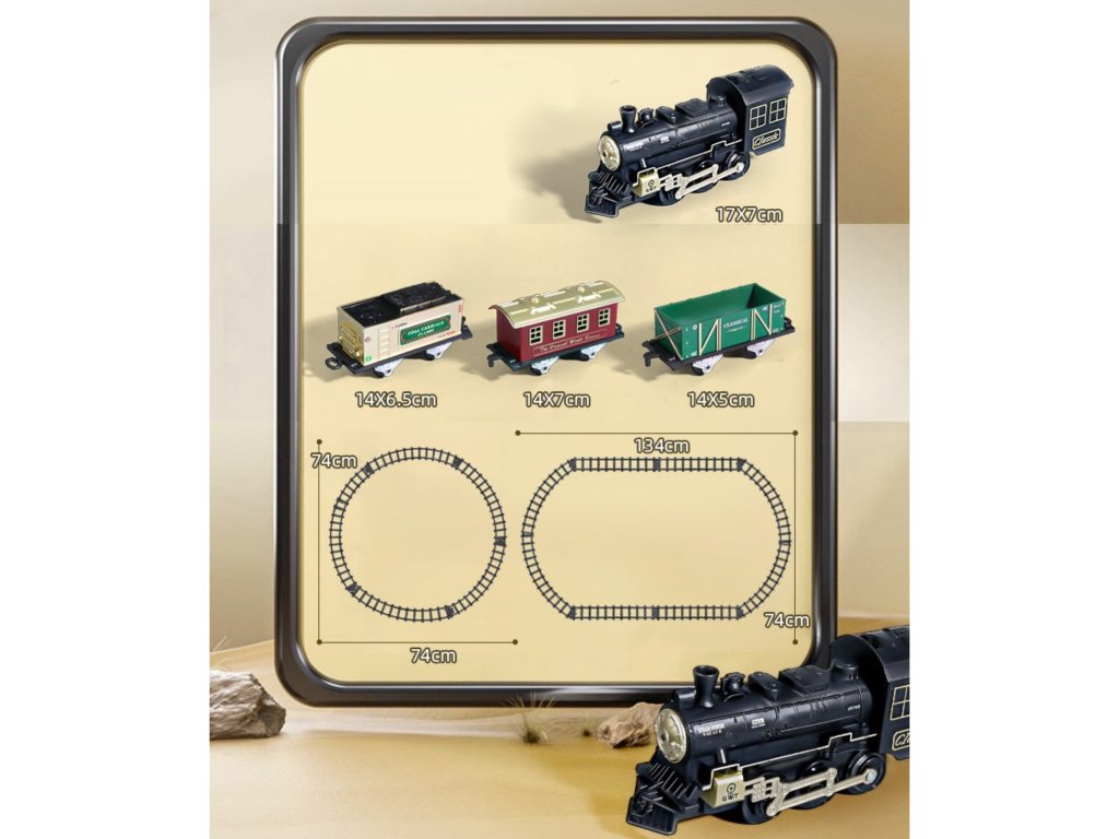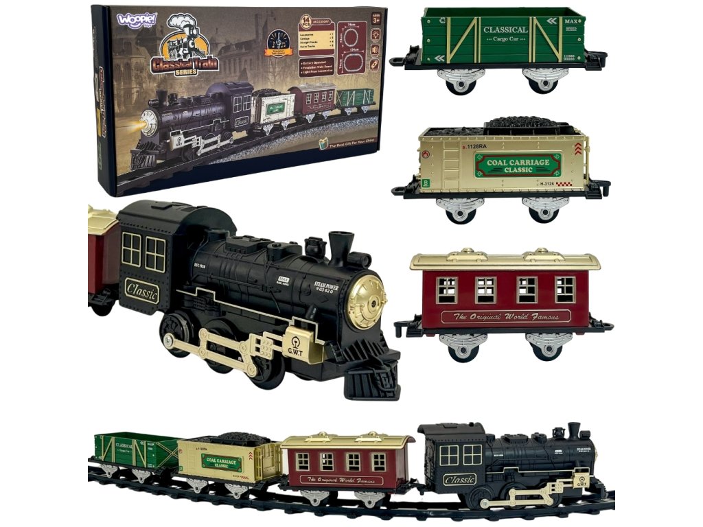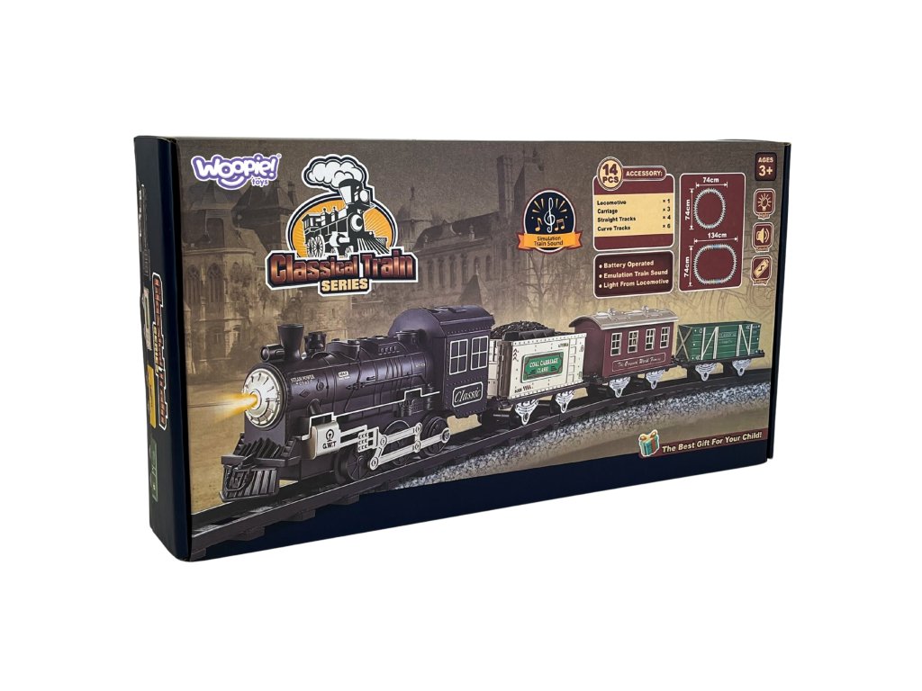 Preneste sa do sveta nezabudnuteľných ciest s klasickým parným vlakom od značkyWoopie! Táto nádherná súprava je nielen vernou kópiouparný vlakale aj zdrojom nespočetných hodín tvorivej hry. Verná reprodukcia klasickej parnej lokomotívy a realistickésvetelné a zvukové efekty urobia z každej cesty nezabudnuteľné dobrodružstvo a ľahko zostaviteľné trate vám umožnia zostaviť si vlastné vzrušujúce trasy. Ideálne pre malých rušňovodičov a železničných nadšencov, ktorí chcú pocítiť čaro cestovania vlakom!