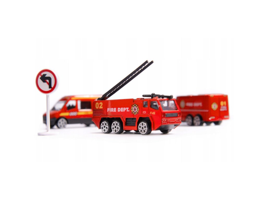 - - 3 červené hasičské vozidlá: rebríkové vozidlo, obrnený transportér, malé mestské hasičské vozidlo