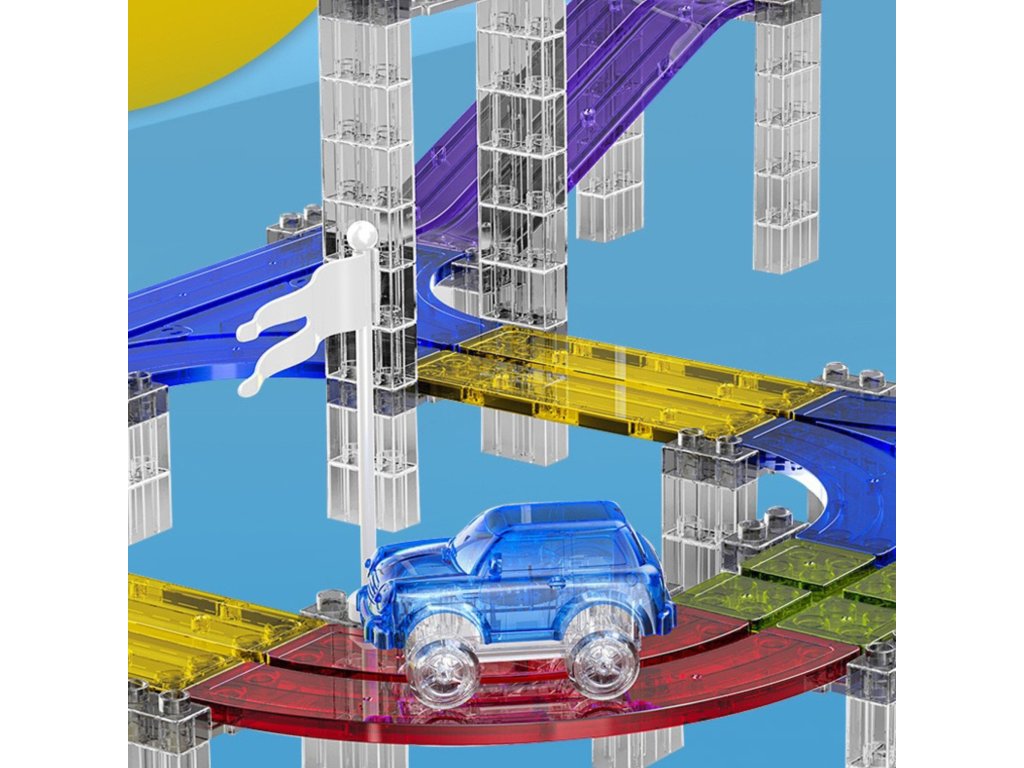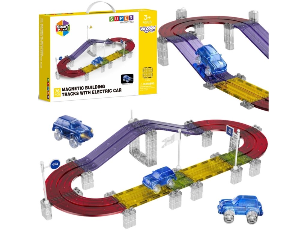 Magnetická pretekárska dráha podľa značkyWoopie je jedinečná hračka, ktorástimuluje kreativitu každé dieťa a premení hru naneuveriteľné dobrodružstvo plná svetla a farieb! Vďakaľahko kombinovateľné magnetické prvky, ktoré môžu batoľatápostavte si ho sami rôzne viacúrovňové dráhy, po ktorých sa pohybuje svietiace autíčko. Priehľadné, farebné časti a výrazné LED svetlá robia zábavu pútavou aveľa zábavy cez deň aj večer.