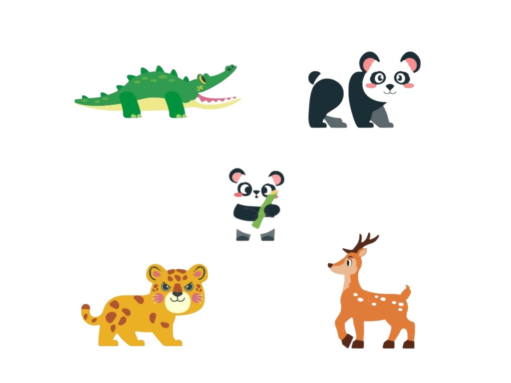 - - Figúrky zvierat: 2 x panda, leopard, jeleň, krokodíl.
