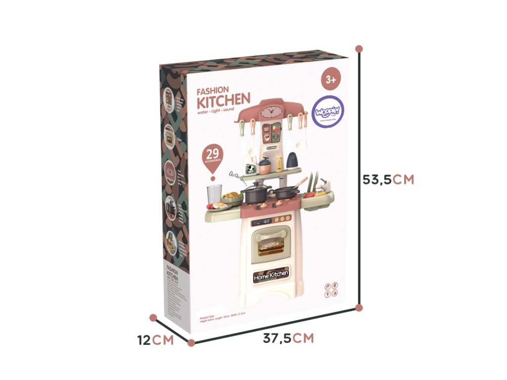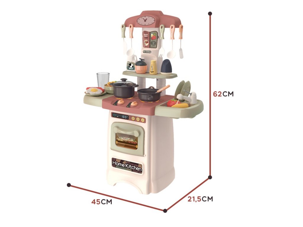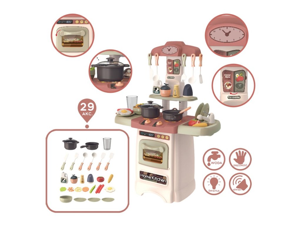 Červená módna domáca kuchyňa značkyWoopie je všetko, čo potrebujemmladý šéfkuchár. Batoľamôžete naplno využiť všetky nook v kuchyni, vďakaotváranie a presúvanie prvky, ako napríklad:rúra,ťuknite na alebogombíky z variča. Vďaka mnohým špeciálnym funkciám bude mať vaše dieťa pocit, že sa nachádza v skutočnej kuchyni. Malý kuchár môže variť nahorákktorélesk a problémyzvuky počas varenia a umývanie riadupod vodovodný kohútik so skutočnou vodou. Sporák je vybavený imitáciou:rúra s displejom itlačidlá,klasické hodiny,tabule s jedálnymi lístkami,drez,ťuknite na,sušička dosiek,pracovná doska,horáky s gombíkmi,polica na príslušenstvo iháčiky na kuchynské náradie. Mnohépotraviny, korenie a kuchynské príslušenstvo napr. vajcia, korenie, taniere, zabezpečí, že vaše dieťa nikdy nenudí sa pri varení je čoraz viac rôznych potravín aorganizovanie hostín s priateľmi. Pamätajte, že deti radi napodobňujú svojich rodičov a hranie rolí ich nesmierne rozvíjapredstavy ikreativita batoľa!