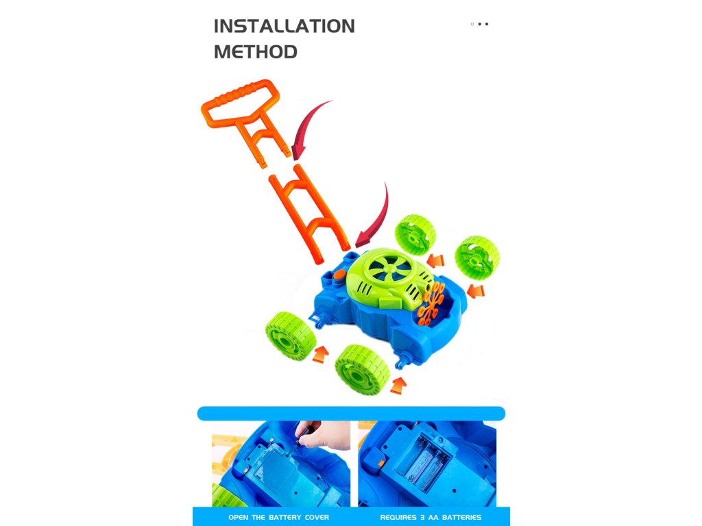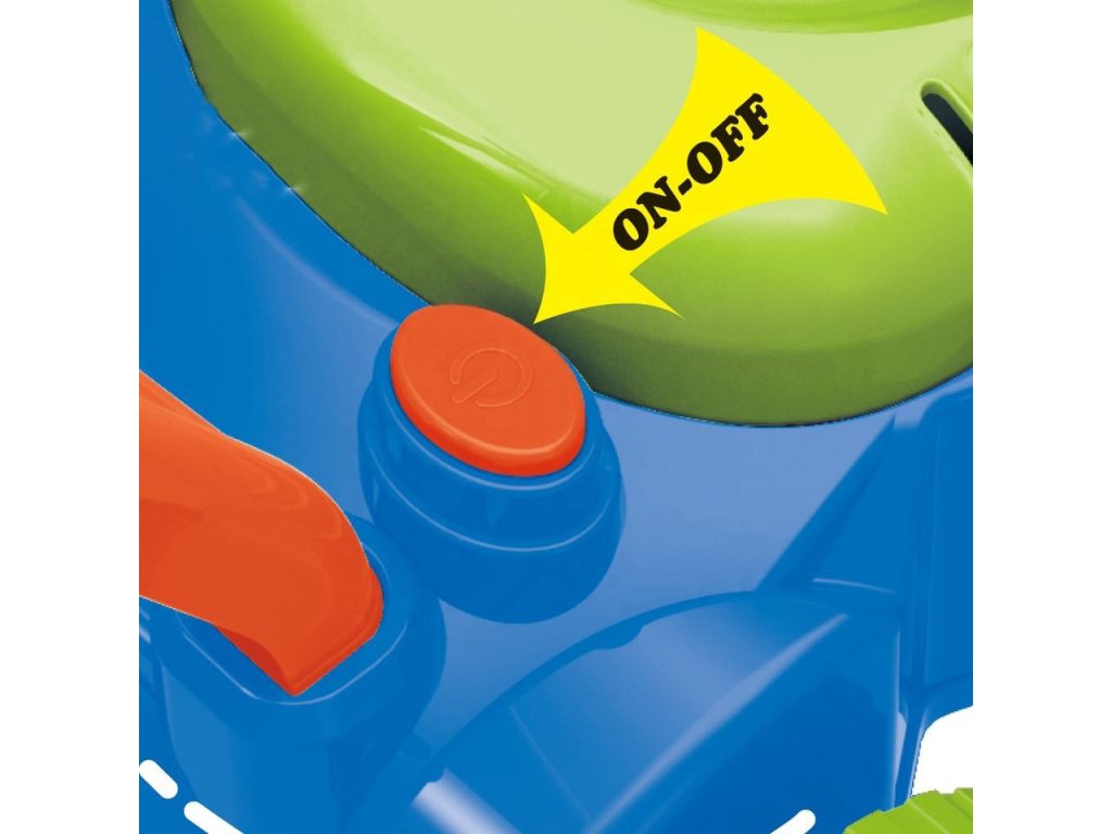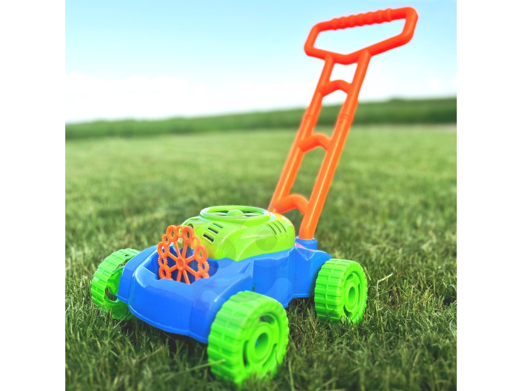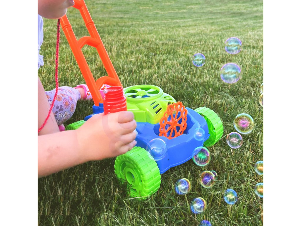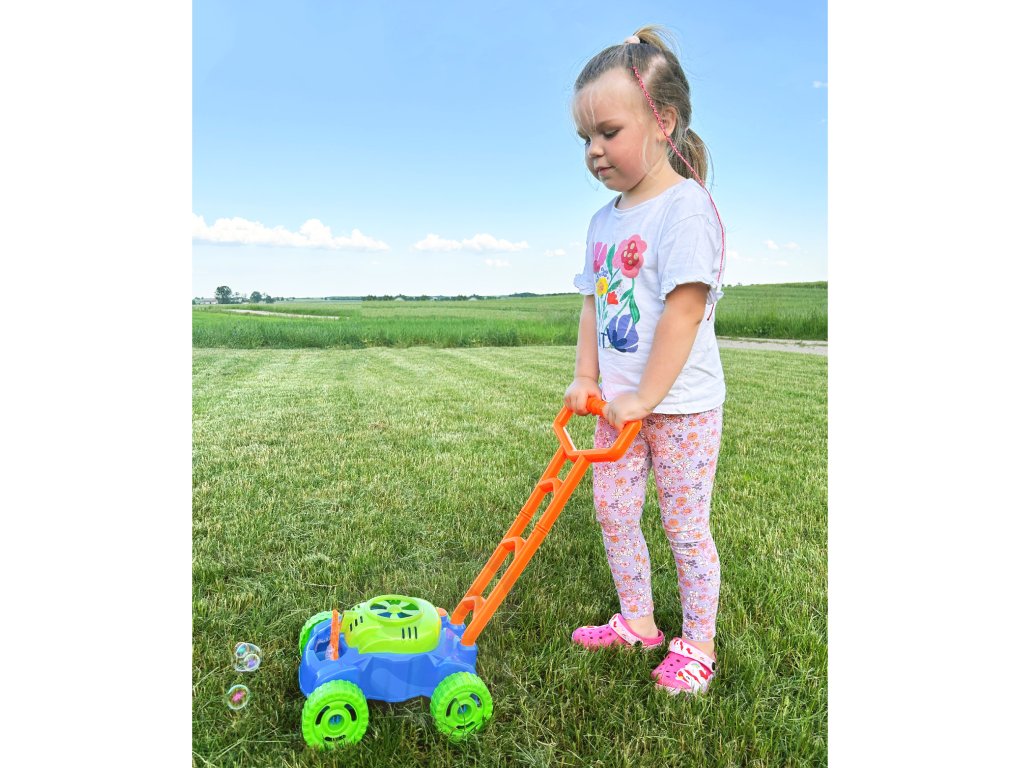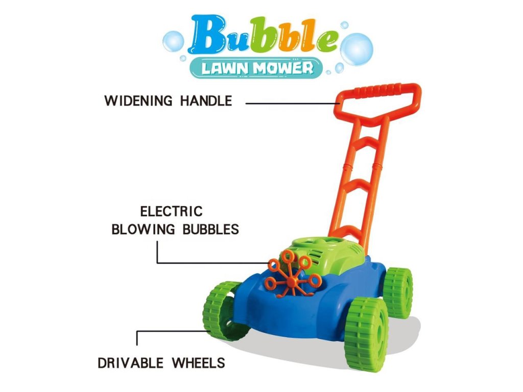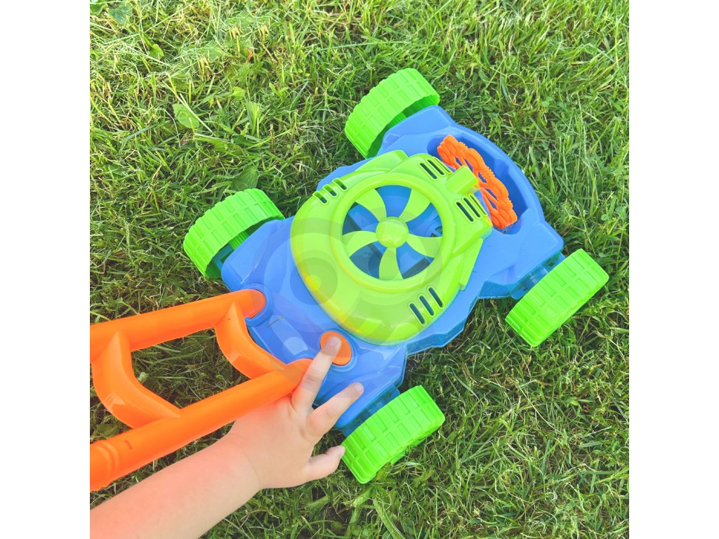 Bublinky sa uvoľňujú automaticky. Malý veterný mlyn sa nachádza v hornej časti krytu motora kosačky, vytvára prúd vzduchu, ktorá je zameraná na 8 rotujúcich krúžkov. Ponoria sa do kontajner na tekutinu aby sa vytvorili bublinky a jedna po druhej skĺznu pod malá tryska. Týmto spôsobom sa bublinky uvoľňujú nepretržite. Vďaka 8 krúžkom hračka produkuje rzároveň veľký počet bublín.Ďalšie výhody kosačky sú zvuky, ktoré vydáva. Zvuky, ktoré počujeme, sú zvuk mydlových bublín a melódia z rozprávky. Na zadných kolieskach sú umiestnené plastové záložky, ktoré počas jazdy terkocze čím napodobňuje zvuk vydávaný skutočným zariadením.Úžasne farebné kosačka je návrh nekonečné zábavné, stimulujúce tvorivosť a rozvoj manuálnych zručností. Môžete pre istotu, že batoľa nebude mať čas na nudu.