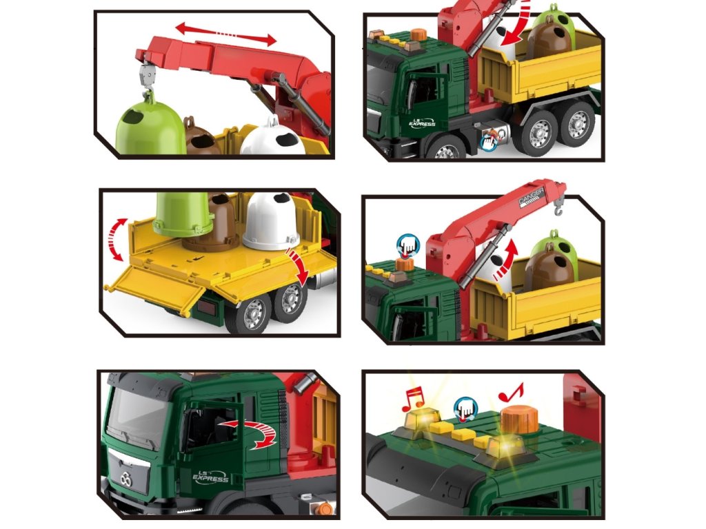 Realistické smetiarske auto s pohyblivým žeriavom je jedinečná hračka pre malých milovníkov mestských vozidiel a poriadku! Tento pevne skonštruovaný model s pohyblivýmprvky a zvukových efektov je nielen zdrojom skvelej zábavy, ale aj poučenia o recyklácii a práci komunálnych služieb.