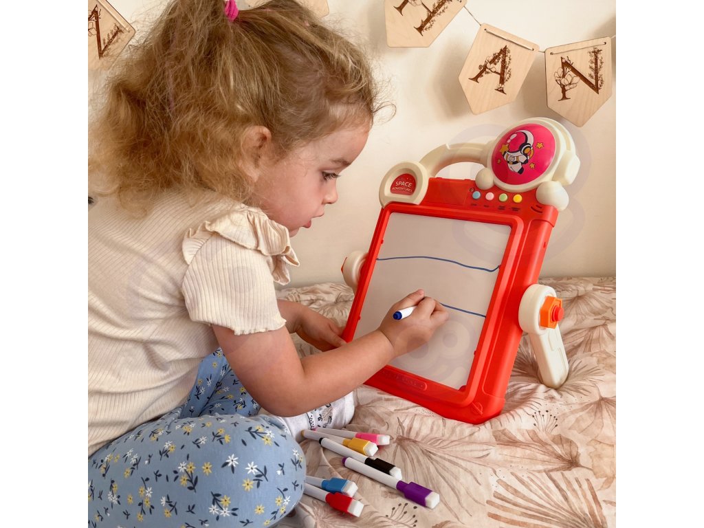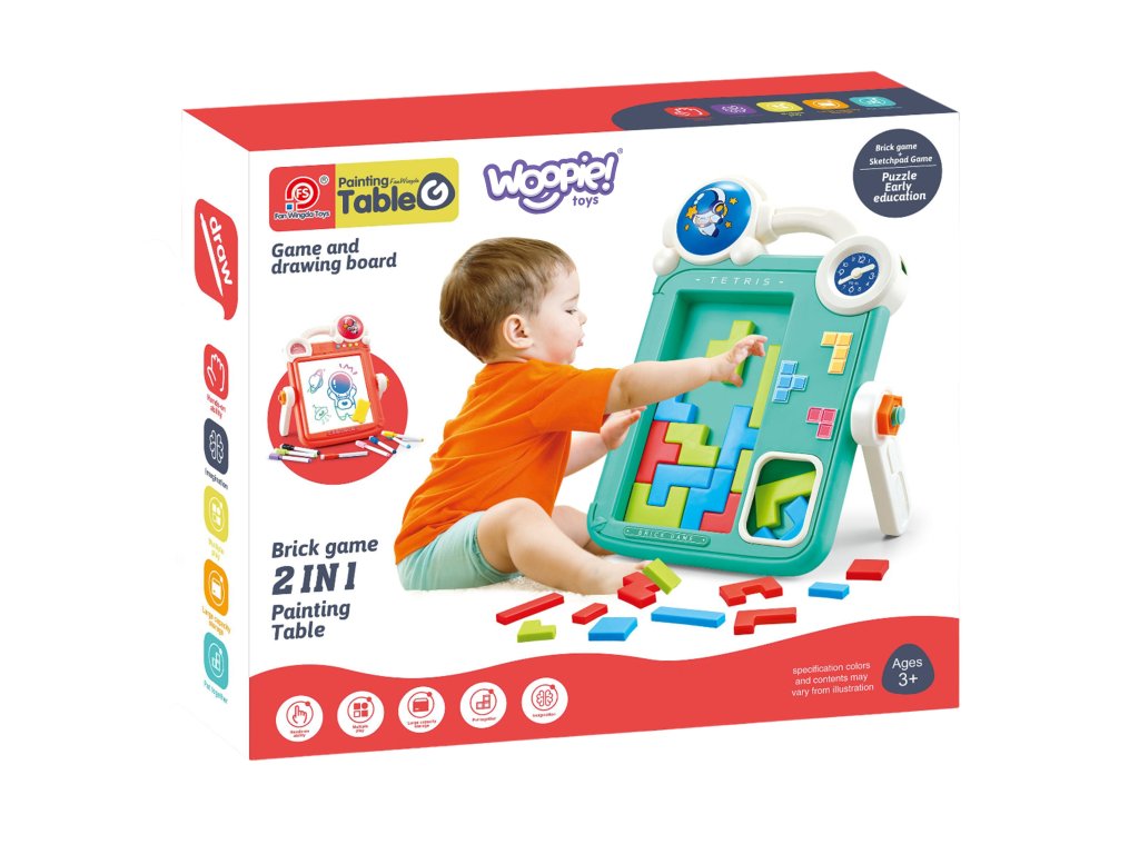 Obojstranná tabuľa a hra Tetris od značkyWoopie je vzdelávacia a hračkárska skladačka 2 v 1, ktorá bude pre vaše dieťa prínosom v mnohých ohľadoch. Kresliaca tabuľa obsahuje8 značiek,huba na vymazanie a36 stierateľných kariet na vyfarbovanie alebo písanie. Kreslenie spríjemňujú 4 tlačidlá s hudbou. Na druhej strane hracej dosky sa nachádza zábavná skladačka Tetris, ktorá zaujme každé dieťa a rozvíja predstavivosť a kreatívne myslenie. Farebné bloky možno ukladať na seba vertikálne, plošne a vytvárať tak zaujímavé postavy a obrázky alebo samostatné 3D štruktúry.
