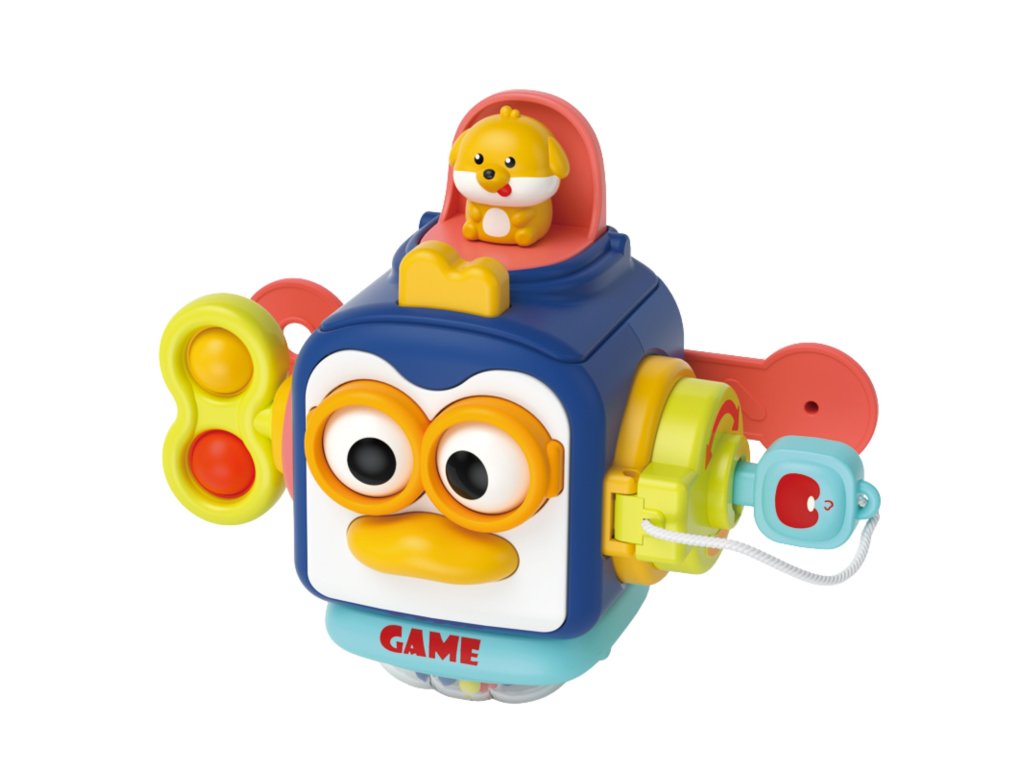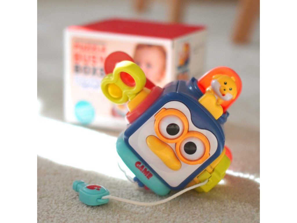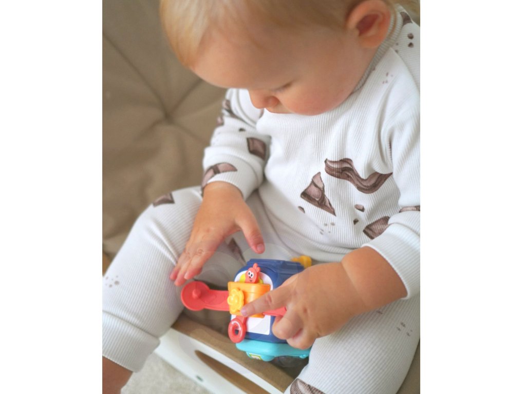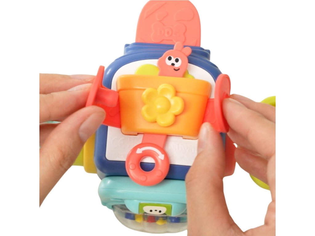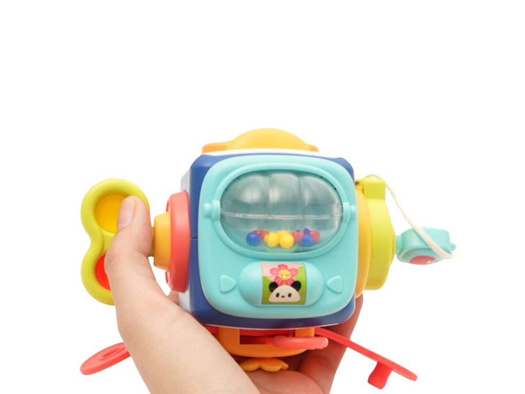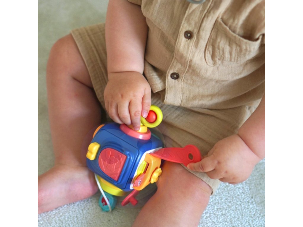 - Jasné a žiarivé farby kocky spolu s rôznymi tvarmi, textúrami a zvukmi poskytujú zmyslovú stimuláciu a podporujú rozvoj motorických zručností a koordinácie ruka-oko