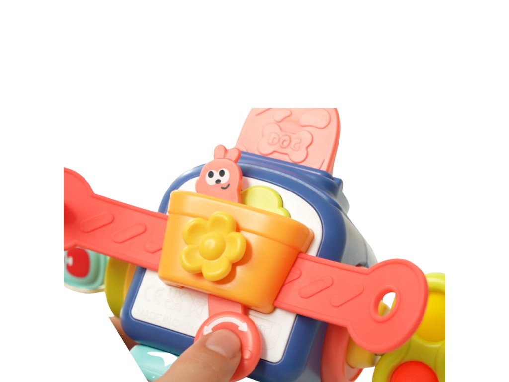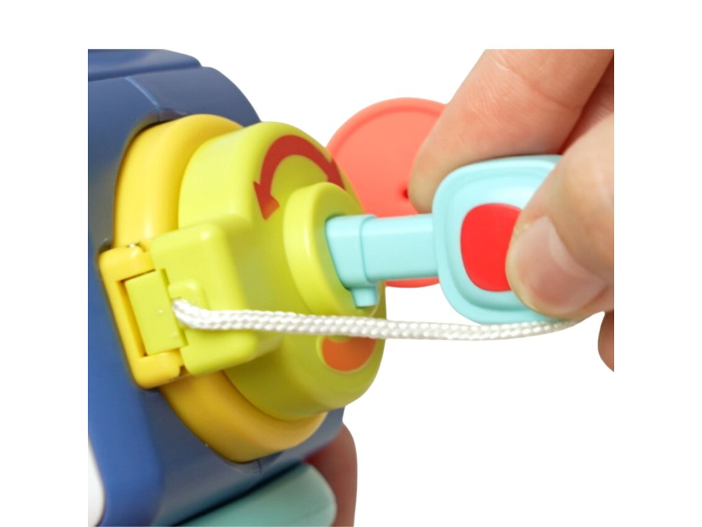 - - Na pravej strane hračky sa nachádza tajomný obrázok, ktorý dieťa uvidí po otočení kľúča. Pre bezpečnosť najmenších je kľúč pevne pripevnený k hračke na šnúrke.