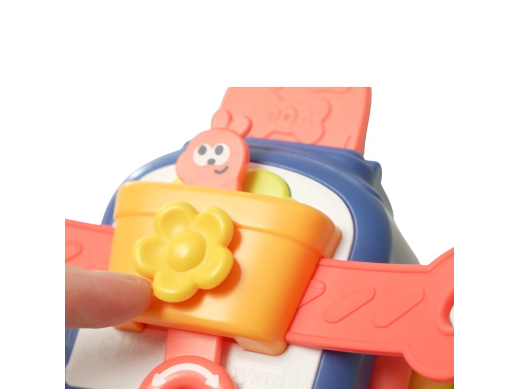 - - Na zadnej stene hračky je kvetináč so zajacom. Vďaka časti vyčnievajúcej zo spodnej časti kvetináča môže dieťa zajačikom pohybovať. Okrem toho z bohov kvetináča vyčnievajú dva konce popruhov, ktorých potiahnutie spôsobí, že sa kvetináč roztočí