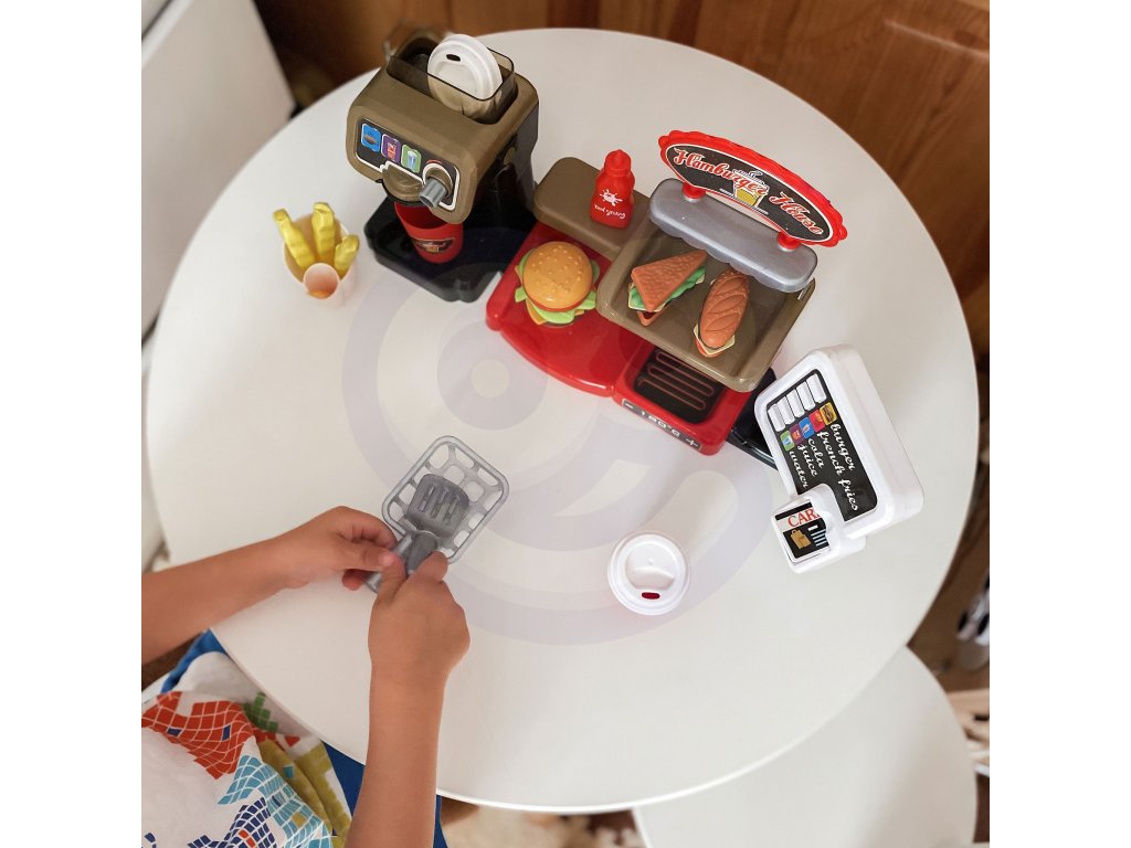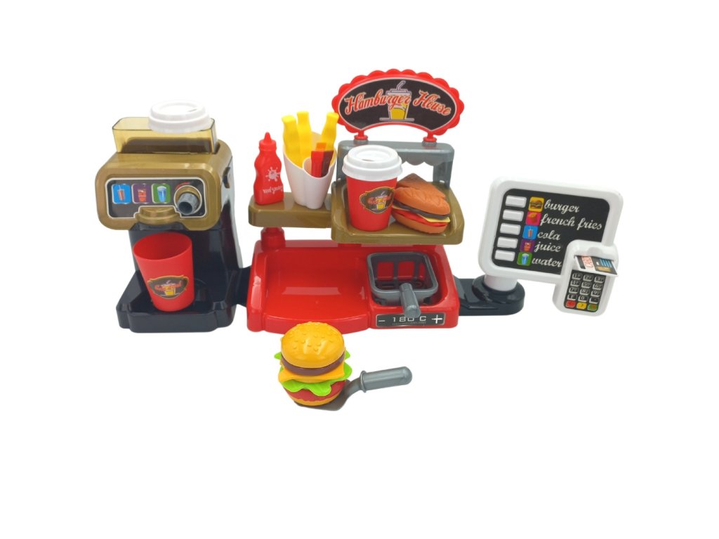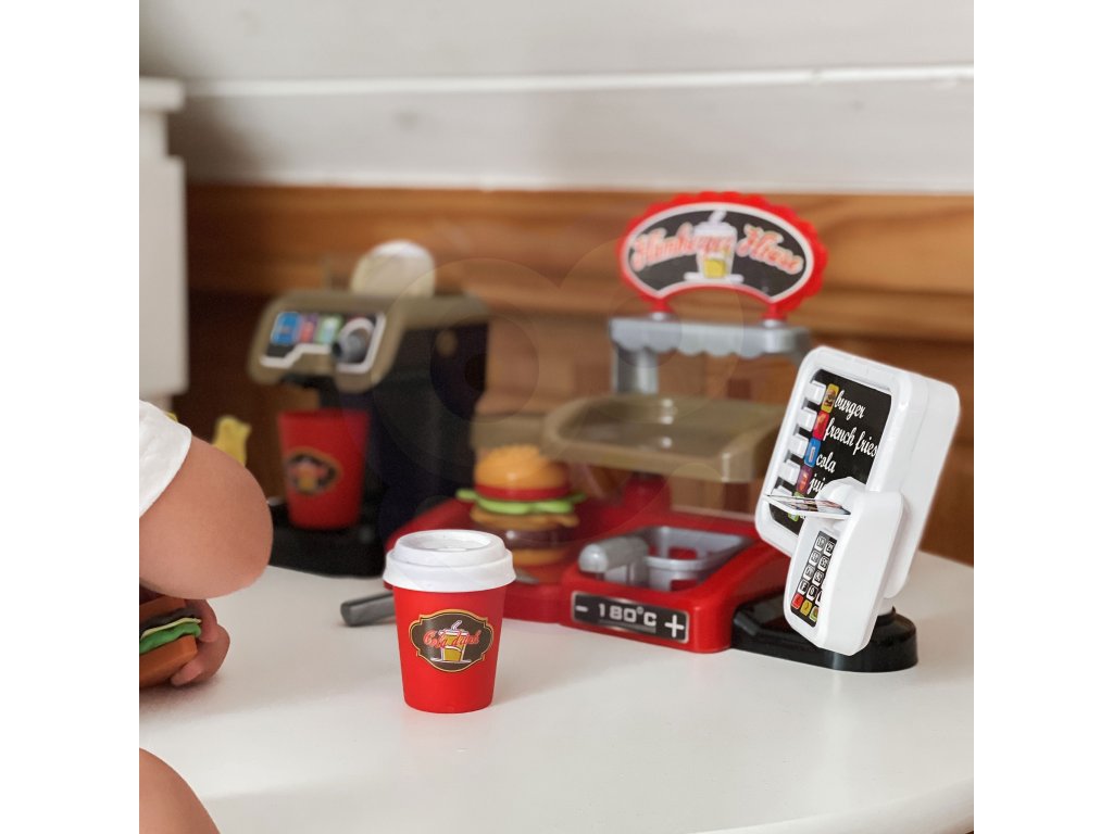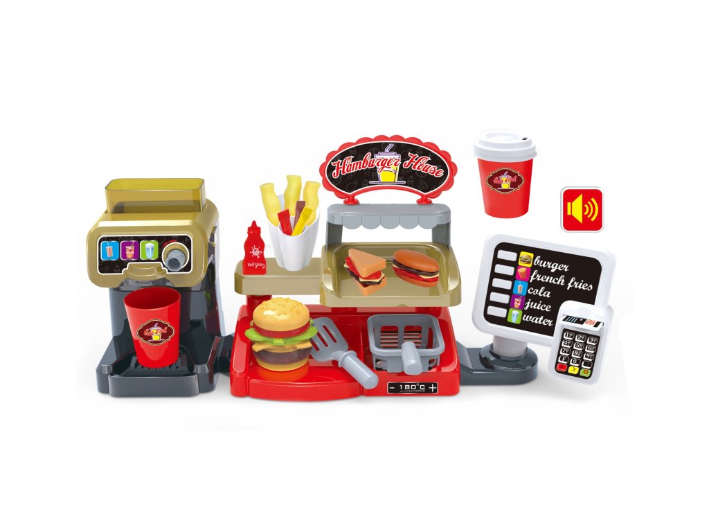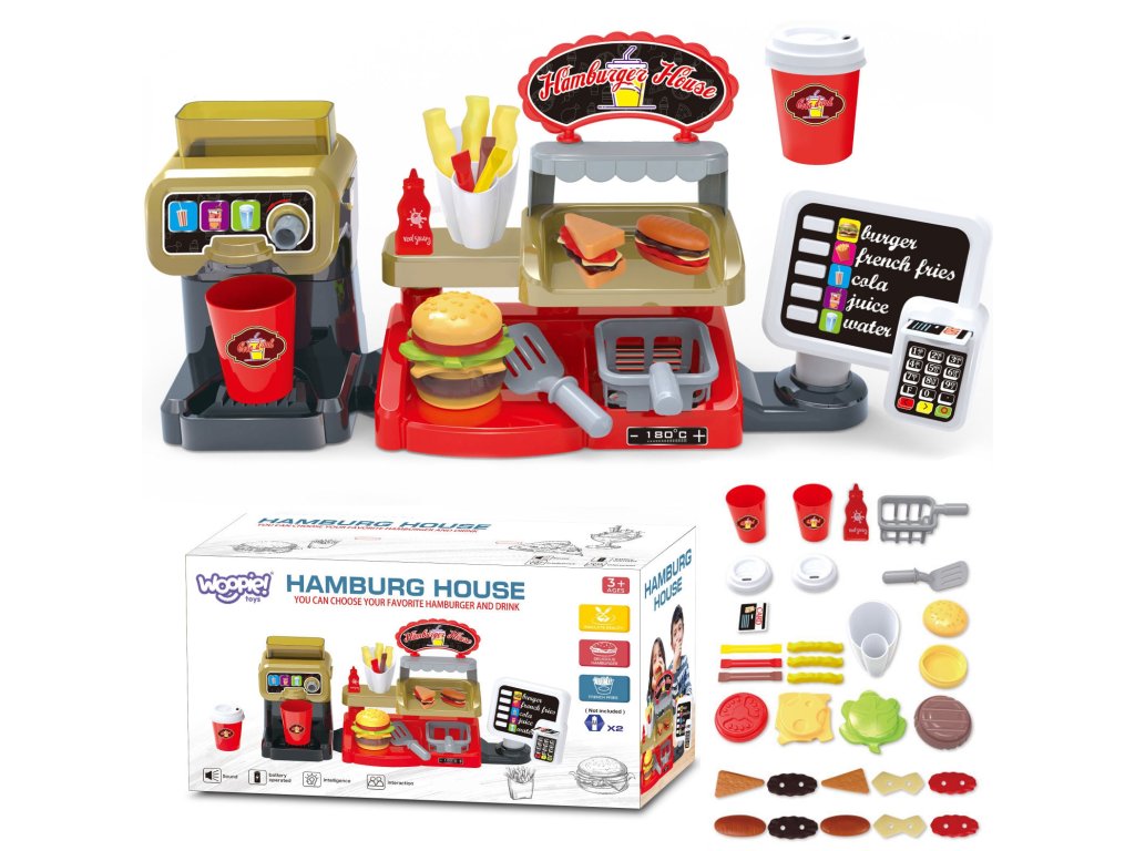Fast Food XXL s pokladňou a distribútorom od značkyWOOPIE umožní vášmu dieťaťu rozvinúť fantáziu. Vaše dieťa si môže zahrať rolové hry s kamarátmi pri hre na predavača a zákazníka. Vaše dieťa môžeponuka hranolky, ktoré predtýmsa usmaží sám; šálka nápoja, ktorývylieva sa; hamburger, toast a sendvič. Burger a sendvič môžu byťzarovnať svojím spôsobom. Môžete naliať do dávkovačaskutočná voda. Ak to chcete urobiť, postavte pohár, otočte kolieskom a nalejte skutočnú vodu - táto funkcia vaše dieťa určite poteší! Zákazník môžeplatba kreditnou kartou na hračkyčo po vymazaní dávazvuk. Pokladňa má tiež špeciálnefunkcia zvuk a stlačením príslušného tlačidla môžemepočuť názvy menu ako: "hamburger", "hranolky", "kola", "džús" a "voda". Kompletná interaktívna súprava pre vaše dieťa, ktorá mu umožnístelesňujú na skutočného predajcu, ktorý sa rozvíjapredstavivosť ikreativita. Zaručuje mnoho hodín zábavy s priateľmi!