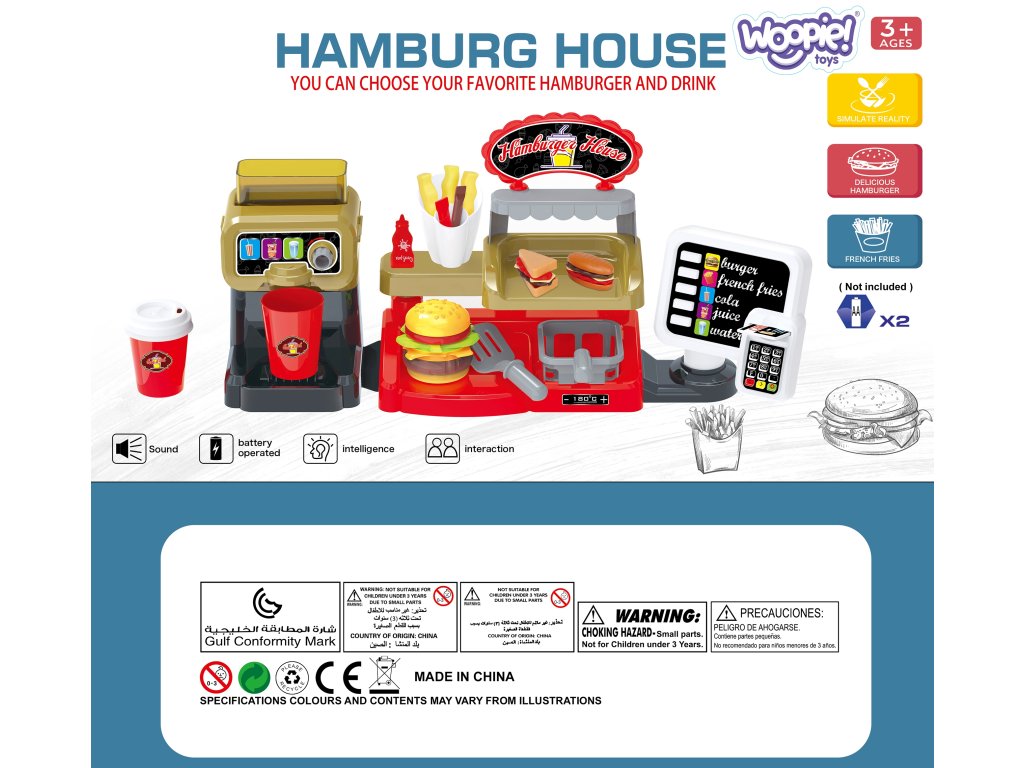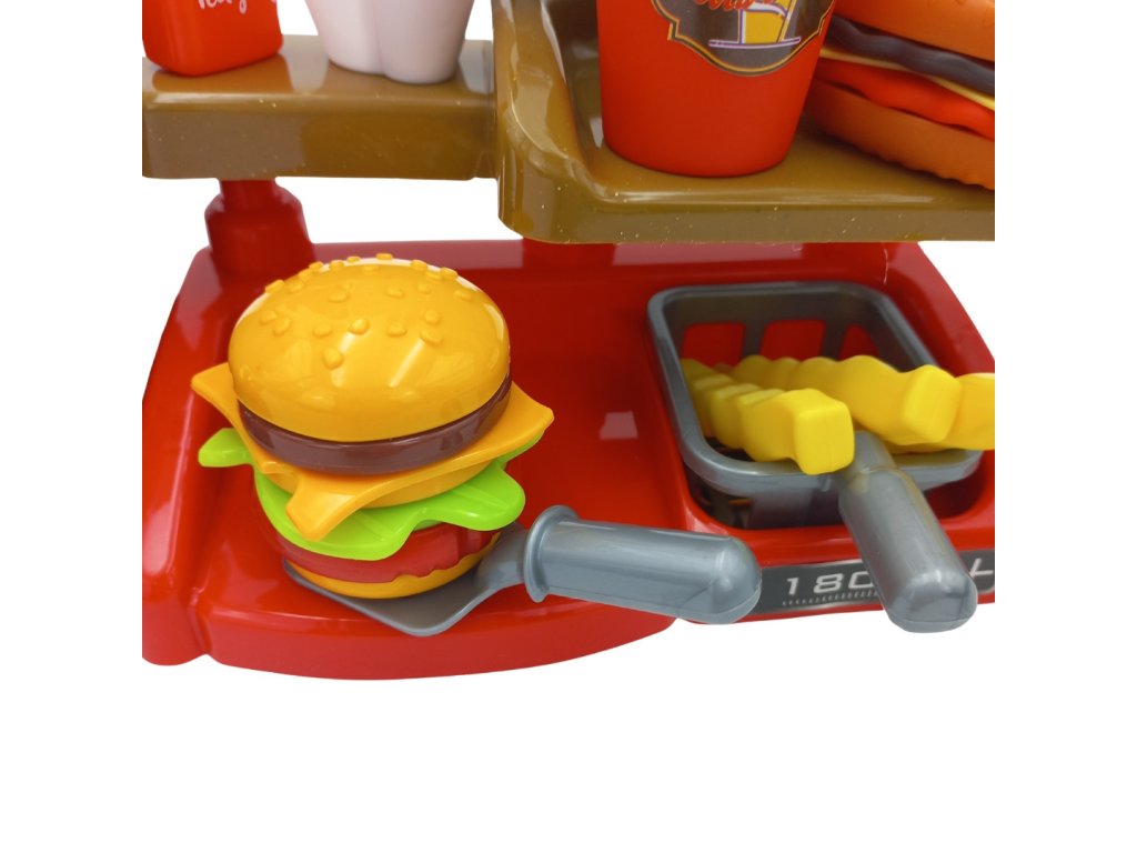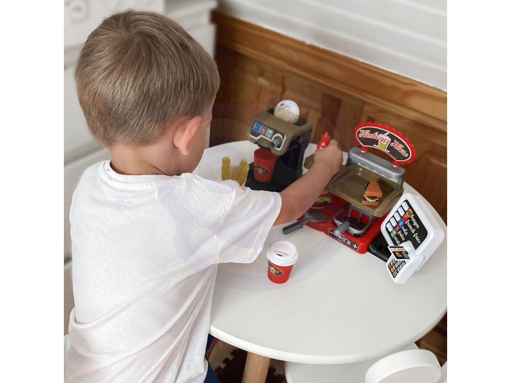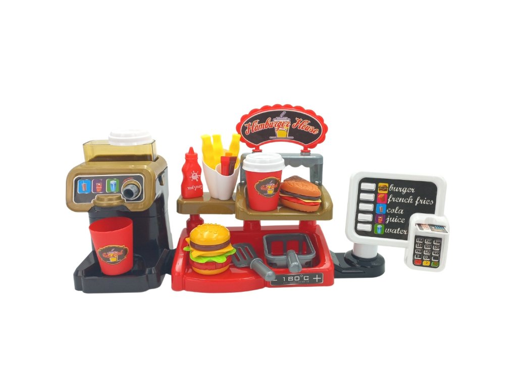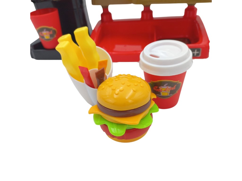 Fast Food XXL s pokladňou a distribútorom od značkyWOOPIE umožní vášmu dieťaťu rozvinúť fantáziu. Vaše dieťa si môže zahrať rolové hry s kamarátmi pri hre na predavača a zákazníka. Vaše dieťa môžeponuka hranolky, ktoré predtýmsa usmaží sám; šálka nápoja, ktorývylieva sa; hamburger, toast a sendvič. Burger a sendvič môžu byťzarovnať svojím spôsobom. Môžete naliať do dávkovačaskutočná voda. Ak to chcete urobiť, postavte pohár, otočte kolieskom a nalejte skutočnú vodu - táto funkcia vaše dieťa určite poteší! Zákazník môžeplatba kreditnou kartou na hračkyčo po vymazaní dávazvuk. Pokladňa má tiež špeciálnefunkcia zvuk a stlačením príslušného tlačidla môžemepočuť názvy menu ako: "hamburger", "hranolky", "kola", "džús" a "voda". Kompletná interaktívna súprava pre vaše dieťa, ktorá mu umožnístelesňujú na skutočného predajcu, ktorý sa rozvíjapredstavivosť ikreativita. Zaručuje mnoho hodín zábavy s priateľmi!