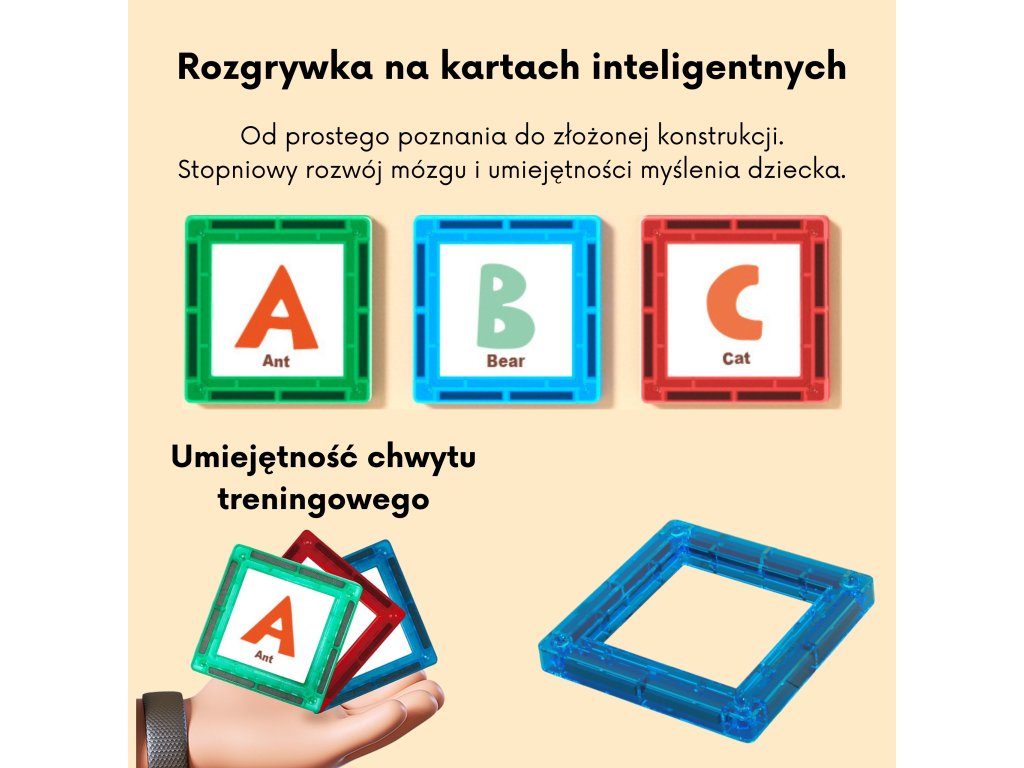Magnetické vzdelávacie kocky sú jedinečnou hračkou, ktorá deťom otvára svet učenia a tvorivosti. Pevné farebné prvky umožňujú jednoduché stavanie rôznych štruktúr, čím sa zároveň rozvíja predstavivosť a manuálne zručnosti. Súprava obsahuje kartičky s písmenami, ktoré podporujú učenie abecedy počas tvorivej hry. Silné magnetické spoje umožňujú stavať mnoho typov stavieb a zaisťujú stabilitu a bezpečnosť počas hry.