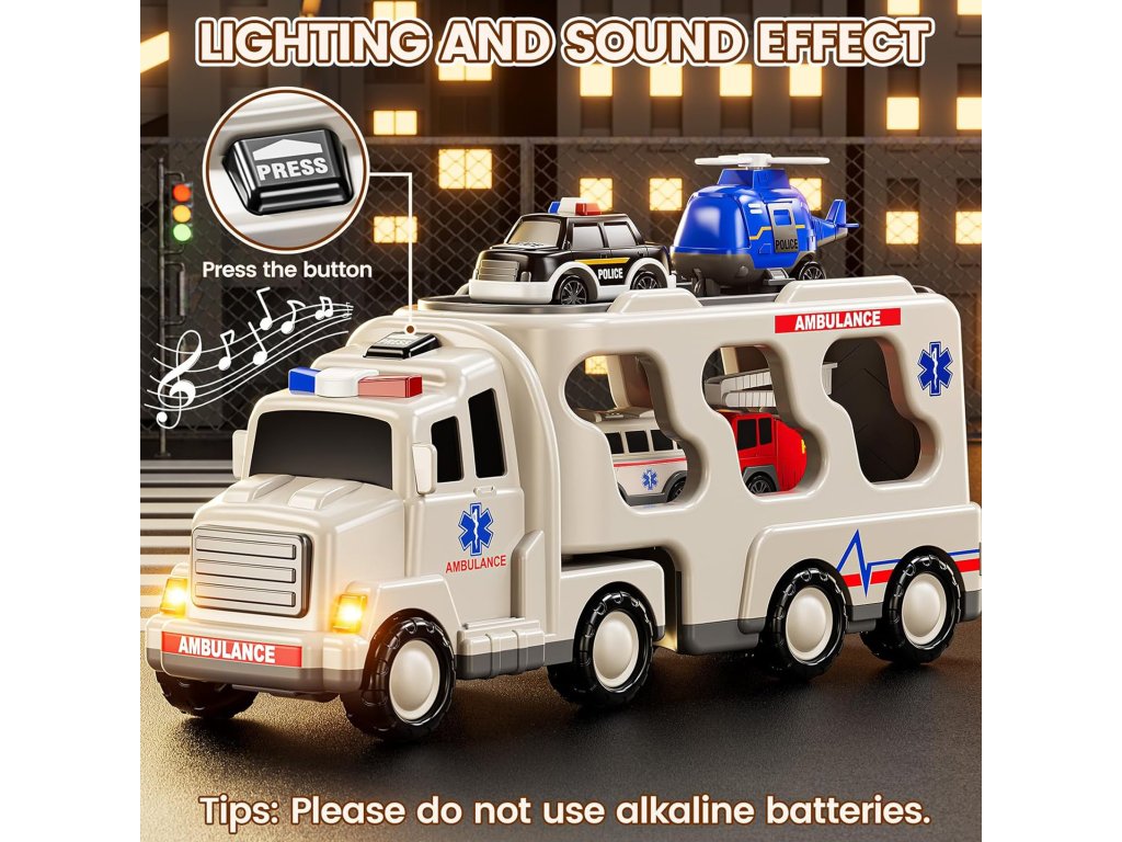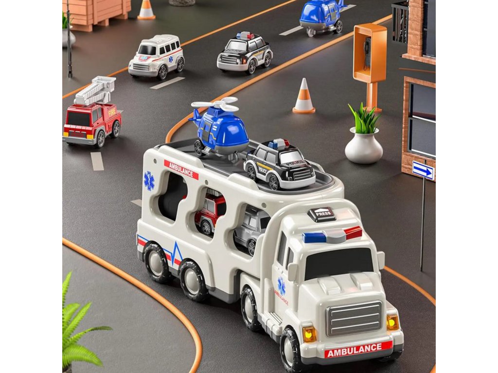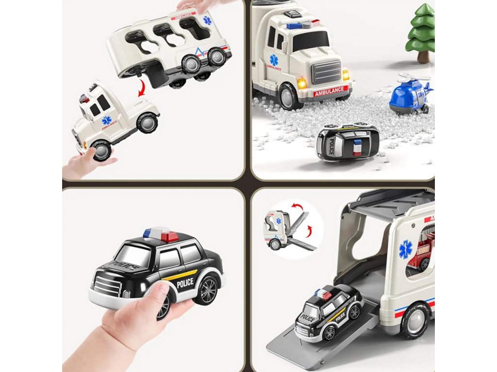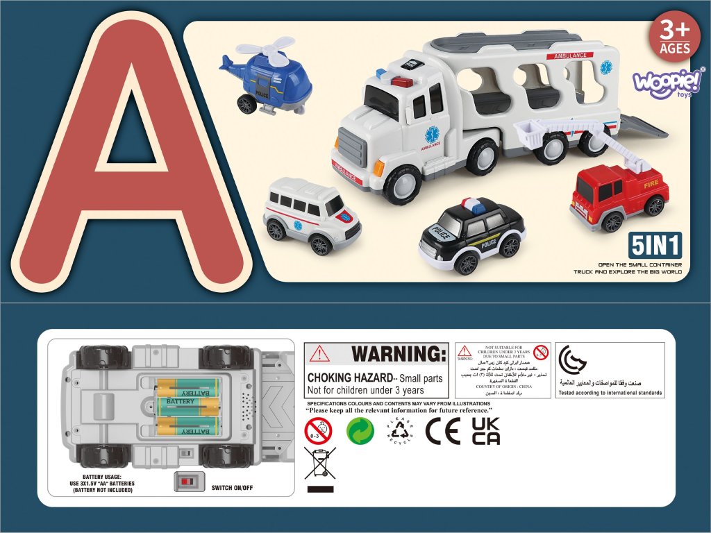 Veľký záchranársky kamión + 4 autá od značiekWoopie Navrhnuté s ohľadom na malých nadšencov hasičský zbor, polícia, sanitkatáto hračka5 v 1 je ideálna množinapre každého malého plavčíka! Stlačte tlačidlo na vrchole kabíny nákladného vozidla, aby ste videlijasné blikajúce svetlá a realistické sirényveľmi atraktívne pre deti. Súprava obsahujeveľké prepravné vozidlo a štyrizáchranné vozidlá: hasičské auto, policajné auto, policajný vrtuľník, sanitka. Každé vozidlo má pohyblivé časti, vďaka ktorým sa vaše dieťa bude cítiť ako skutočný hrdina počas záchranných operácií! Súprava je skvelým nápadom na darček k narodeninám, Vianociam alebo iným príležitostiam.