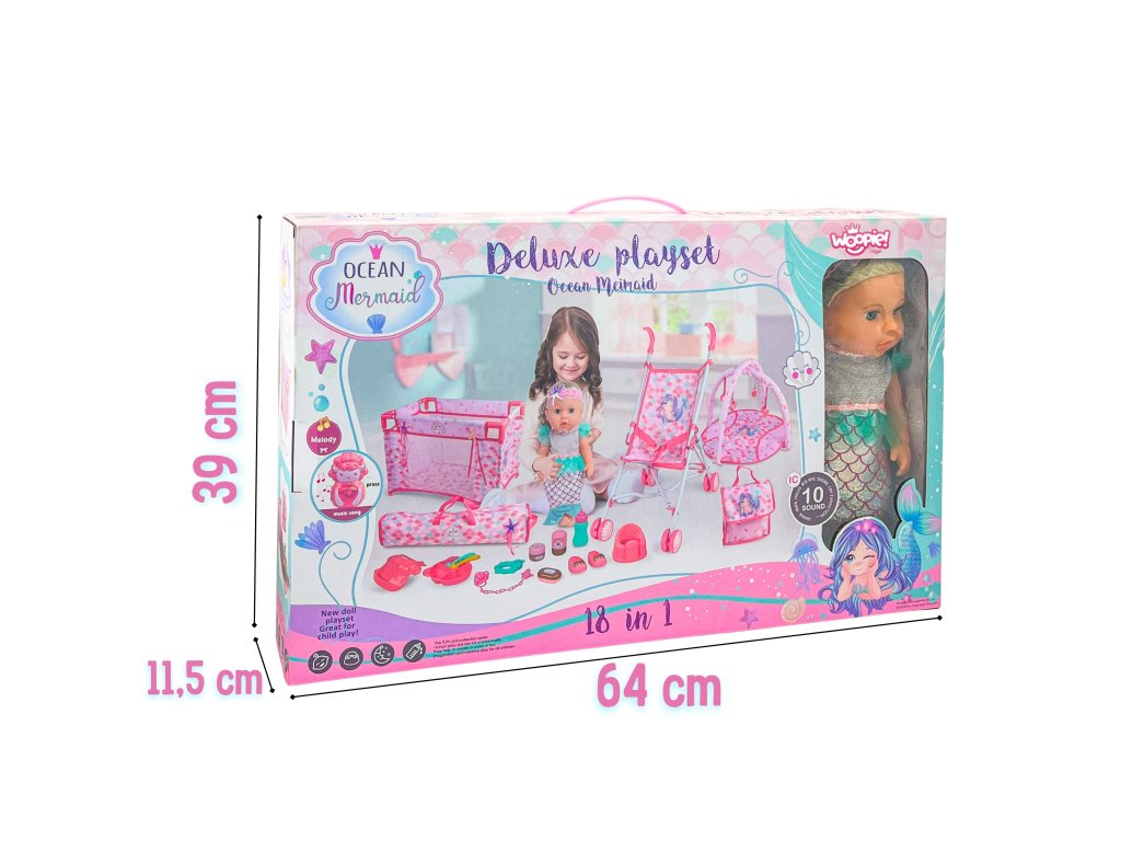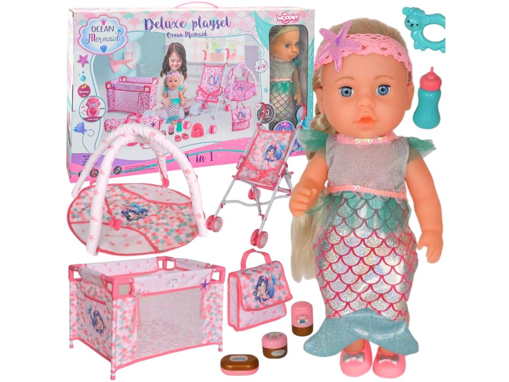 Objavte rozprávkový svet morských dobrodružstiev s jedinečnou sadouLuxusná hracia súprava Oceánska morská panna 18 v 1! Táto bohatá sada je zárukou hodín tvorivej a radostnej hry. Najväčším lákadlom je očarujúceBábika morská pannaktorá vynakladá až10 rôznych zvukova poteší každého malého fanúšika oceánu. Súprava obsahuje kočík, postieľku, tašky a množstvo doplnkov na zábavnú starostlivosť a hranie rolí. Je to ideálny darček, ktorý podporí rozvoj predstavivosti, empatie a sociálnych zručností vášho dieťaťa!