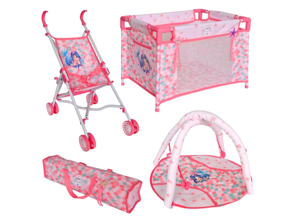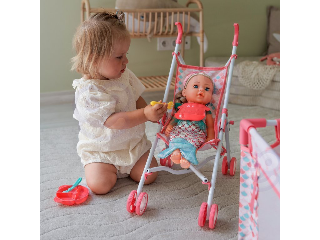- - Kočík-parasol - ľahký, skladací, v ružovej farbe s motívom morskej panny.