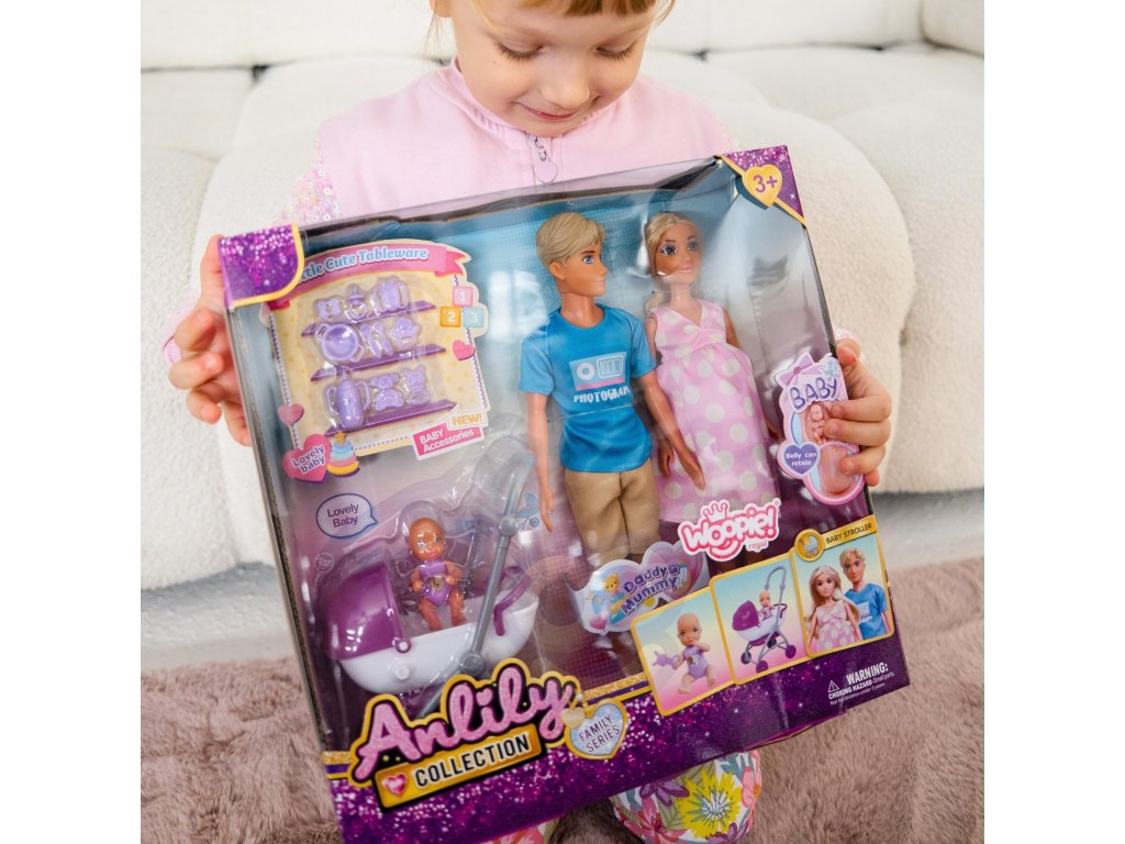 Rodinná súprava s bábikami od značky Woopie je skvelou voľbou pre deti, ktoré milujú tematické hry a každodenné hranie spoločenských rolí. Súprava obsahuje bábiku tehotnej mamičky, štýlového otecka, bábätko a bohatú sadu doplnkov a funkčný kočík na prepravu dieťatka.Súbor odkazuje na scény z rodinného života, čo umožňuje dieťaťu vytvárať vlastné príbehy, ktoré ho učia empatii, zodpovednosti a starostlivosti o iných. Bábika matka je oblečená vočarujúce šaty s ružovými bodkamia jej bruško obsahuje odnímateľnú figúrku dieťaťa. Figúrka otca je moderný otec v štýlovom tričku. Dieťa v kočíku a drobné doplnky, ako naprfľaša, miska, cumlík alebo plienky, ktoré zvyšujú realistickosť a zapájajú dieťa do tvorivosti.