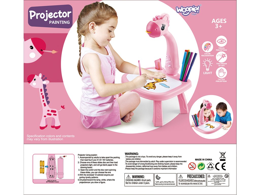 Stimulujte predstavivosť svojho dieťaťa pomocou rozkošného kresliaceho projektora od značkyWoopie! Tento farebný a interaktívny stôl v tvare žirafy je vybavený projektorom a tabuľou na suché mazanie zabudovanou v hornej časti. Stôl zobrazuje farebné obrázky, zatiaľ čo dieťa ich kreslí na papier alebo na tabuľu. Vďaka ľahkej konštrukcii, rozprávkovému dizajnu a priloženým fixkám a vzorom sa kreslenie stane obľúbenou zábavou každého batoľaťa.