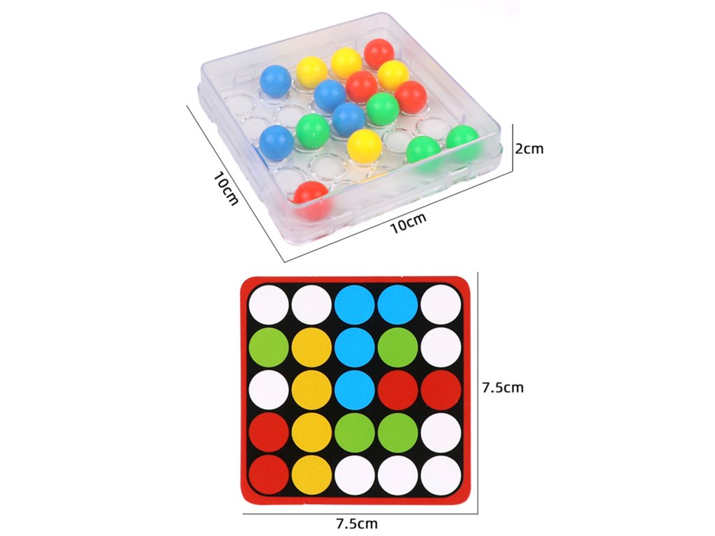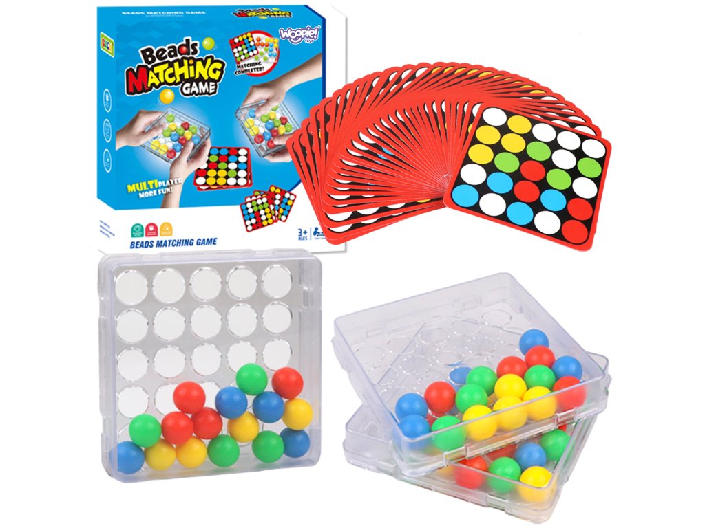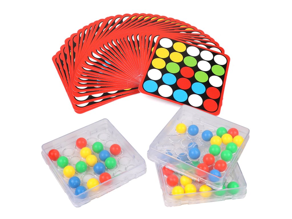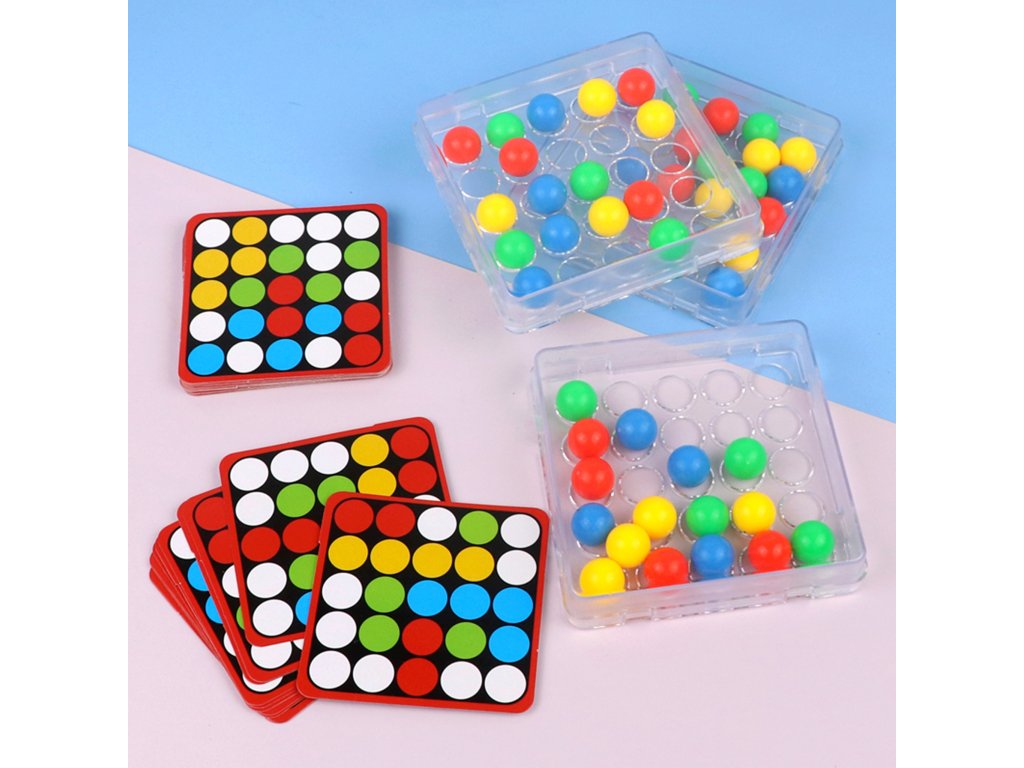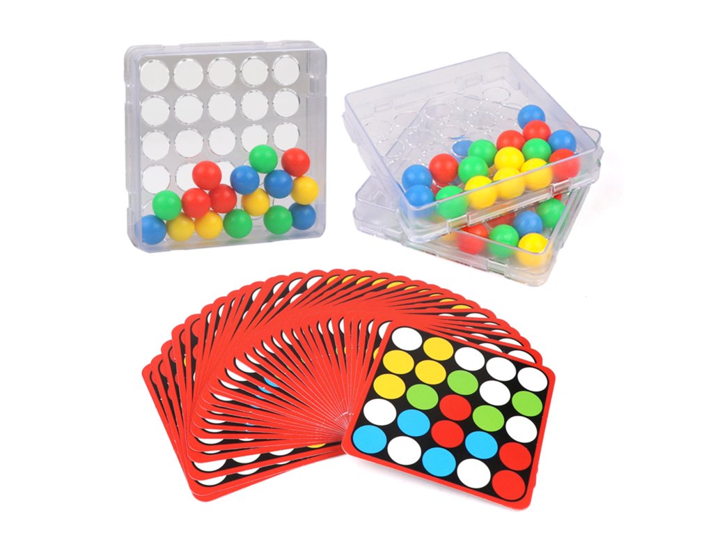 Základňa s kruhovými otvormi umožňuje presúvanie farebných guľôčok v krabici len pomocou prstov.Každá karta navyše obsahuje na zadnej strane univerzálnu čiernobielu šablónu, ktorú si deti môžu vyfarbiť a vytvoriť vlastnú mozaiku.