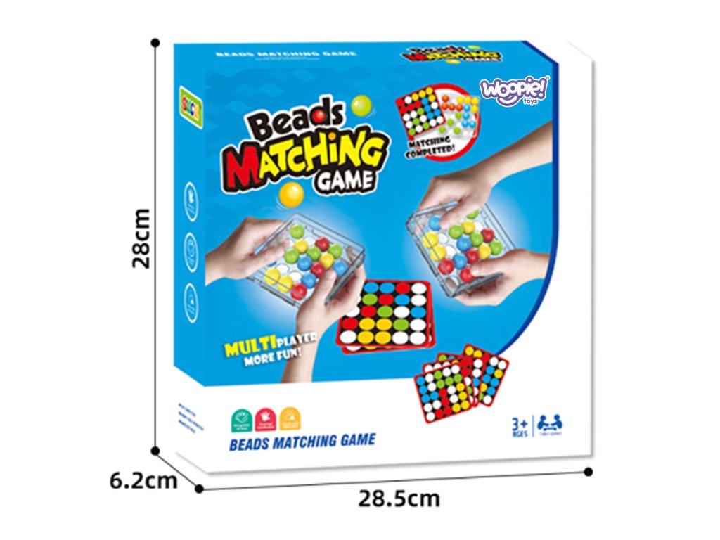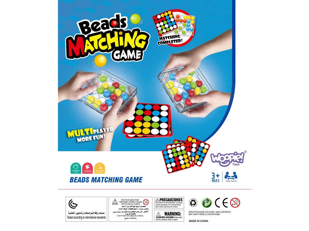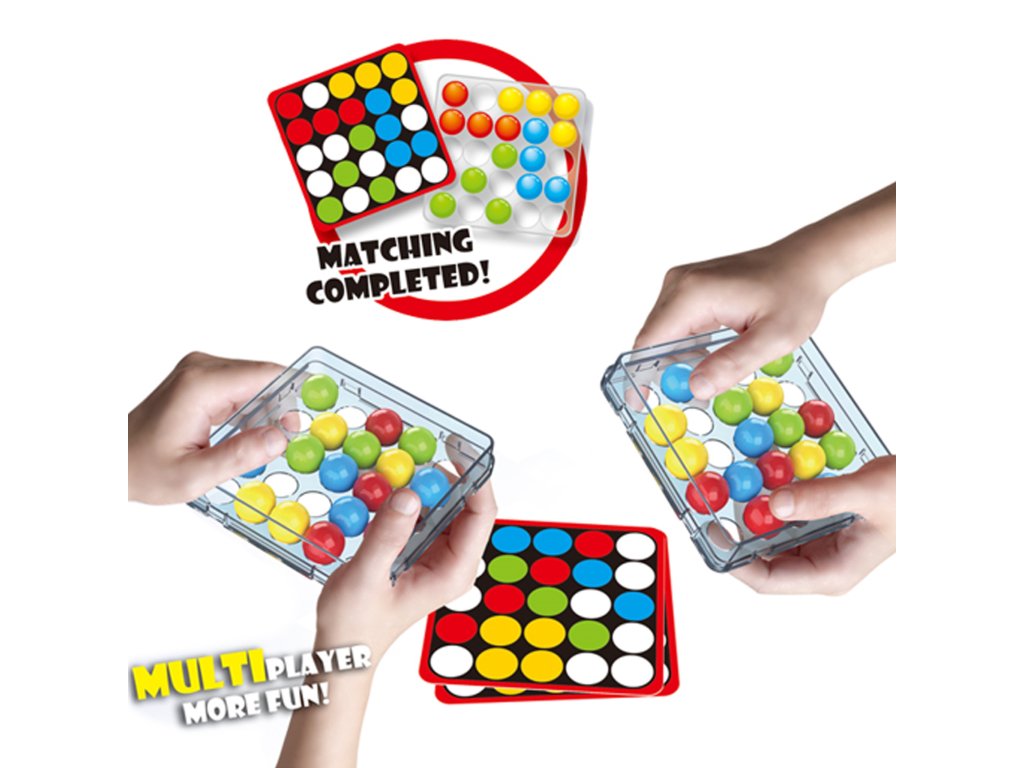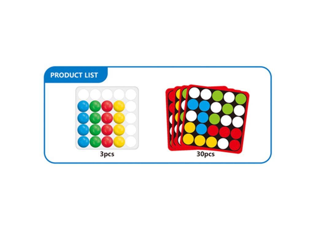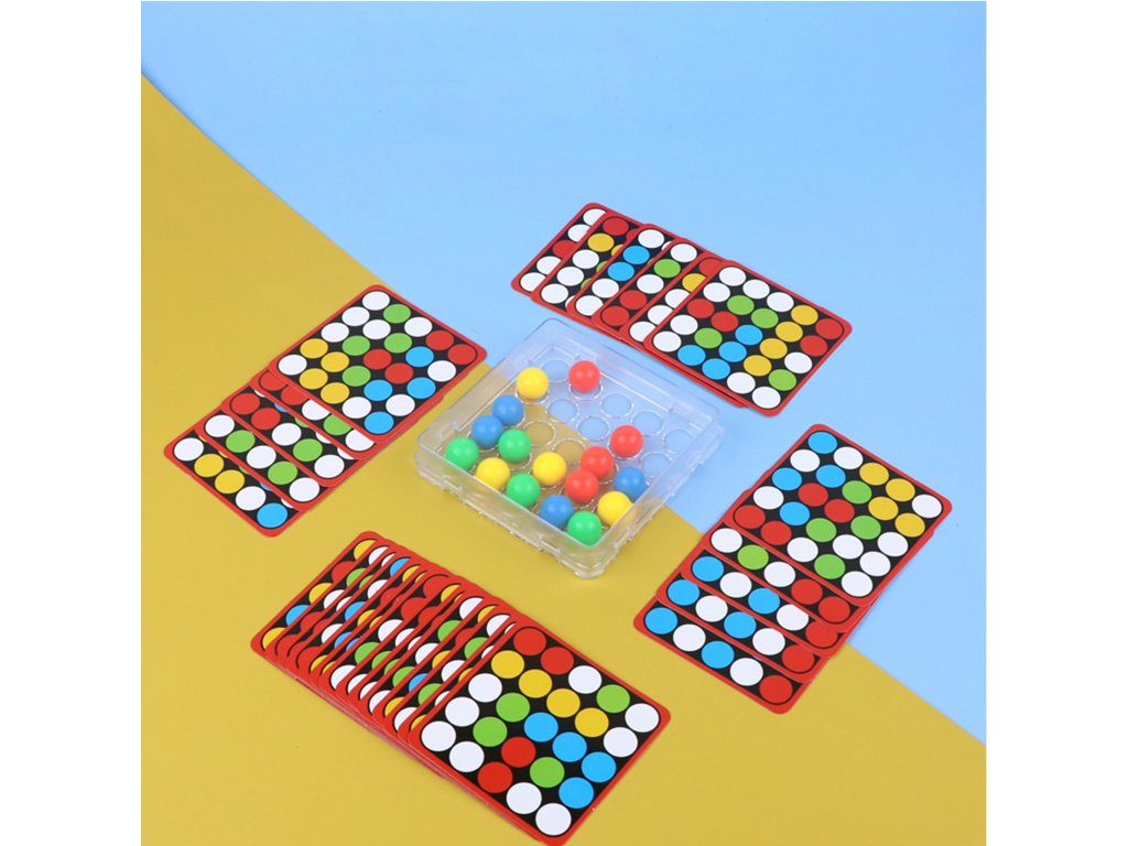 Základňa s kruhovými otvormi umožňuje presúvanie farebných guľôčok v krabici len pomocou prstov.Každá karta navyše obsahuje na zadnej strane univerzálnu čiernobielu šablónu, ktorú si deti môžu vyfarbiť a vytvoriť vlastnú mozaiku.