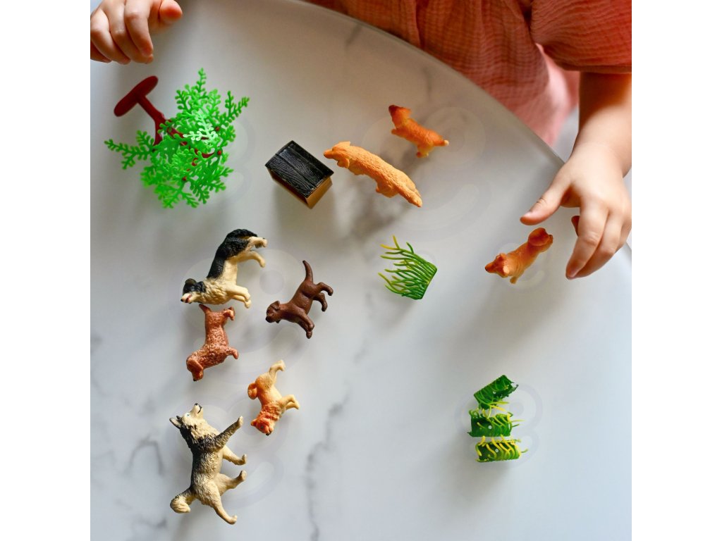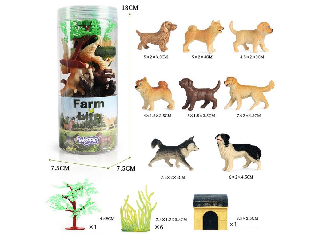 Súbor obrázkov od značkyWOOPIE je ideálna sada pre každého fanúšika zvierat. Súprava obsahuje6 psovastrom, 6 rastlín a psia búda. Realistický vzhľad figúrky sa zväčšiamalá zberateľská kolekcia,plniť vzdelávaciu funkciu aposkytovať zábavu vďaka čomu si batoľa rozšíri svojepredstavivosť a tvorivosť.