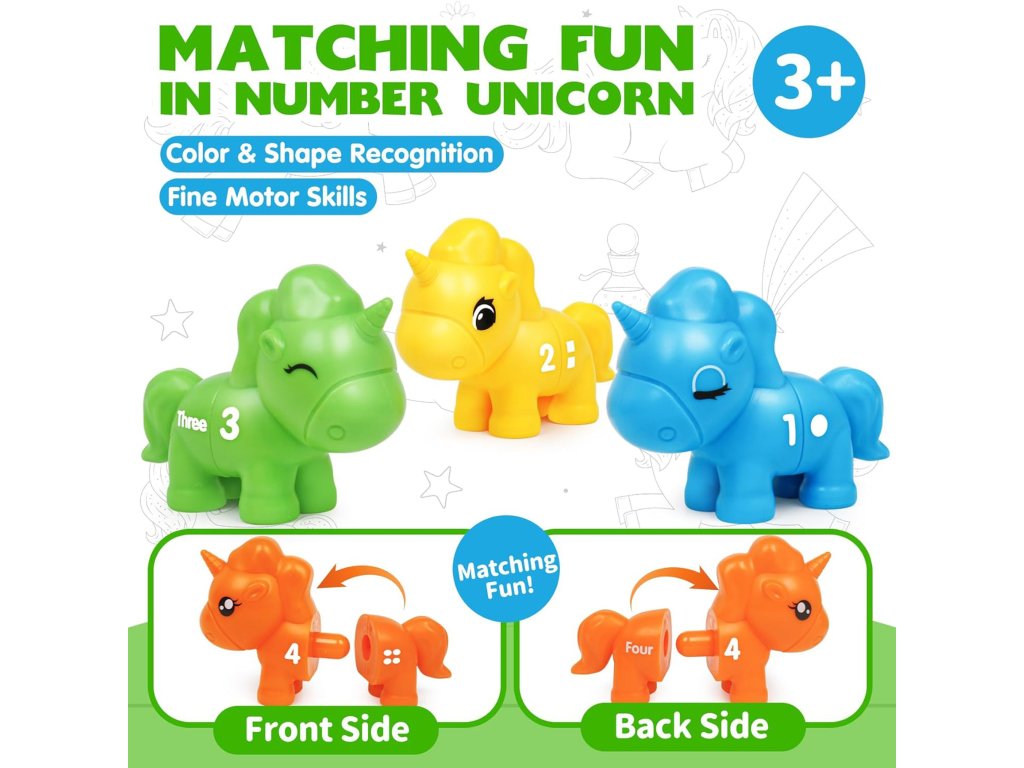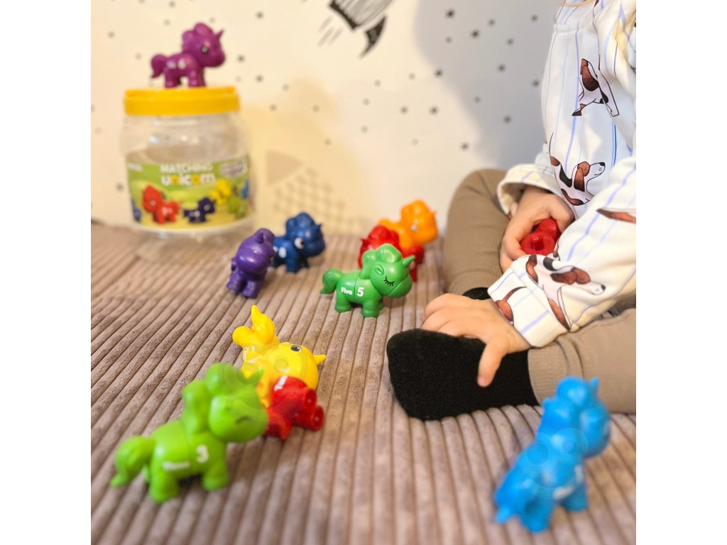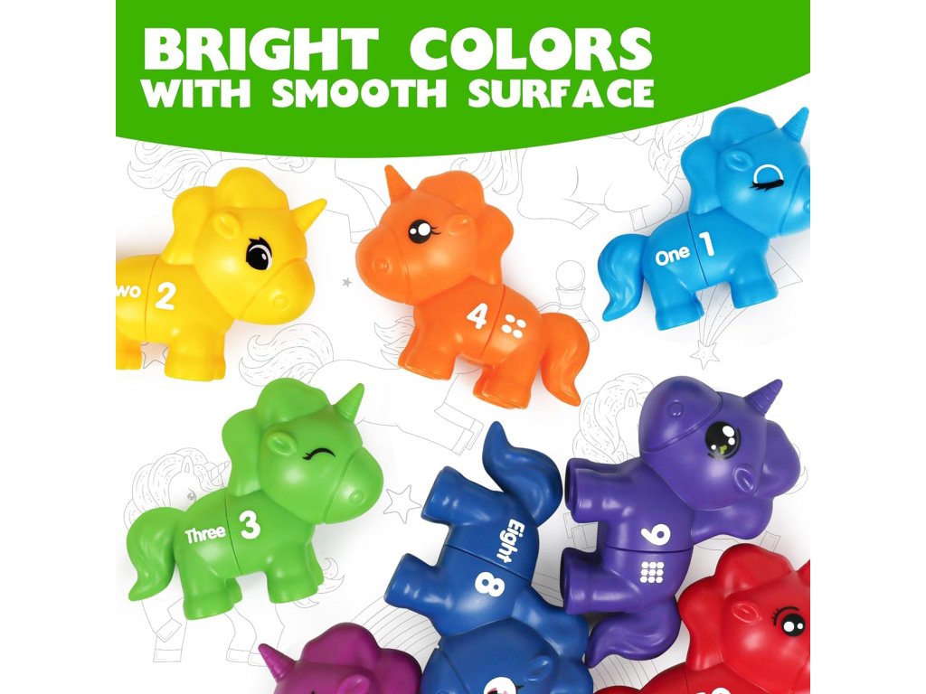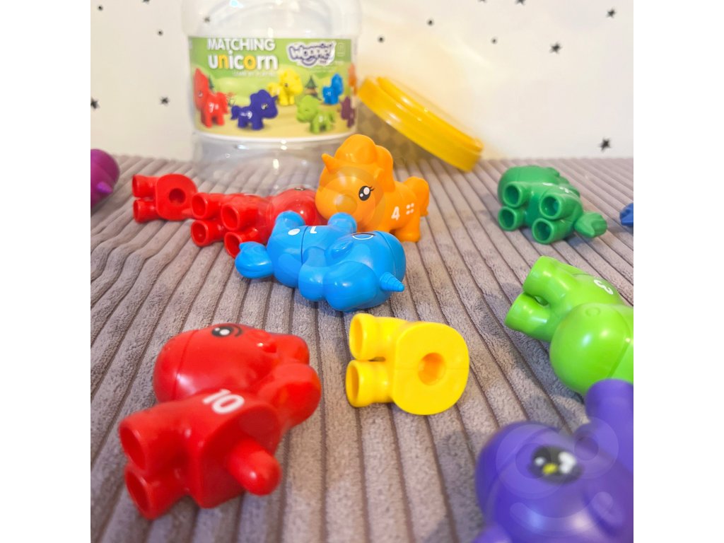 Vzdelávacia hračka "Match the Numbers" je kreatívna hračka, ktorá vaše dieťa prenesie do čarovného sveta jednorožcov. Pri hre môžu batoľatá spájať rôzne časti jednorožcov, priraďovať ich k sebe podľa farieb, čísel alebo tvarov. Je to nielen skvelá forma zábavy, ale aj rozvíjajúca hračka, ktorá stimuluje manuálne zručnosti, postreh a logické myslenie vášho dieťaťa. Súprava pozostáva z farebných jednorožcov a je navrhnutá tak, aby deťom poskytla hodiny pútavej a poučnej hry.