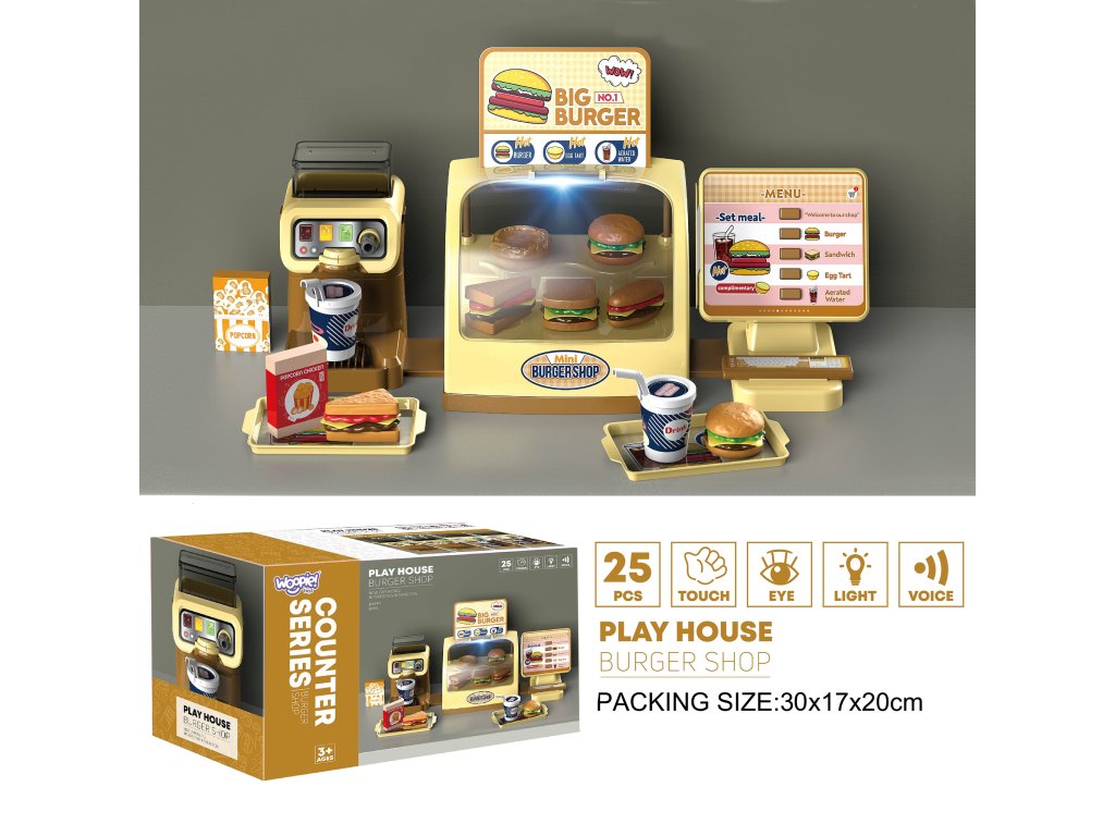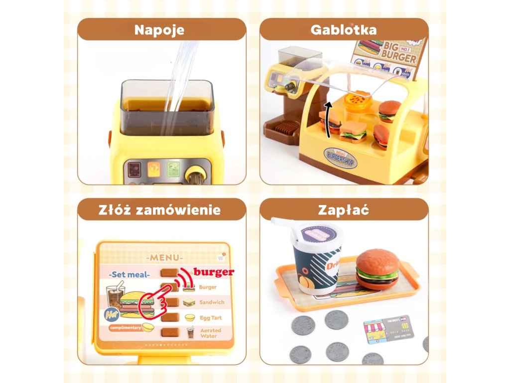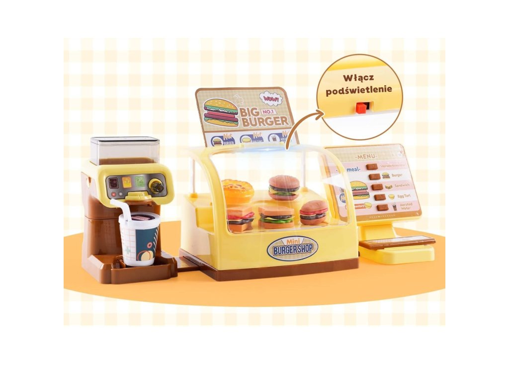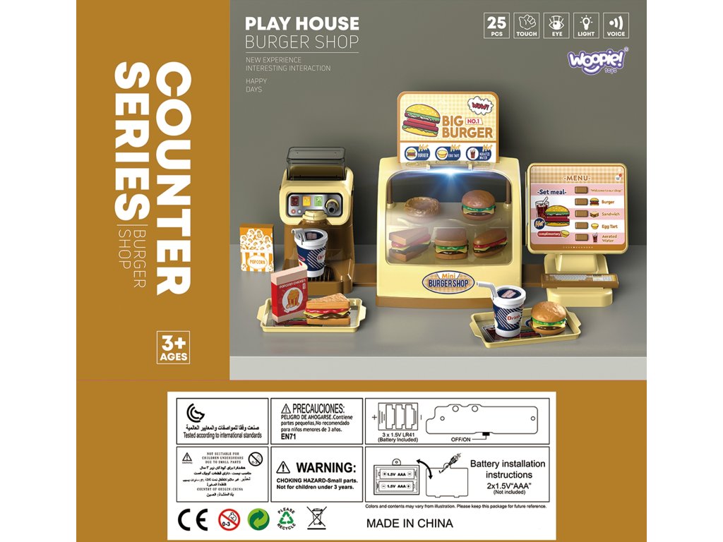 Mini predajňa hamburgerov "BIG BURGER" od značkyWOOPIE je skvelá sada na hranie. Môžemeslúžiť zákazníkomktorí si vyberajú jedlápriamo z osvetleného pultu! Máobrazovka s tlačidlami ktoré nám obchod ponúkazvukové efekty! Môžeme naliať vodu dodávkovač a nalejte umiestňujú sa do špeciálne navrhnutých pohárov so slamkou. Súprava rozvíja zručnostimanuálna zručnosť, predstavivosť, kreativita a schopnosť samostatného myslenia.