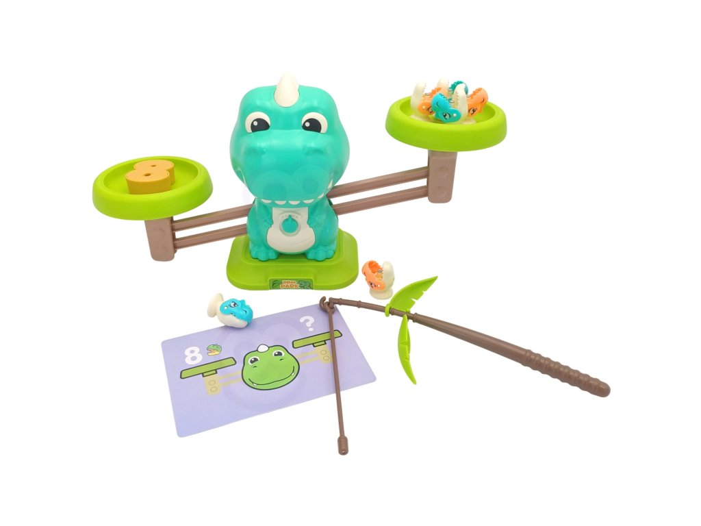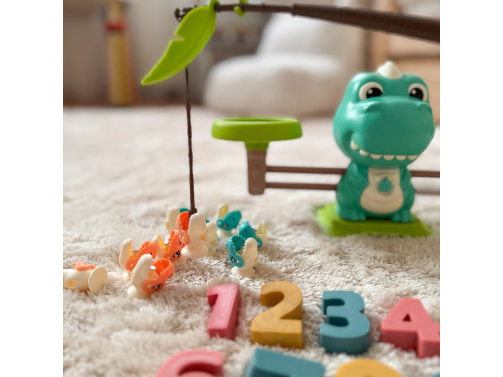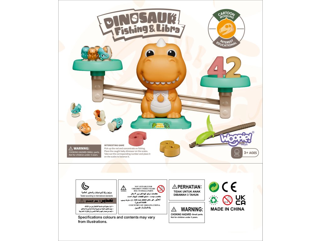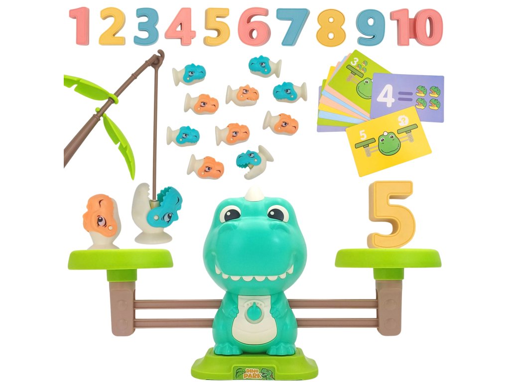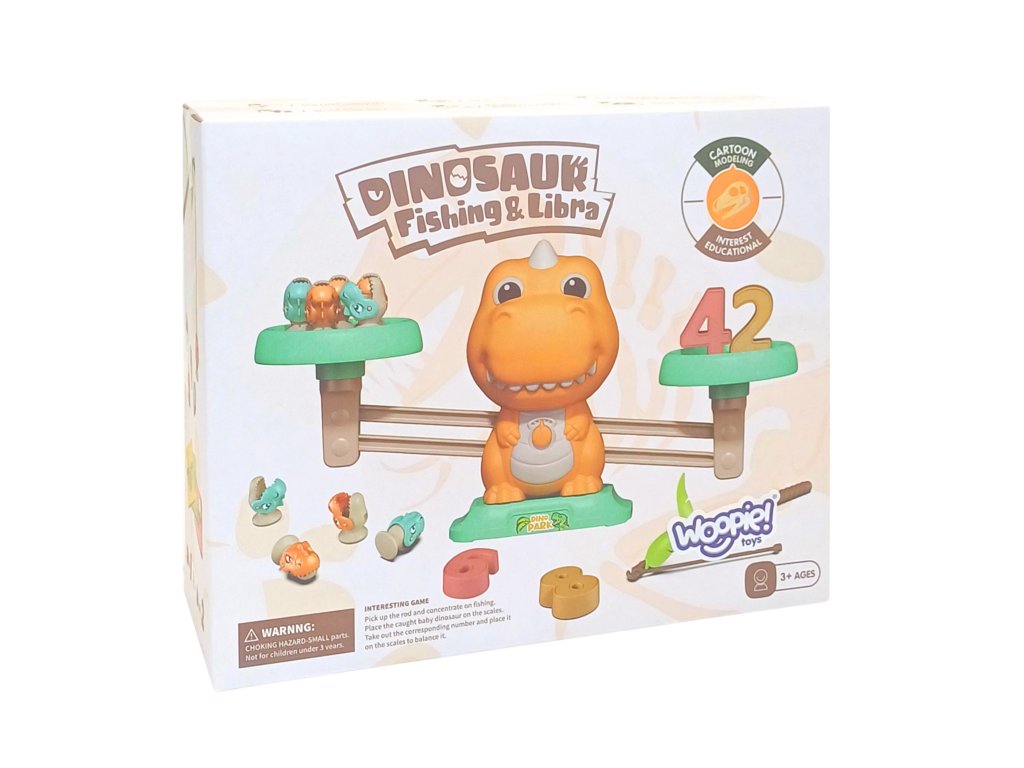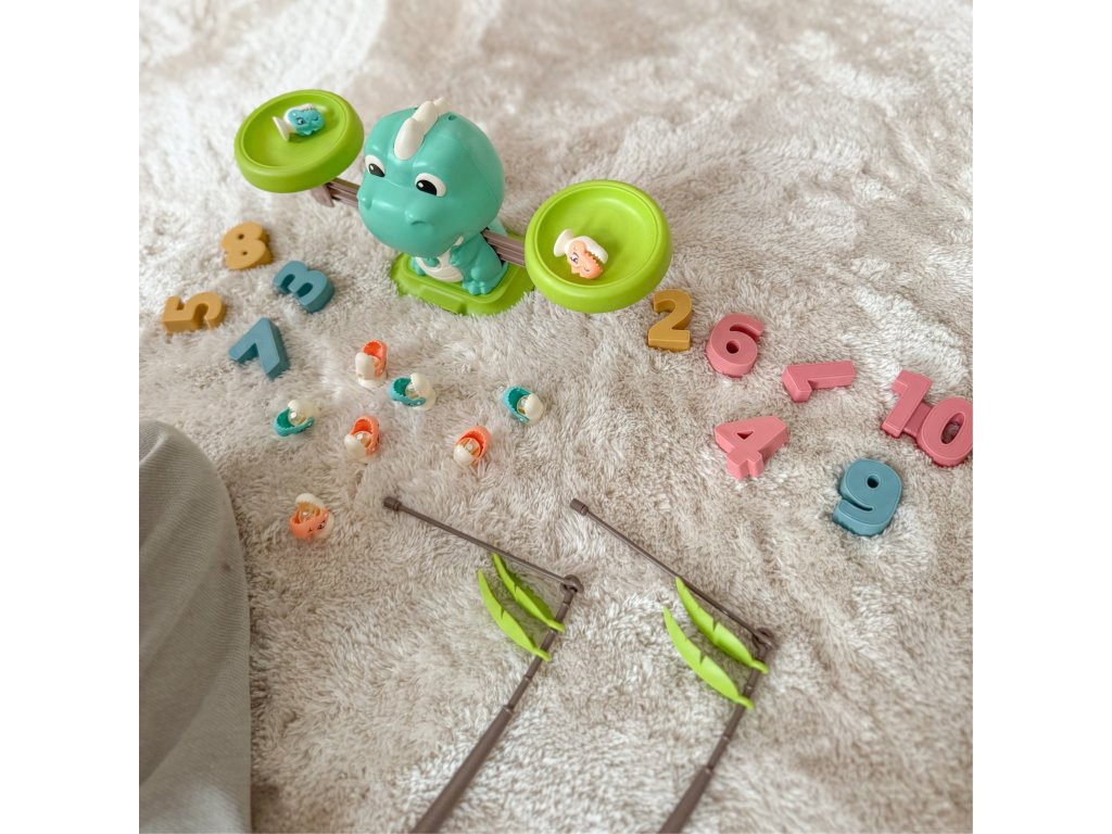 Dinosaurus s kladinou od značkyWOOPIEpodporí poznávanie sveta, čísel a matematických operácií, s prestávkou na lov dinosaurov!. Veľký dinosaurus je umiestnený na stojane, kde sa môžeme hrať so šupinami. Za dinosaurom sa nachádza priestor na rybárske prúty, na ktoré môžete pripevniť listy zo súpravy.V súprave je 10 závaží, jedna váha zodpovedá jednému zvieraťu v súbore, t. j. váha 1 zodpovedá jednému dinosaurovi, váha 2 zodpovedá dvom dinosaurom atď. Okrem toho nájdete ajkarty s akciami a odpoveďami. Táto hračka dokonalestimuluje predstavivosťpodporuje tvorivé a nekonvenčné myslenie, rozvíja manuálne zručnosti tých najmenších a je zábavná.