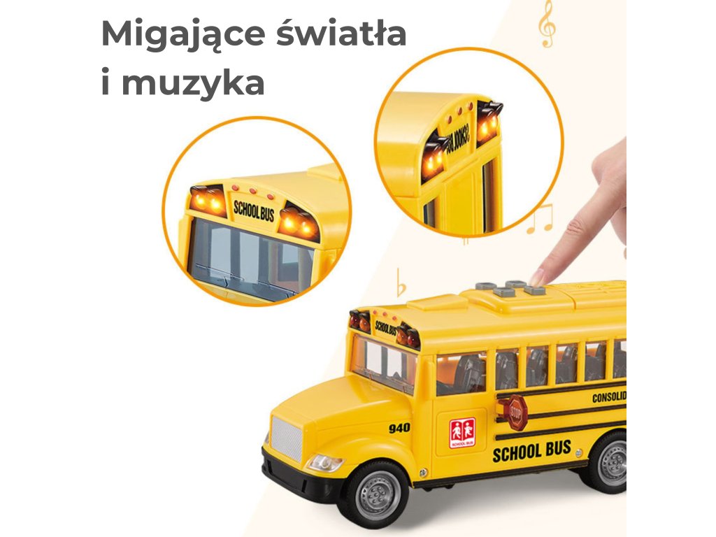 Vezmite svoje dieťa na fascinujúcu cestu do školy s týmto realistickým interaktívnym školským autobusom! Hračka školský autobus od WOOPIE je ideálny pre milovníkov malých áut a mestskej dopravy.Realistické detaily, zvuky, svetlá amožnosť otvárania dverí poskytnúť veľa zábavy a podpory rozvoj predstavivosti dieťa. Vozidlo má mnoho zabudovaných funkcií, ktoré vás nenechajú nudiť sa. Obsahuje rôzne zvukové efekty, predné svetlá a otváracie predné a zadné dvere. Hračka má štyri gumené kolesá a trecí pohon. Stačí ju tlačiť dopredu alebo dozadu a sama prejde aj niekoľko metrov.
