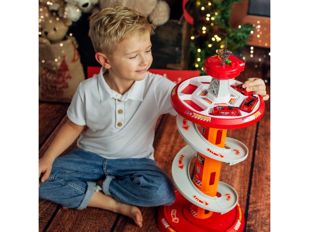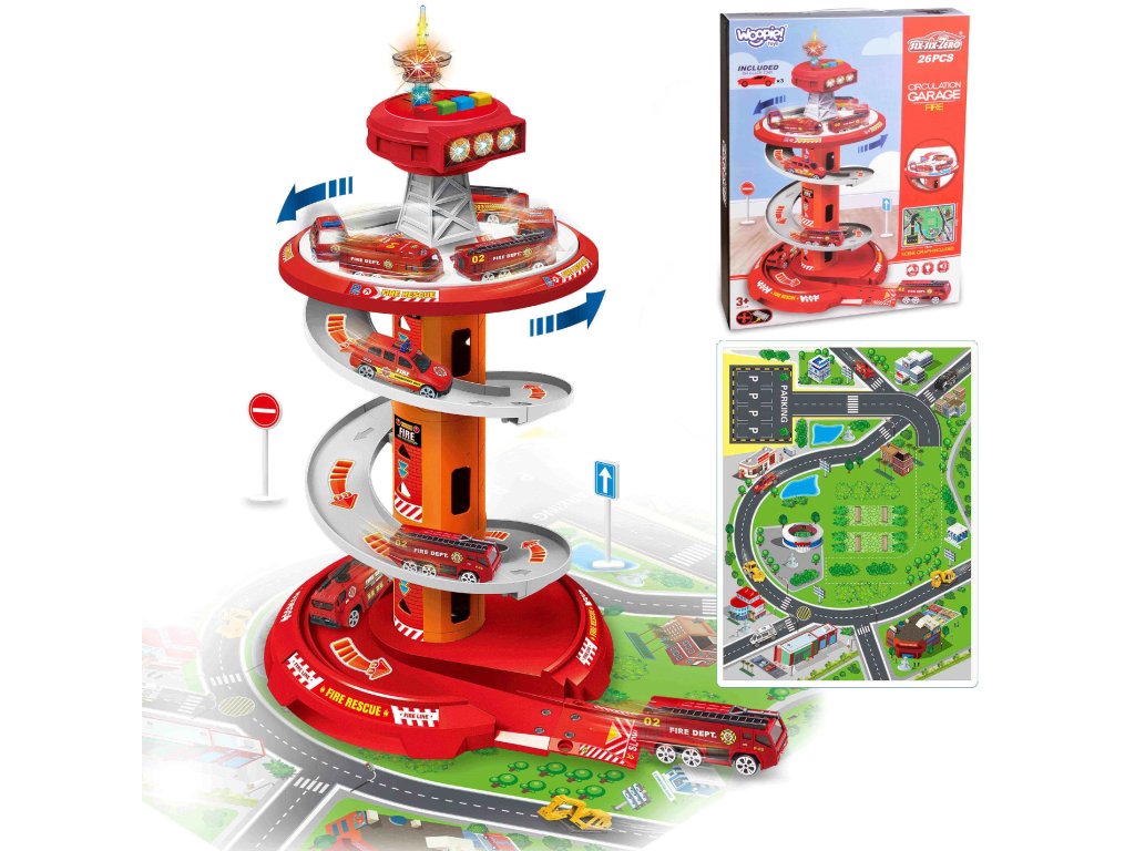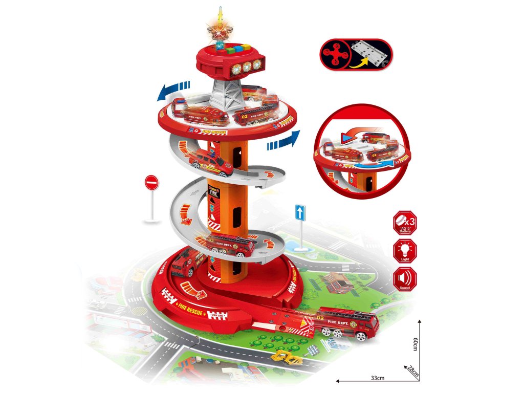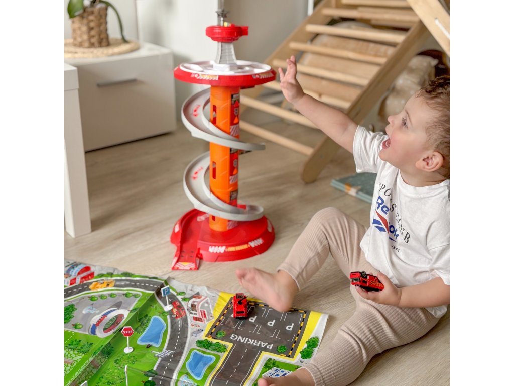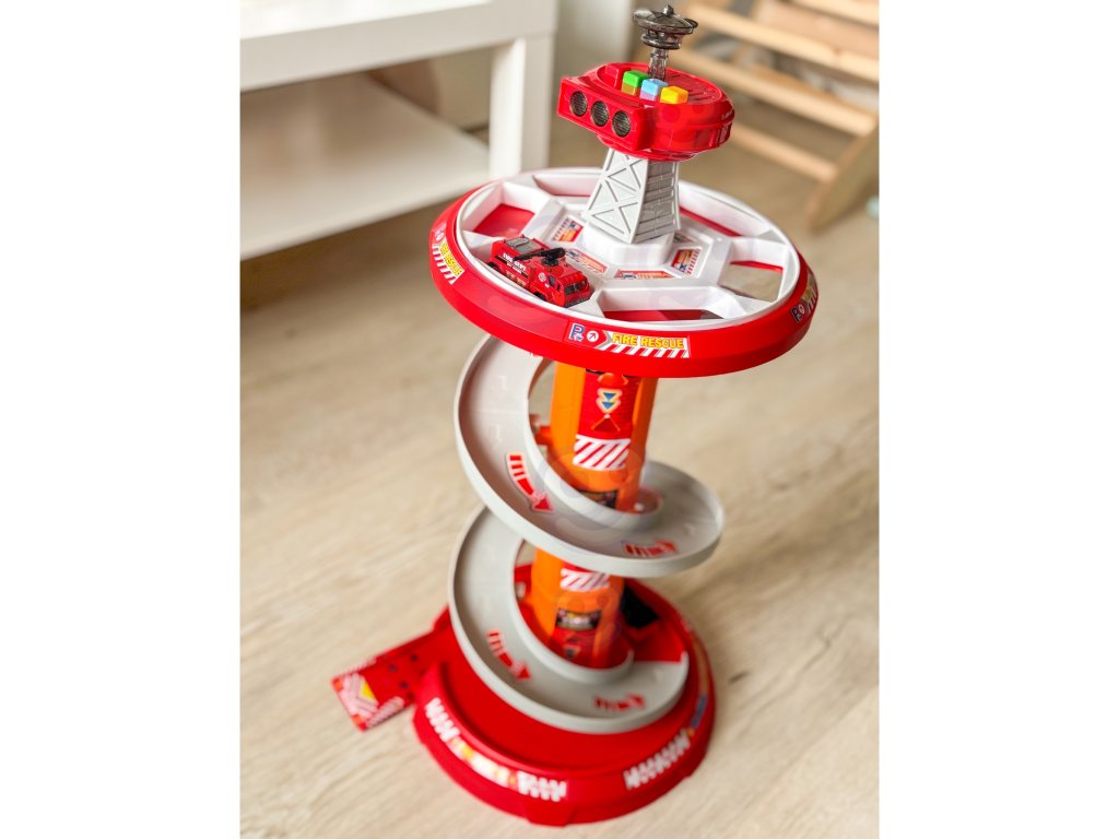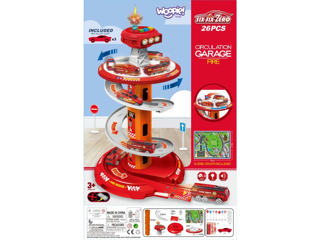 Senzačnéviacpodlažná garáž preHasičský zbor od spoločnostiWoopie určite poteší vaše dieťa. Táto hračka podnieti predstavivosť každého fanúšikauniformované služby ktorá po opustení parkoviska vstupuje dosprievodná cesta.Rýchly zostup automobilu z jednotlivých úrovníumožňuje špeciálny zostup s navíjaním. Okrem toho súprava obsahuje3 rôzne hasičské vozidlá.