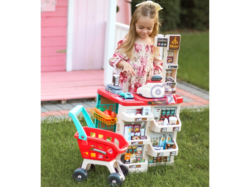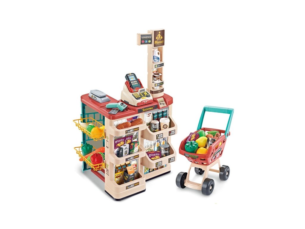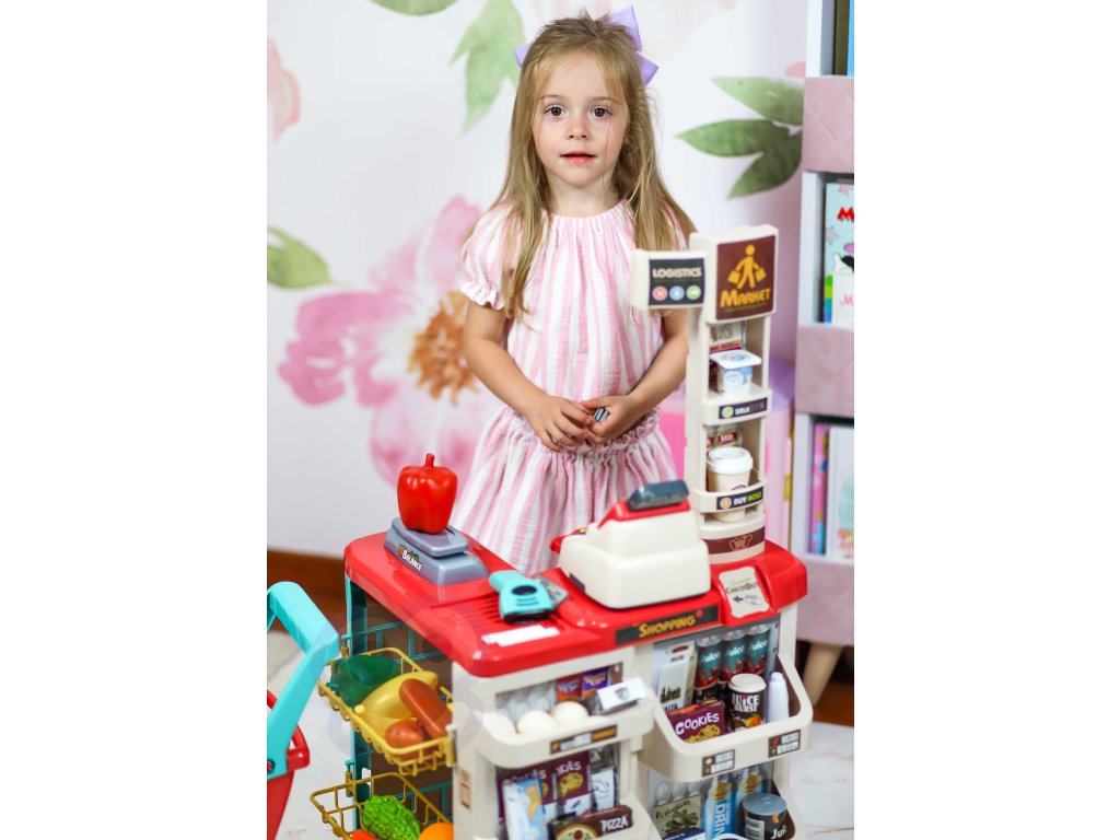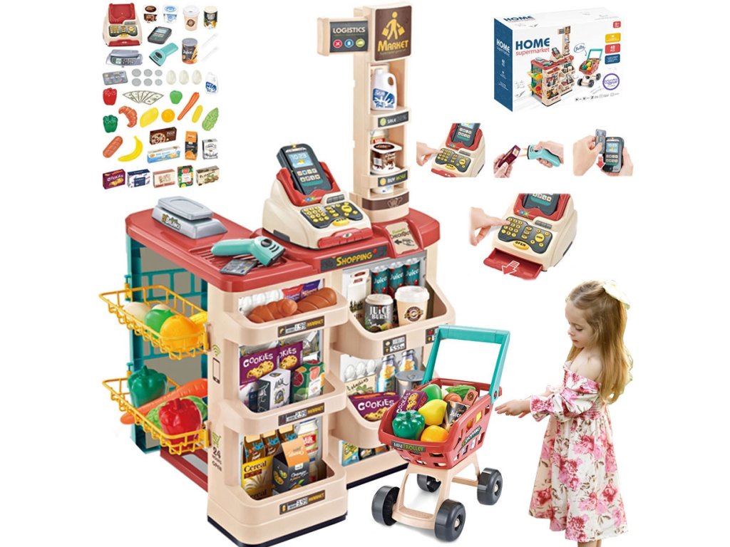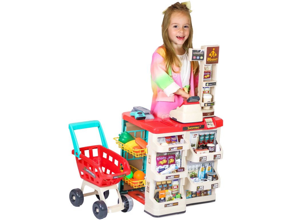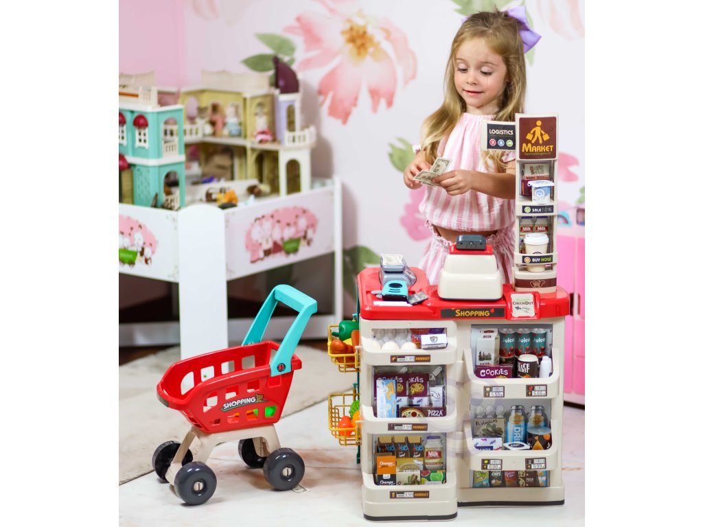 WOOPIE Supermarket Shop s nákupným vozíkom Váha Pokladňa Skener + 48 Akc.