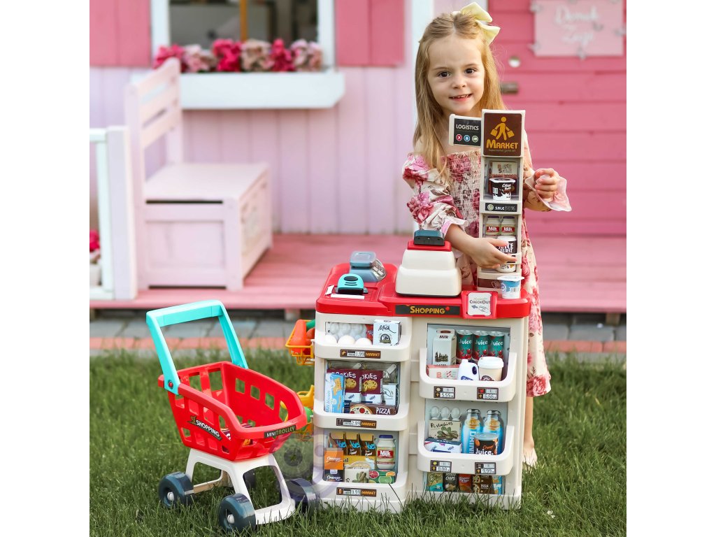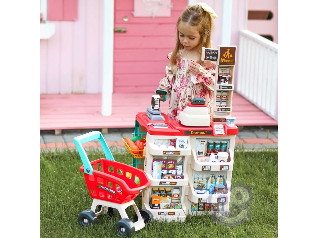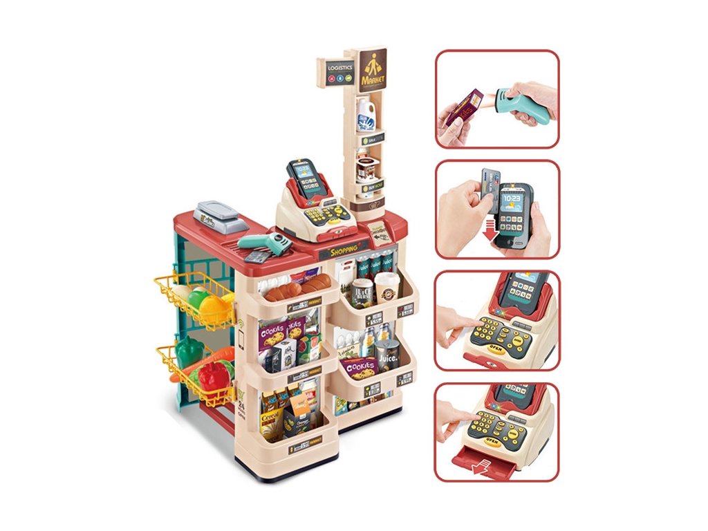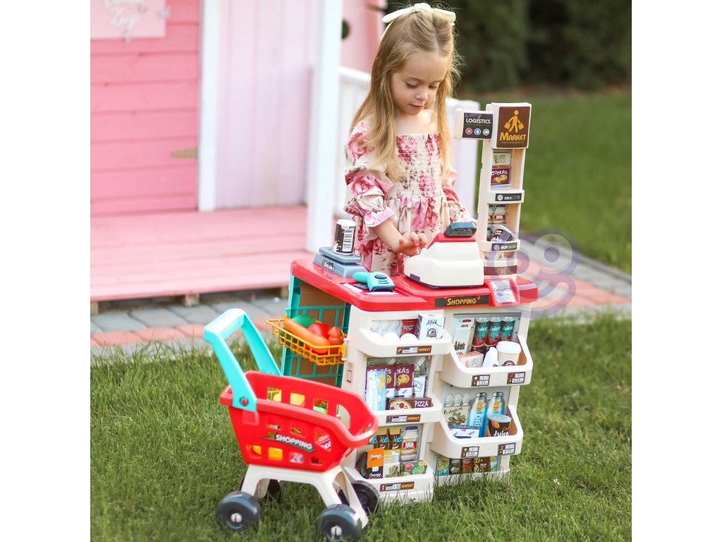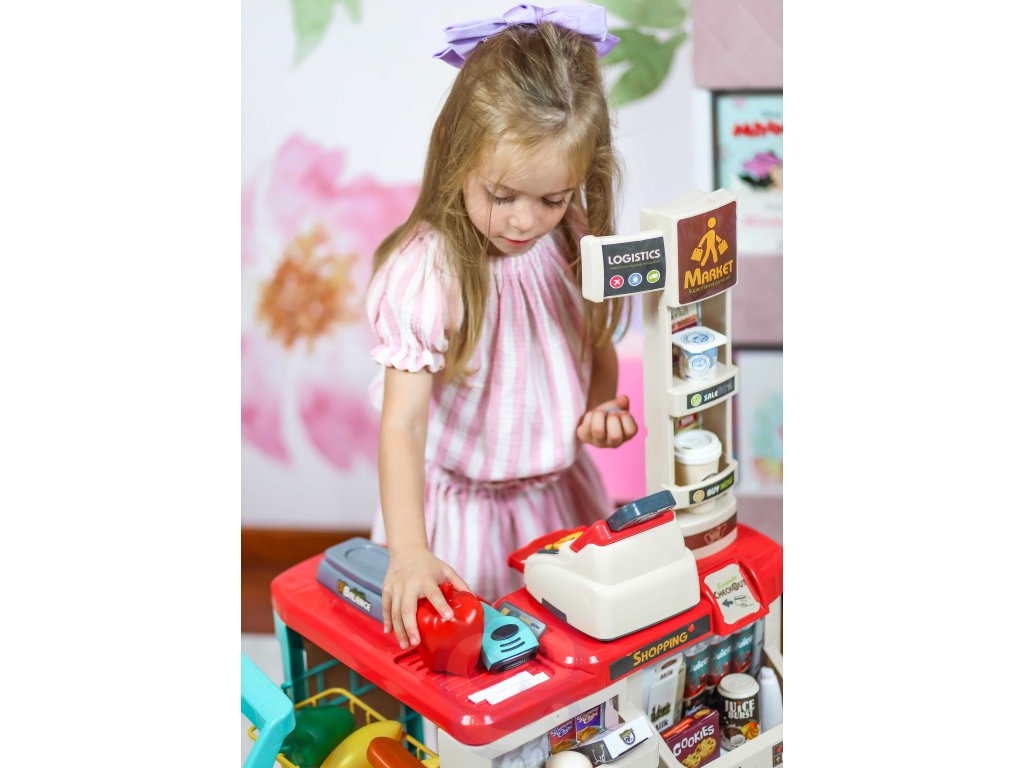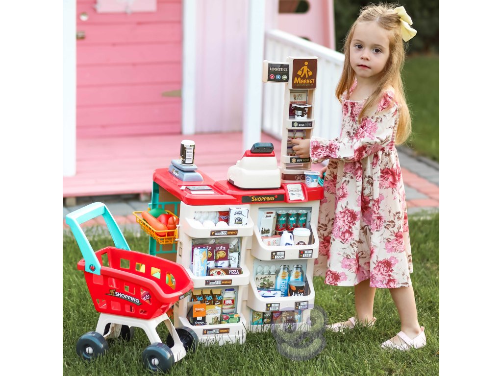 WOOPIE Supermarket Shop s nákupným vozíkom Váha Pokladňa Skener + 48 Akc.